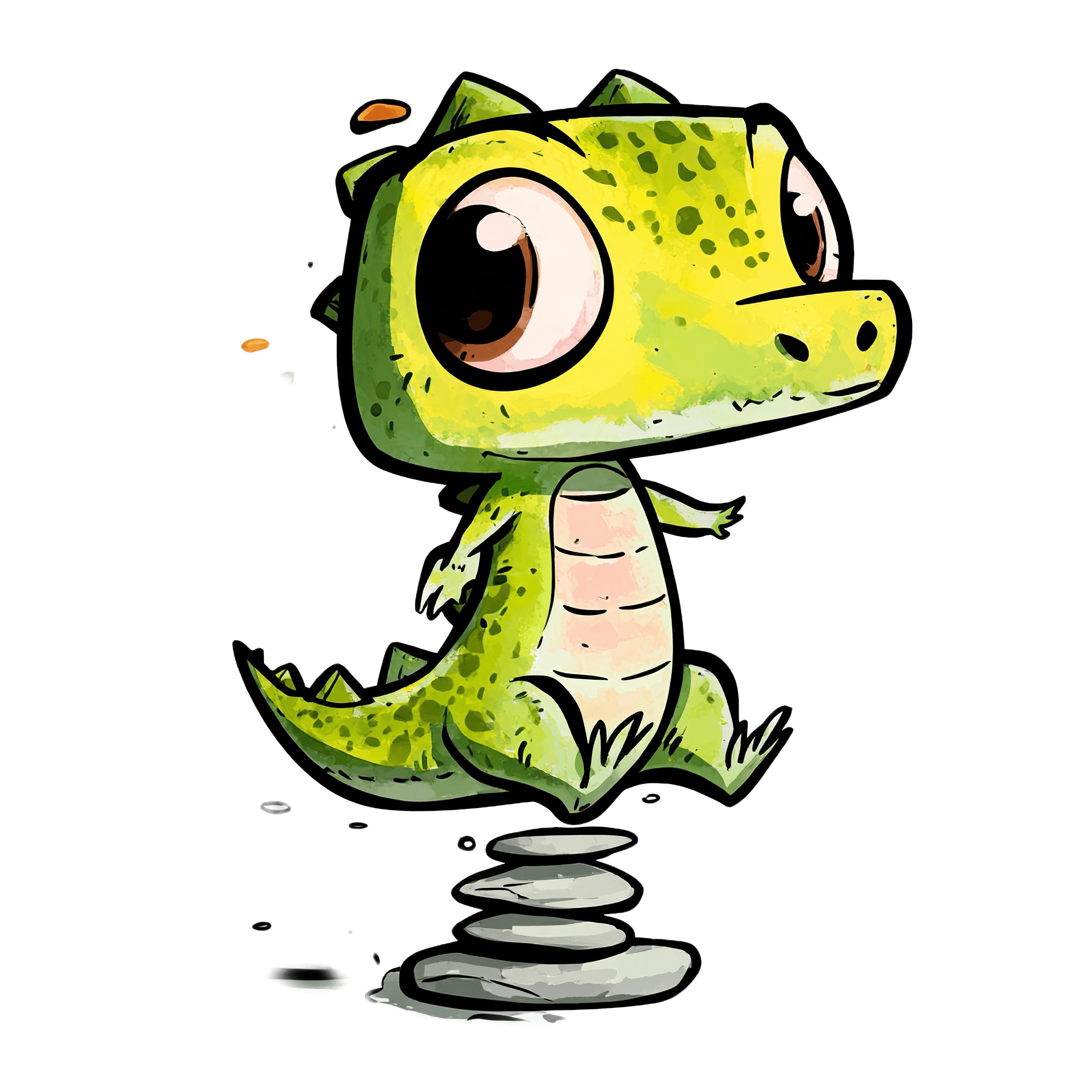 This image depicts a green reptile in a cartoon style, featuring large eyes and a spotted pattern. The reptile is perched on a gray coil spring against a black background, highlighting its playful pose. The digital illustration emphasizes bold outlines and vibrant colors to create a striking visual.
