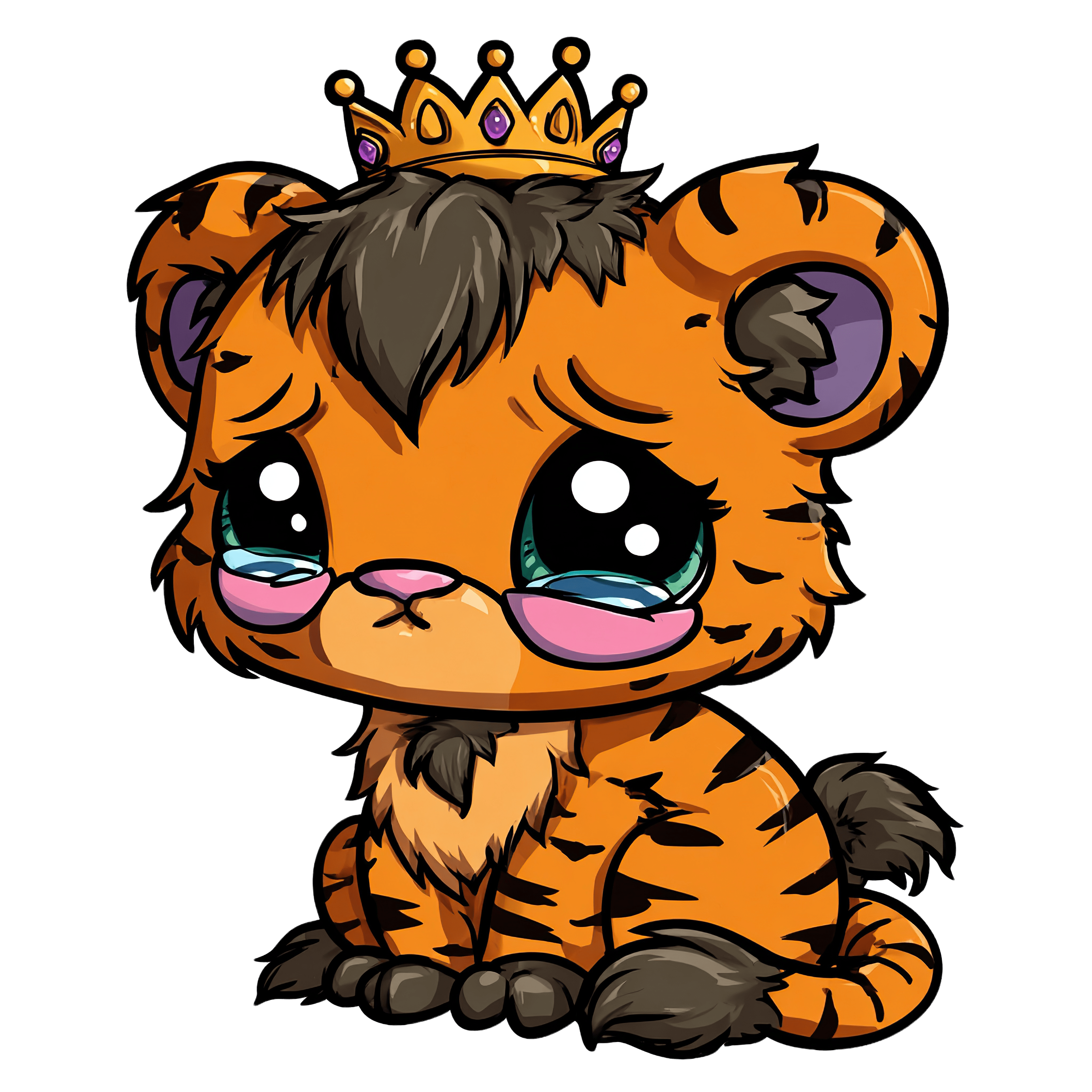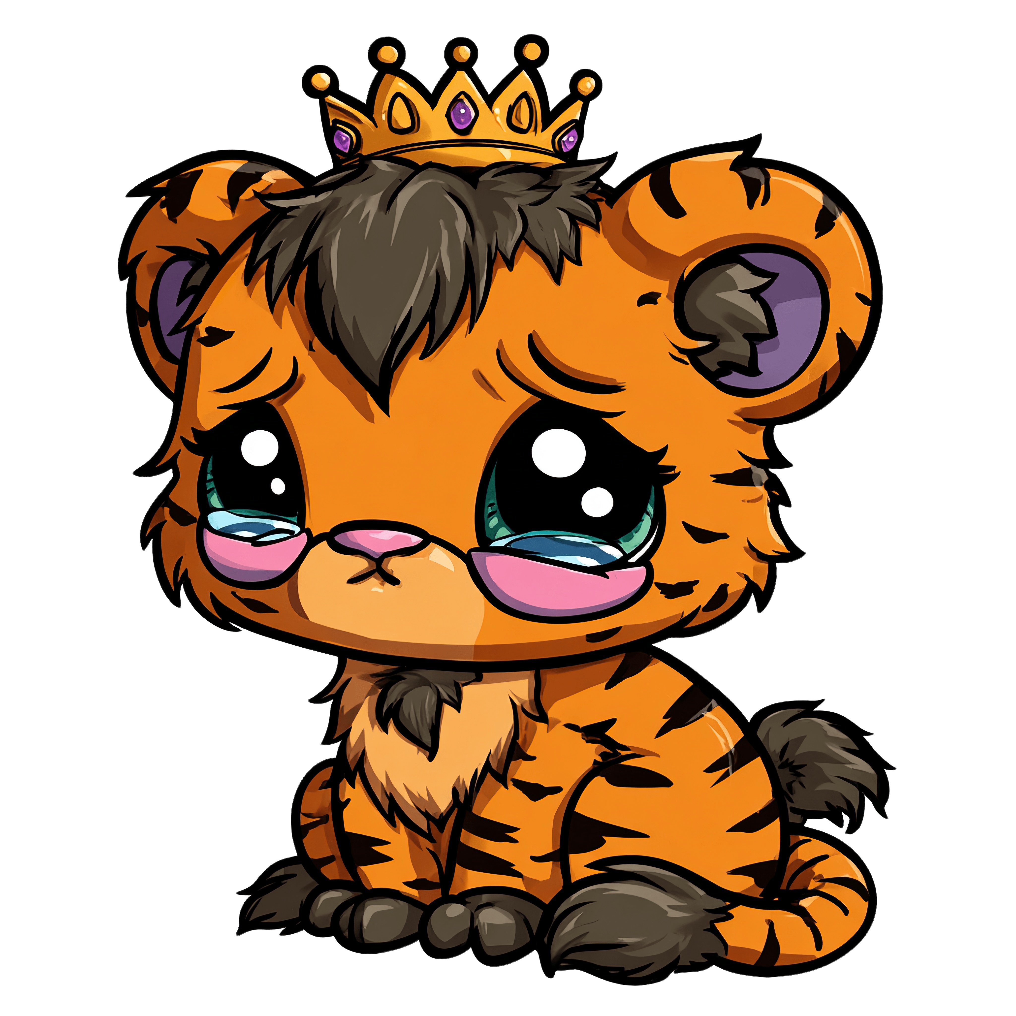 A cartoon tiger cub with a crown on its head. The tiger is illustrated with black stripes, a bushy tail, and a small nose. Its eyes are large and round. The tiger's expression is neutral, and the clipart style has bold outlines and vivid colors, making it suitable for various design projects.