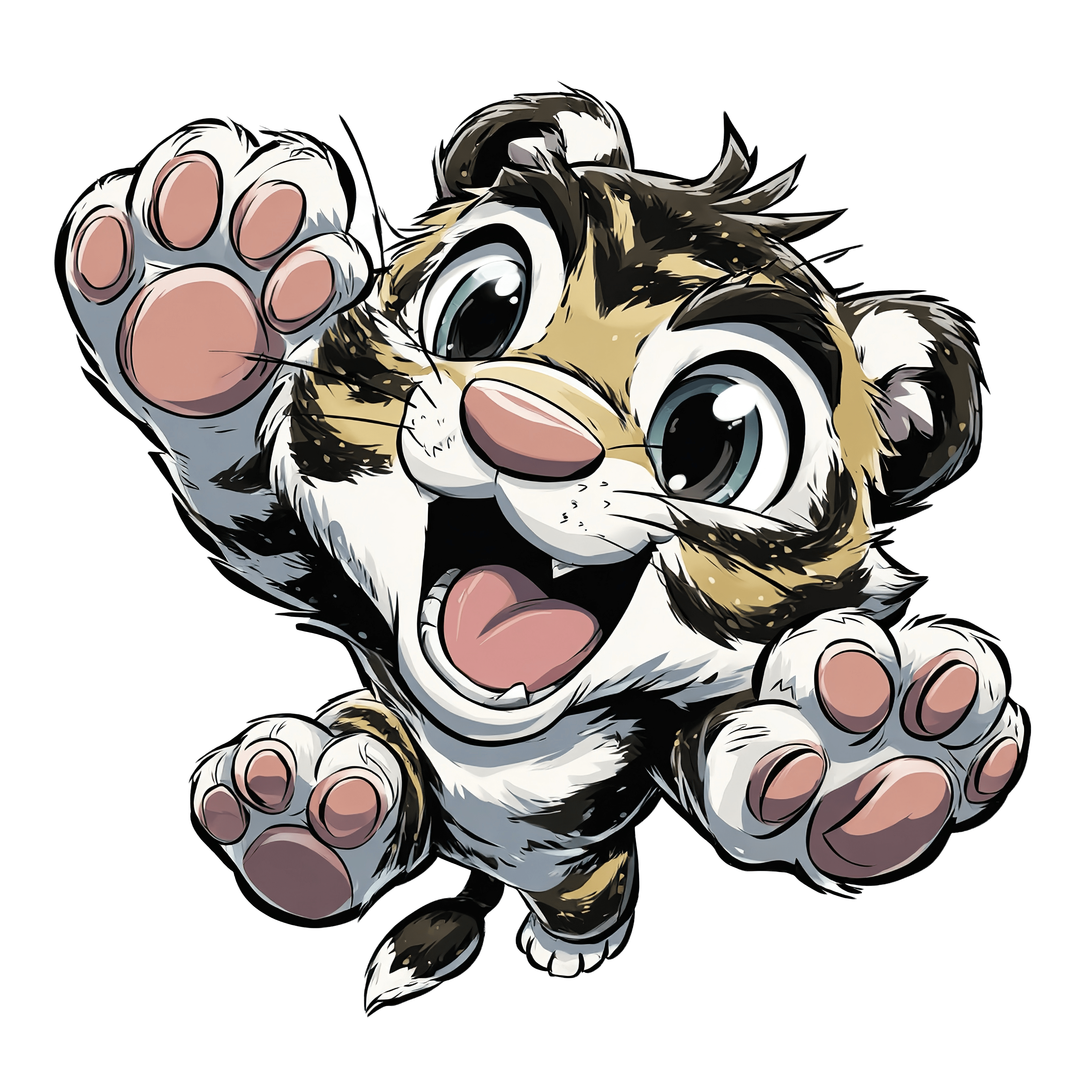 Illustrated image of a cartoon tiger with stripes, leaping forward with paws extended. The tiger shows off large pink paw pads and round eyes. The image is colored in shades of orange, white, and black, highlighting the tiger's features. This vector art is suitable for animal-themed designs, educational resources, and digital projects.