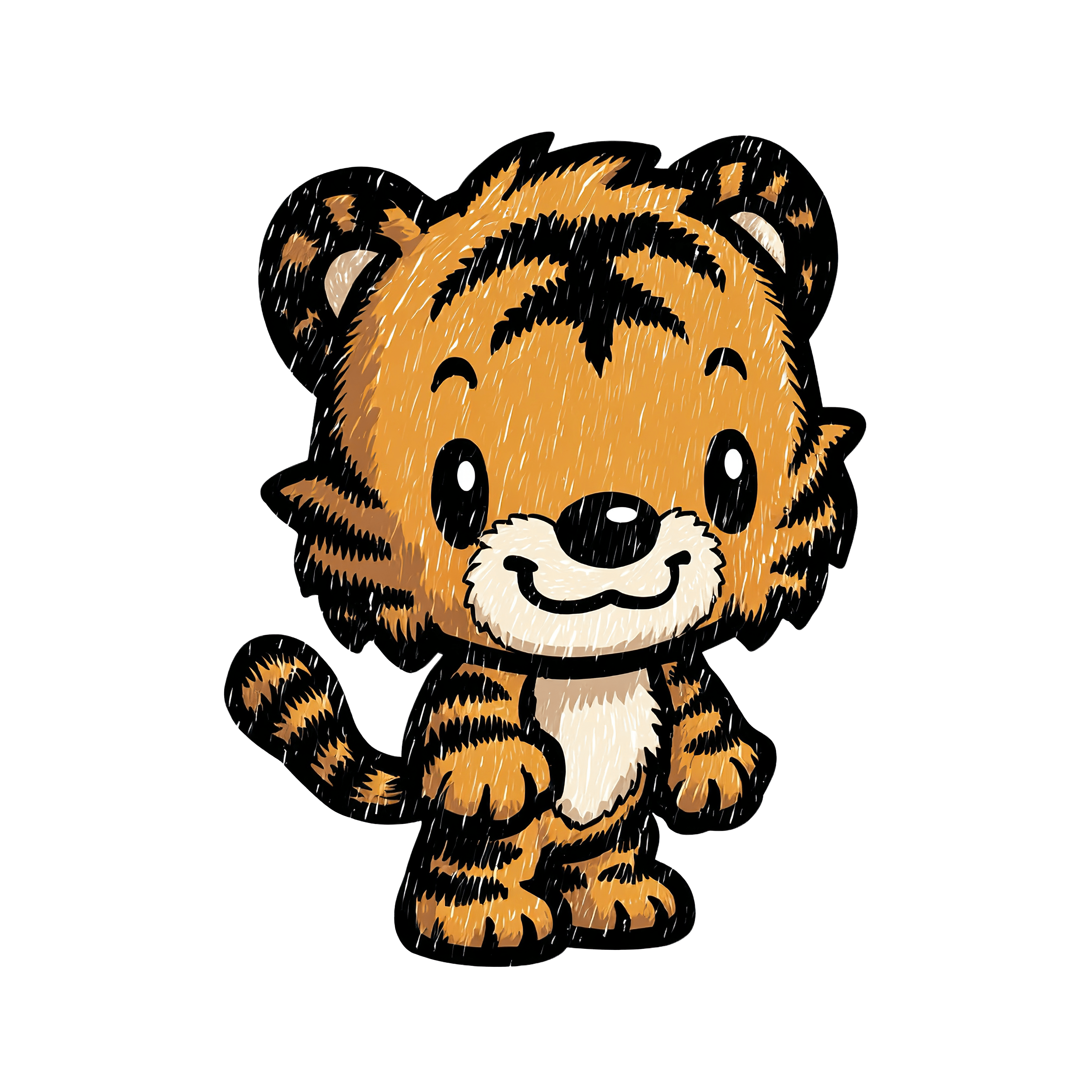 Cartoon tiger design with prominent black stripes and orange fur, white chest, and large, expressive eyes. The tiger stands with small ears and a wide smile, showcasing a simplified, charming style. Its artistic details are outlined in a sketch-like manner, focusing on clear, bold lines and an easy-to-recognize character.
