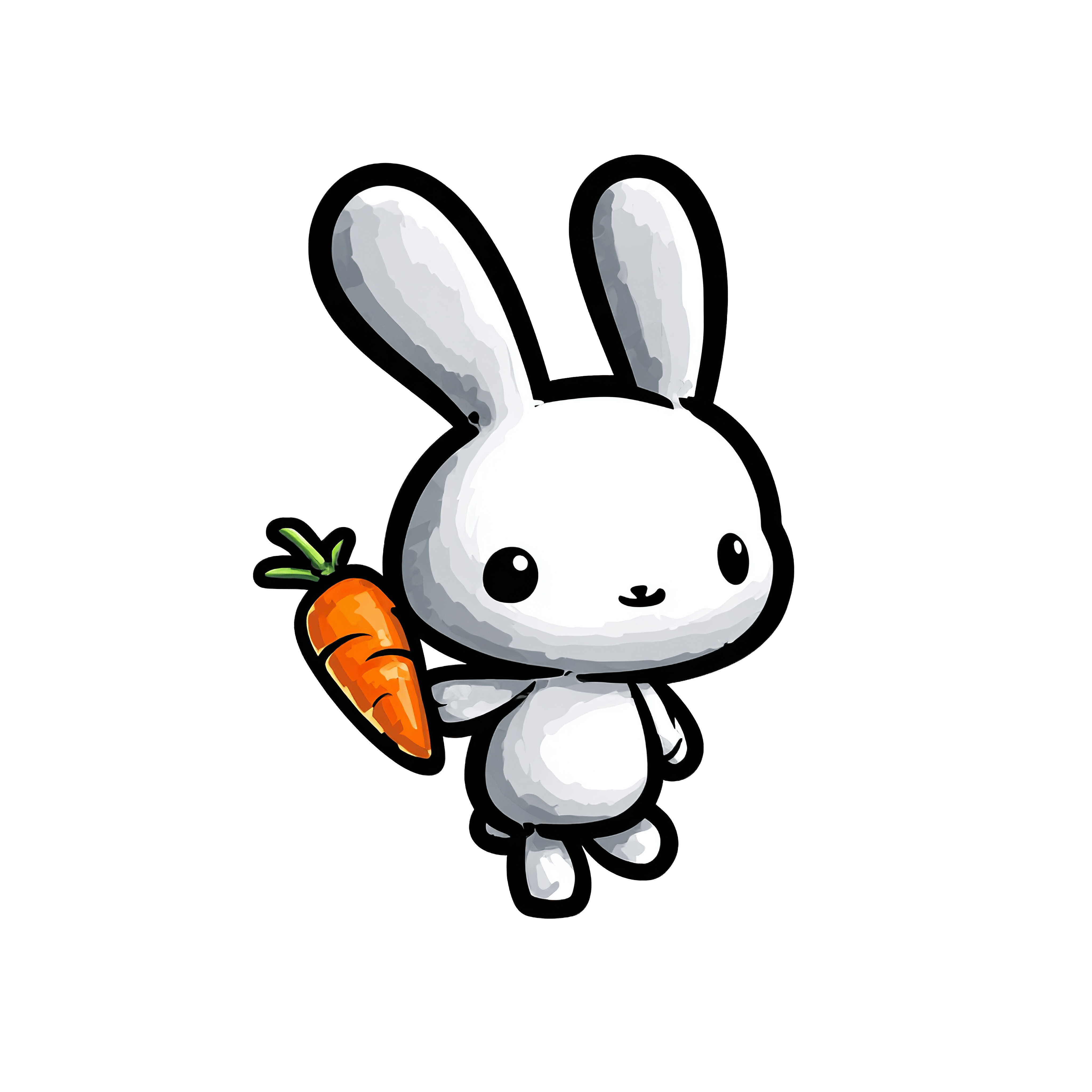 This clipart features a white rabbit rendered in a cartoon style, holding an orange carrot. The rabbit is depicted standing upright with long ears and a simplistic facial expression. The black background accentuates the rabbit's white fur and the bright color of the carrot. It is ideal for use in projects needing a rabbit or animal theme.