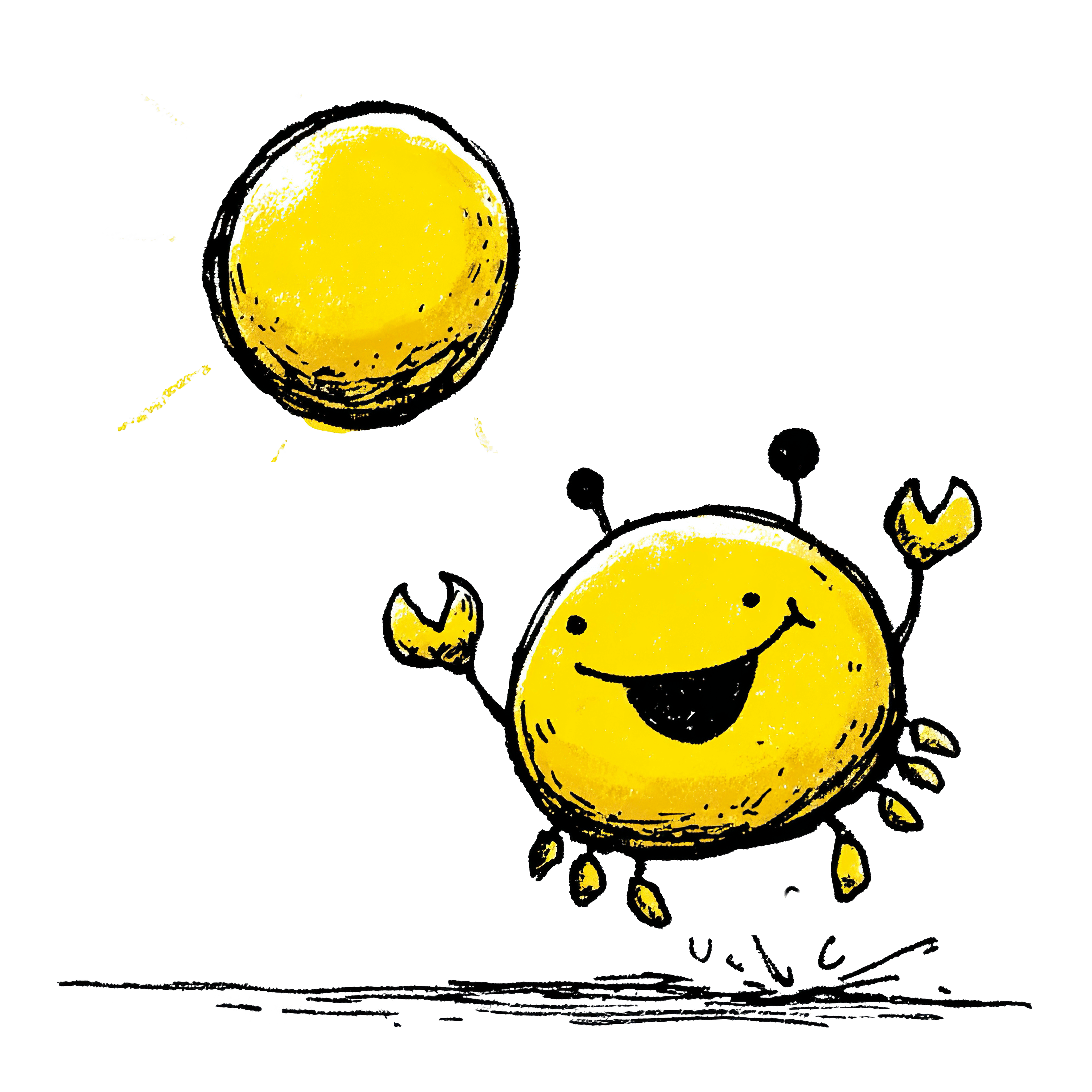 This colorful clipart features a cartoon-style yellow crab with claws raised, set against a black background. Above the crab is a hand-drawn, bright round sun. The illustration uses bold black outlines and a sketchy style, making it suitable for cheerful design projects. The simple composition focuses on the interaction between the crab and the sun, emphasizing nature themes.