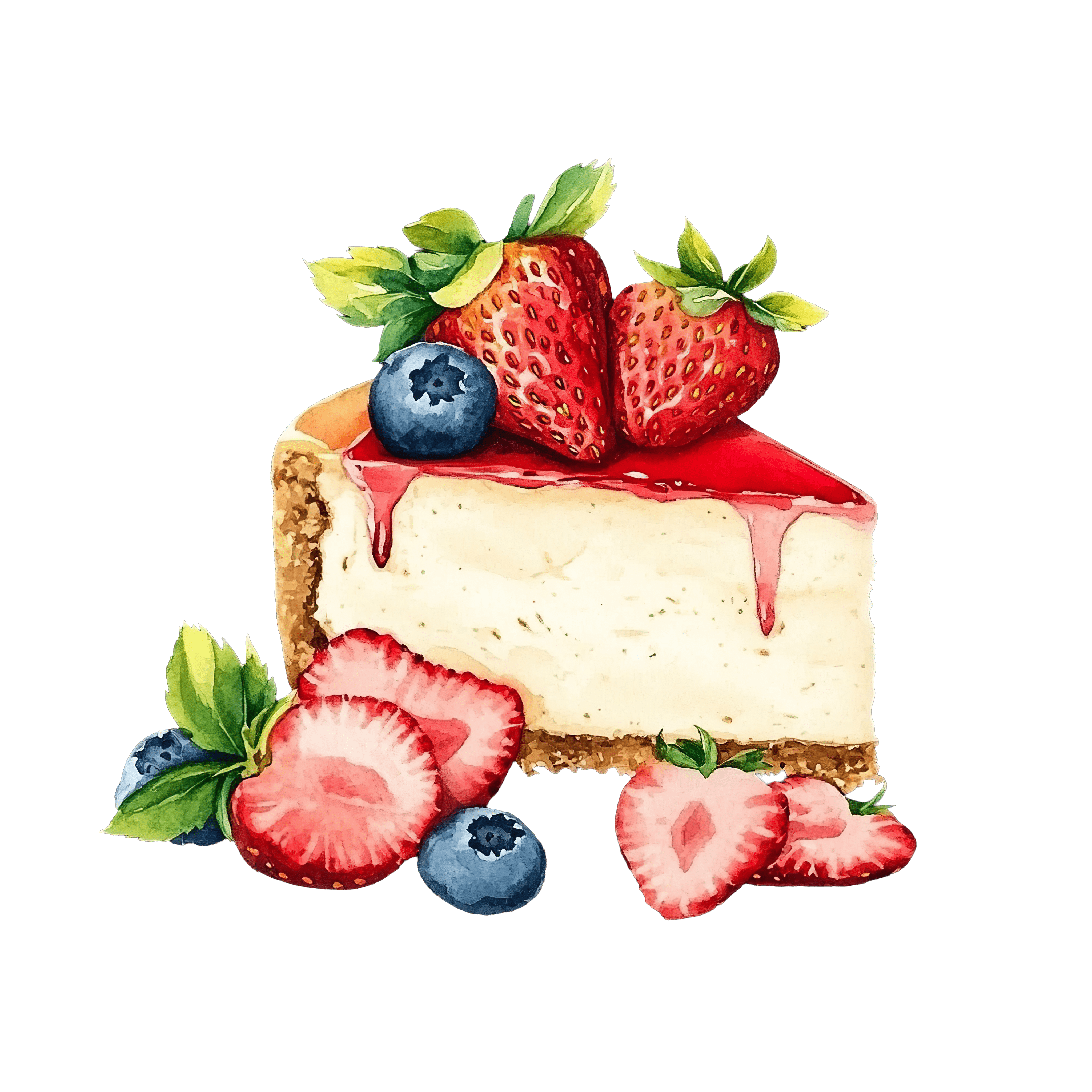 Cheesecake Slice Topped with Fresh Strawberries and Blueberries Cheesecake slice garnished with strawberries and blueberries on top.Download PNG ▼Download JPG ▼Related posts:Illustration of Woman with Curly Hair and Red ScarfCartoon squirrel with a large fluffy tailOrnate Gingerbread Cookie with Red and Green Icing DetailsWatercolor Celery Stalks with Lush Green Leaves vegetable clipart food vector artHops Plant with Green Leaves and Pink ConesRed Poinsettia with Green Leaves and White Flowers IllustrationIntricate Watercolor Design of Leaves in Green and Red HuesOrange monkey with spiky fur clipartOtter clipart with antlers and festive ornamentsFestive Candles with Pinecones and Holly for Seasonal DecorGreen Grapes and Leaf Vector ArtRed Christmas Ornament with White Decorative Floral Design