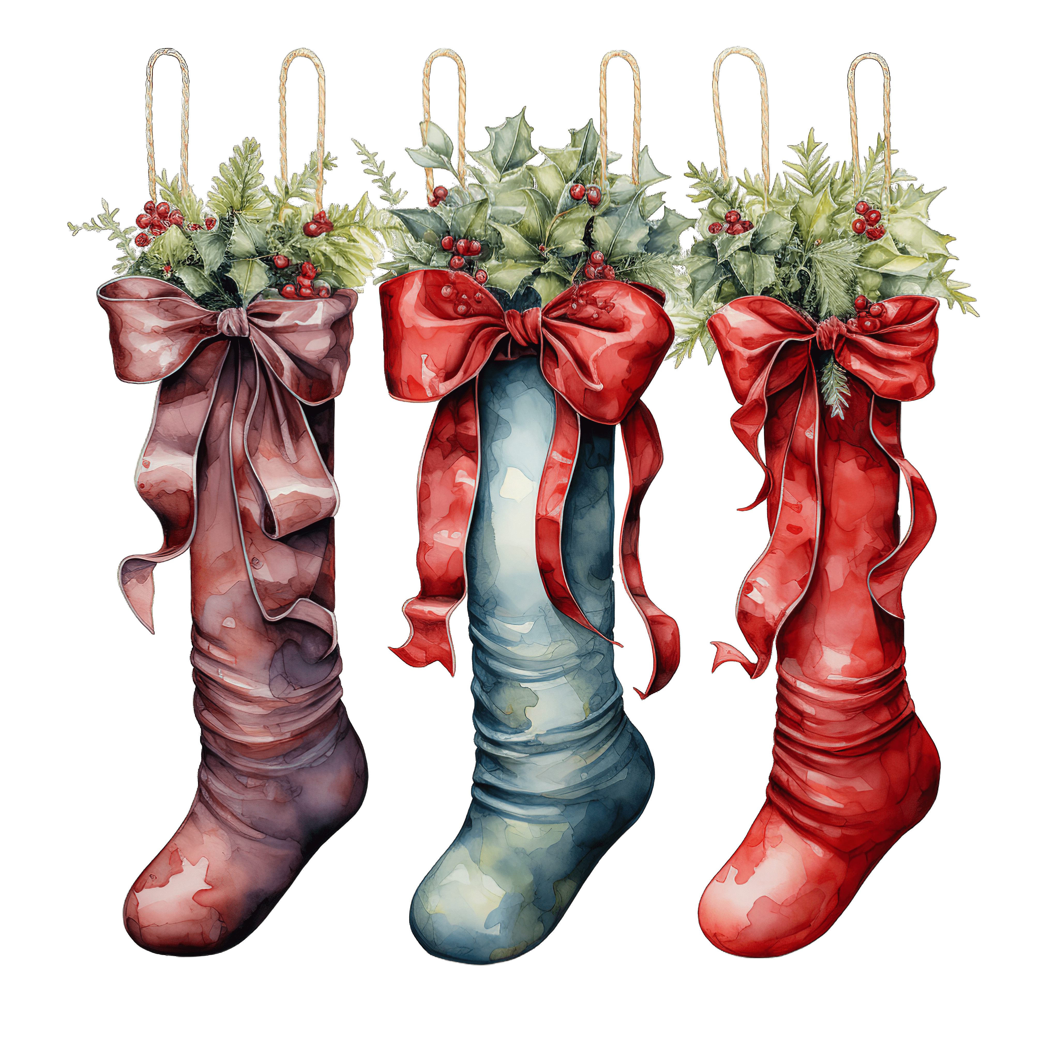 Christmas Stockings with Festive Holly and Ribbon Decoration Christmas stockings adorned with holly leaves and vibrant red ribbons.Download PNG ▼Download JPG ▼Related posts:Three Yellow Apples with Green Leaves in Watercolor StyleBundt Cake with Icing Drizzle on Top ViewRed Onion Bulb with Detailed Striped TextureRed Metal Bells with Loop on Dark Background Vector ArtHedgehog Holding a Red Apple Clipart IllustrationWatercolor Butterfly Illustration With Orange And Black PatternsWooden Garden Arbor with Blooming Pink Climbing RosesWoman with Curly Hair Wearing Red Outfit and ScarfWhite Magnolia Flower with Green Leaves in Watercolor StyleHighland Cow Wearing Red Striped Santa Hat IllustrationOtter perched on a shiny red ball illustrationWatercolor Acorn Squash with Halved and Whole Pieces