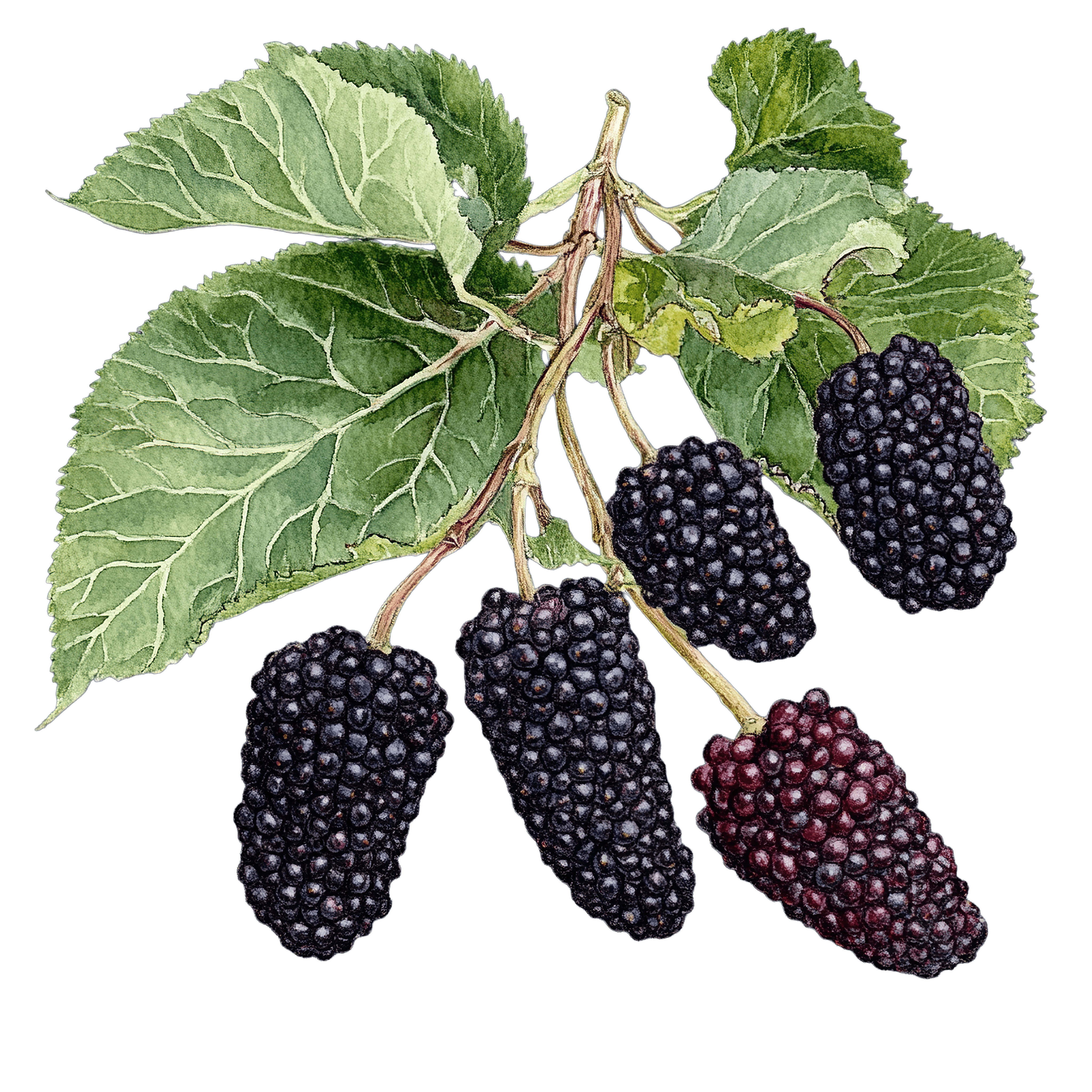 Cluster of Ripe Mulberries with Green Leaves Mulberries hanging from a branch with vibrant green leaves.Download PNG ▼Download JPG ▼Related posts:Blue Butterfly With Radiant Glowing WingsThree Clusters of White Currants with Green LeavesBanana Smoothie in Glass with Fresh Banana SlicesFresh Apricots with Leaves and Halved Fruit DisplayTall glass of iced tea with lemon and mint garnishColorful Christmas String Lights in Watercolor StyleSquirrel in Santa Hat Clipart IllustrationDetailed Illustration Of A Brown And Orange ButterflyChocolate Cake Slice with Cherries on Top dessert food sweet vector artBiscotti Cookies with Almonds in Watercolor Style food snack dessert clipart vectorTall Glass of Pink Grapefruit Juice with Ice and SliceCartoon White Rabbit Holding an Orange Carrot Clipart