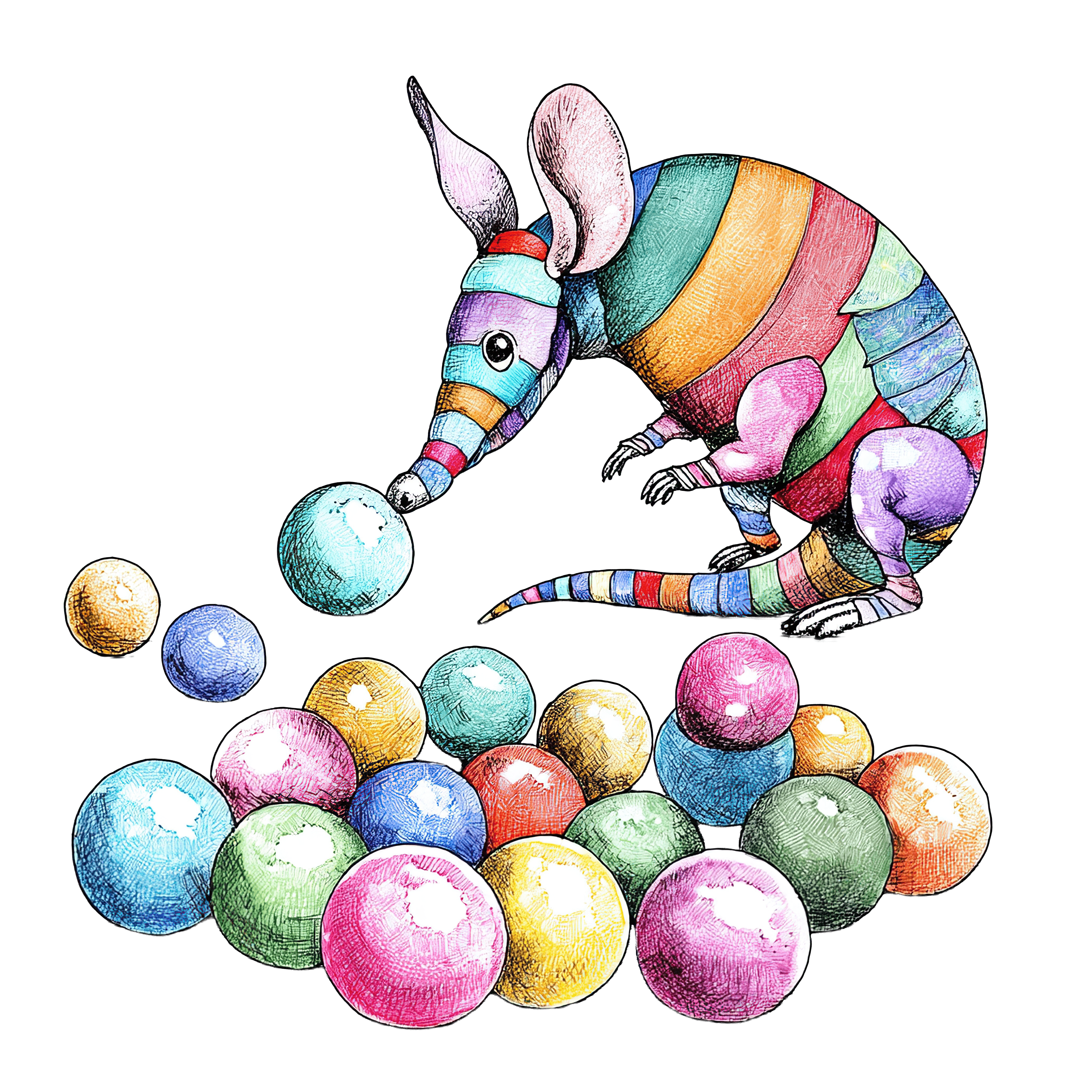 This vibrant illustration showcases a whimsical armadillo adorned with multicolored stripes, set against a bold black background. The playful creature is surrounded by a variety of colorful spheres, creating a lively and imaginative scene. The intricate design and rich colors add a touch of fantasy.