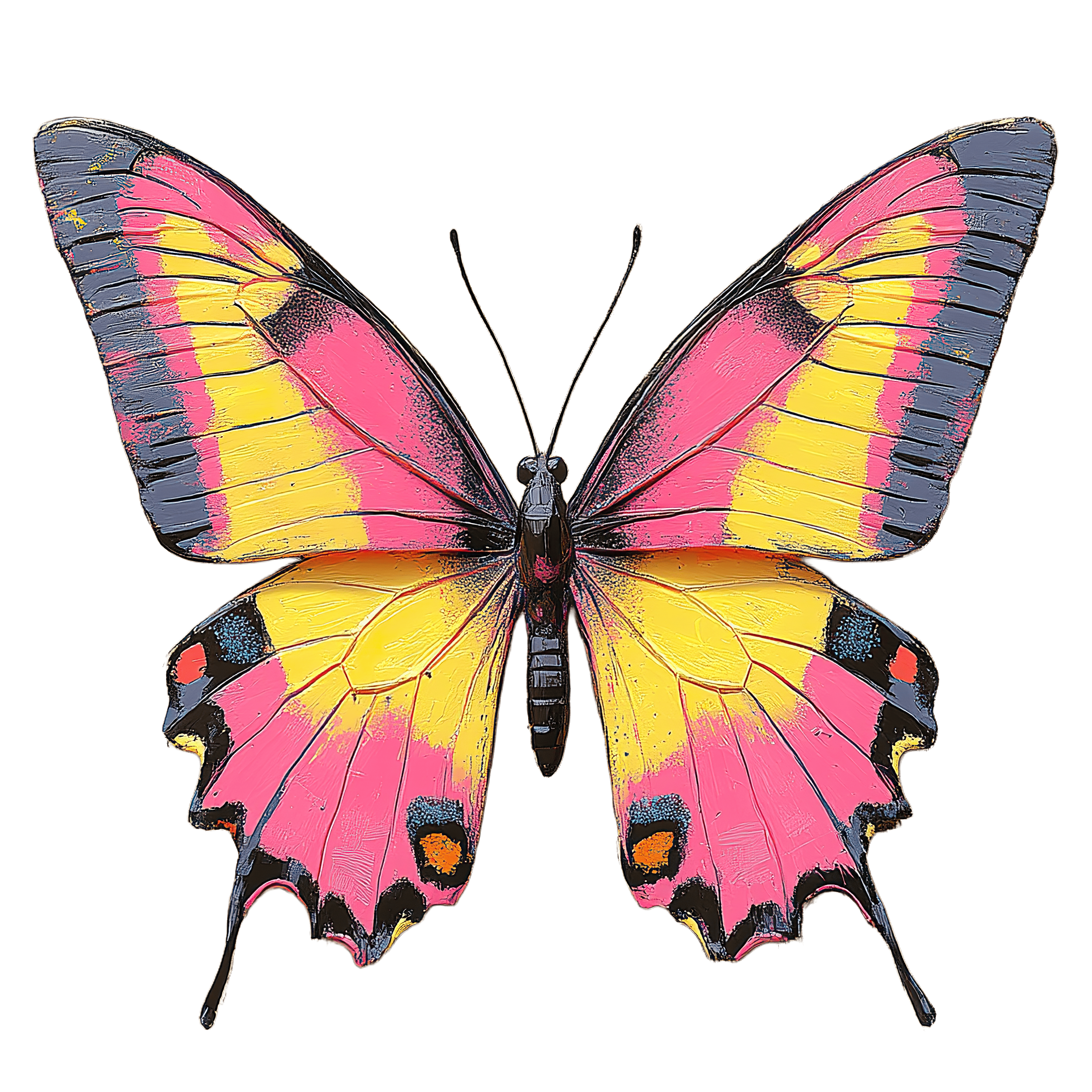 Colorful Butterfly With Pink And Yellow Wing Patterns Butterfly features striking pink and yellow wings with black accents.Download PNG ▼Download JPG ▼Related posts:Pavlova Dessert Topped with Fresh Berries and Mint LeavesDeer with Colorful Antlers Surrounded by Lush Floral ArrangementFig Tart with Sliced Fresh Figs on TopPowdered Sugar-Dusted Raisin Bread Slices on Black BackgroundVibrant Purple Grapes Cluster ClipartVibrant Watercolor Turnips with Fresh Green Leaves ArtSliced Yellow Bananas in Watercolor Style Clipart fruit food vector art printableCartoon giraffe with long neck in clipart styleVividly Illustrated Butterfly With Brightly Colored WingsBotanical Art of Celeriac Root and LeavesWhite Rabbit On GrassChocolate Glazed Cake with a Slice Removed glaze dessert food sweet baked