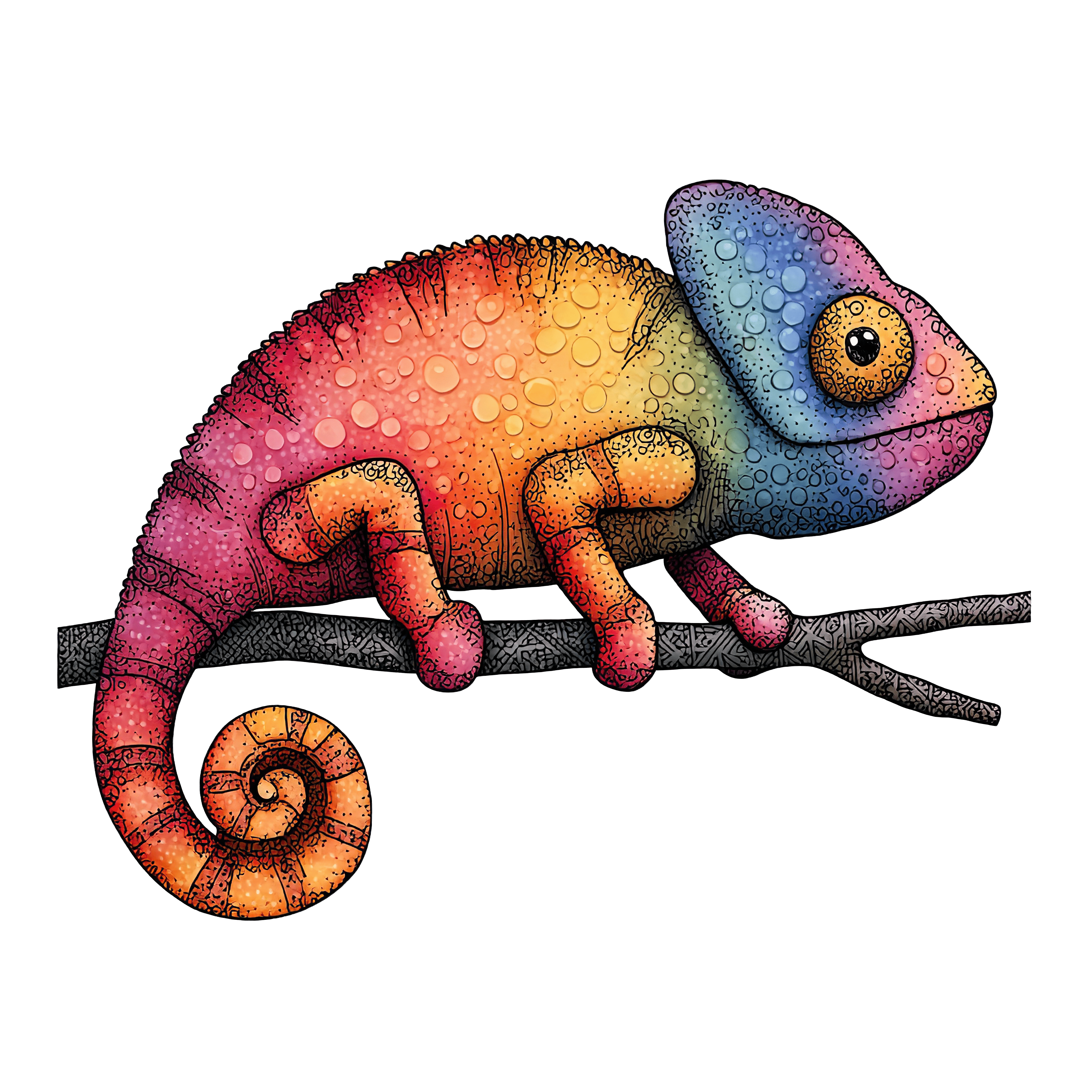A digitally illustrated chameleon with a vibrant gradient of colors ranging from blue to red, sitting on a branch. The texture includes bubble-like patterns across the body, adding depth and interest to the image. Suitable for educational materials, decorative projects, and animal-themed designs.