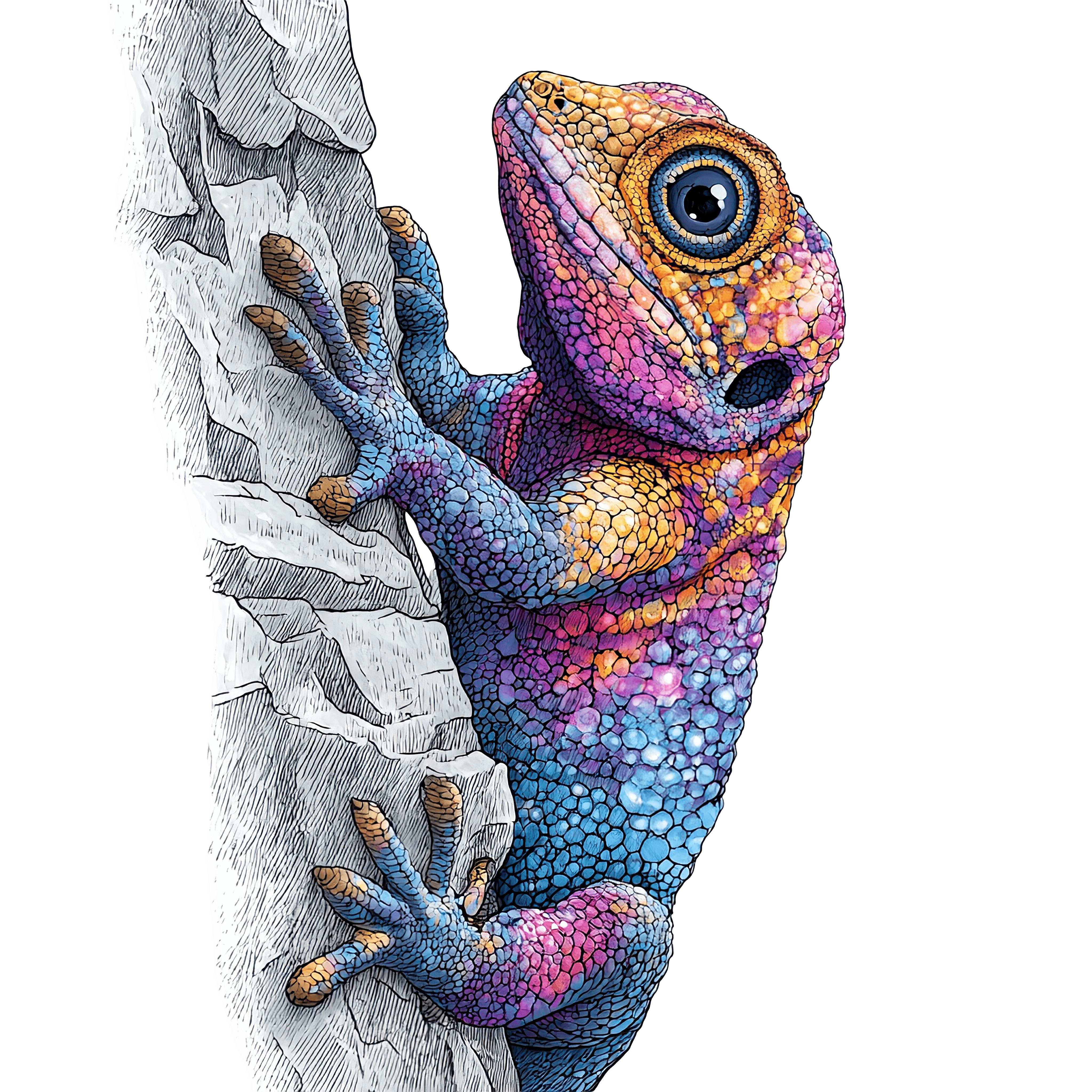 Illustration of a vibrantly colored gecko with detailed scales, climbing up a textured tree. The gecko features a mix of blue, purple, and orange hues, showcasing intricate artistry. Its large eye is a focal point, enhancing the detailed depiction. The tree is rendered in a monochrome style, providing contrast to the vividly colored gecko. This artwork highlights the unique textures and vivid patterns found in nature, captured with a high level of detail.