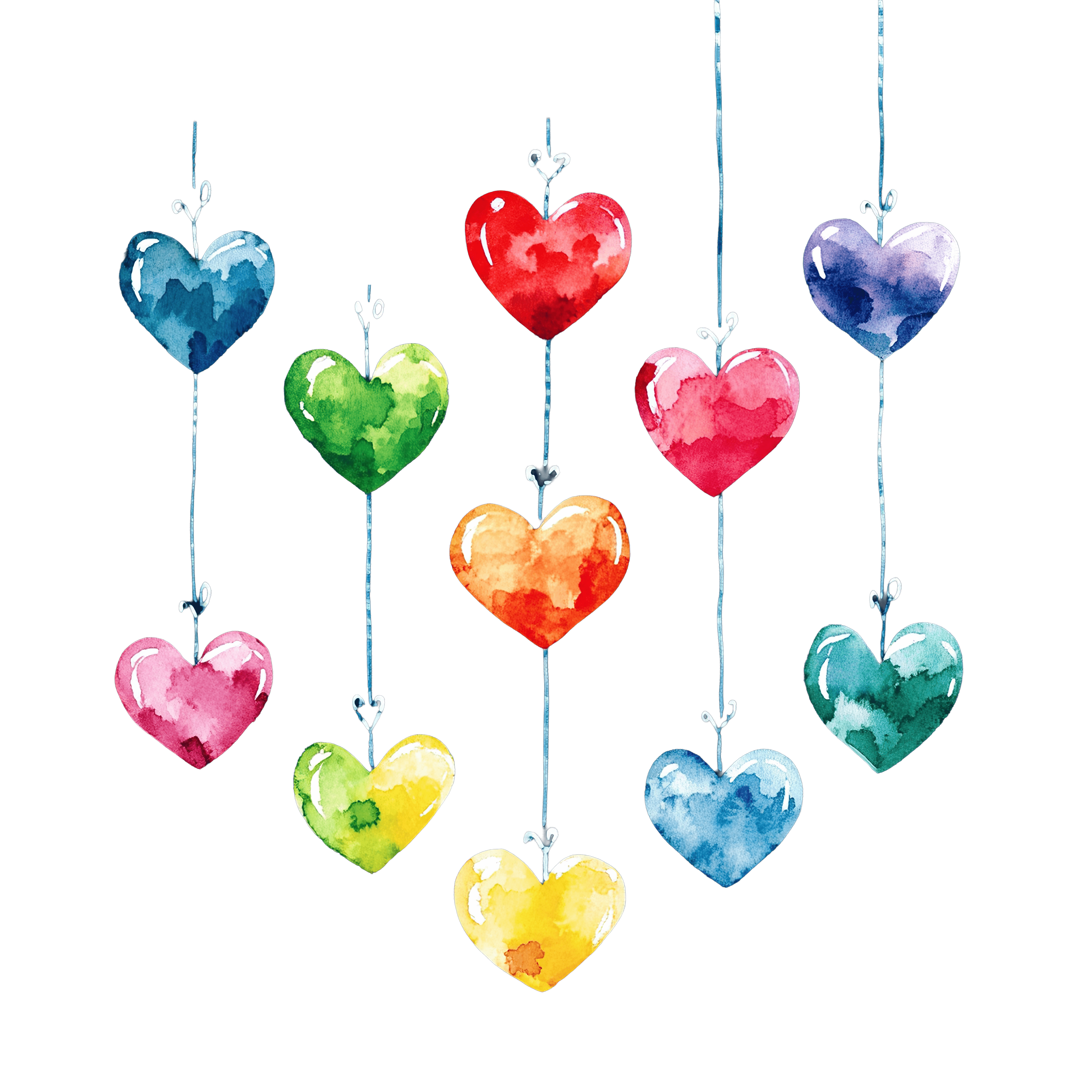 Colorful Heart Watercolor Clipart Hanging on Strings Vivid multicolored watercolor hearts hanging from strings on a black setting.Download PNG ▼Download JPG ▼Related posts:Chocolate Layer Cake Slice with Raspberries and HazelnutsFestive Christmas Pudding with Blueberries and Holly LeavesHolly Branch with Glossy Leaves and Red Berries IllustrationColorful Butterfly With Sparkling Wings In Detailed IllustrationCartoon Lion in Regal Purple Robe ClipartWhole and Halved Yellow Figs with Detailed TextureFestive Holiday Wreath with Green Leaves and Red BerriesGlass of Iced Coffee with Spoon and Ice CubesWhite Coffee Cup Filled with Dark Brewed CoffeeVivid Orange Carrot Art with Fresh Green FoliageCartoon alien character with large eyes and heart symbolCartoon wolf wearing a large black witch hat