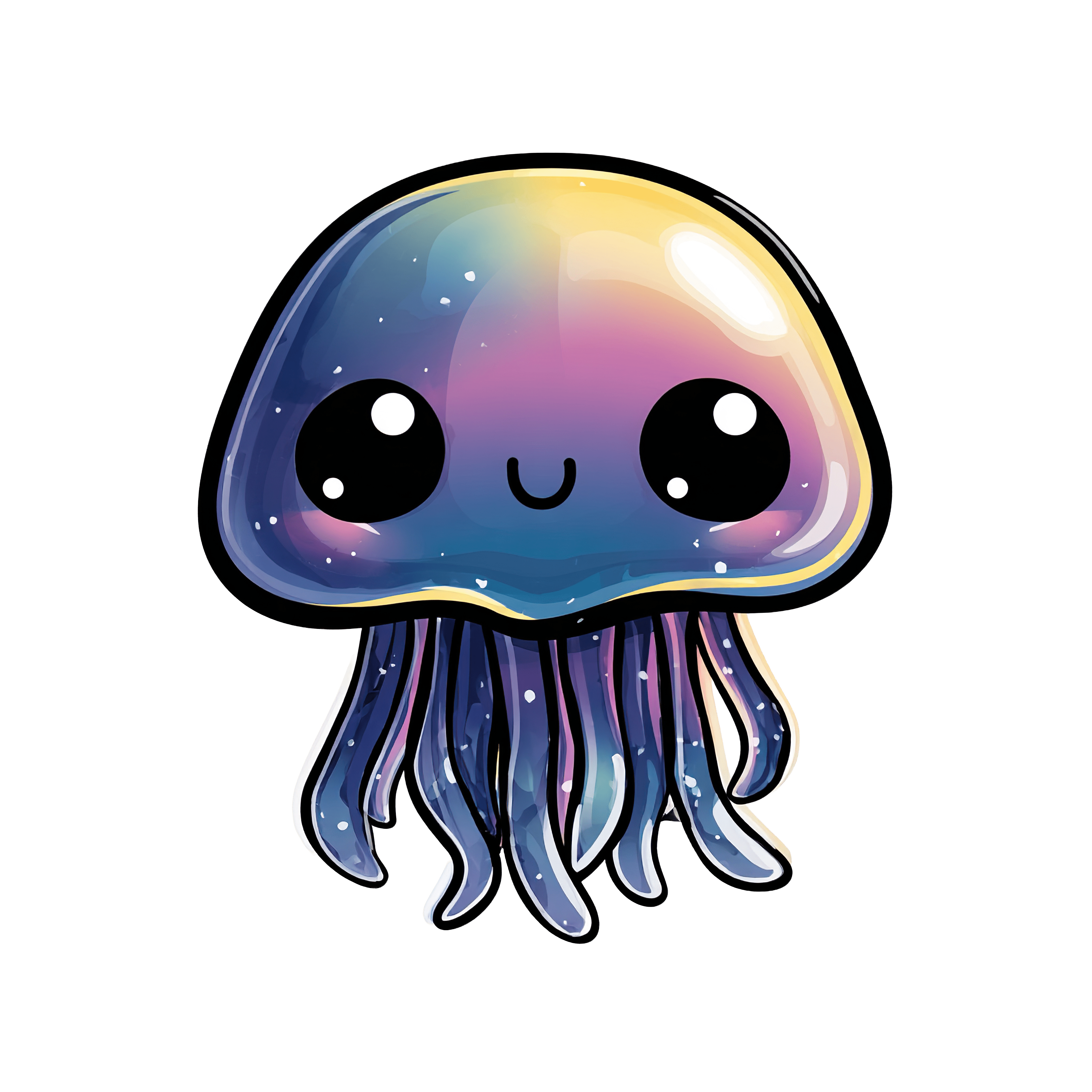 This clipart image features a jellyfish with large eyes and a multicolored gradient. The jellyfish is depicted in a cartoon style with vibrant hues of blue, purple, yellow, and pink. The simple shape and design make it suitable for various creative projects.
