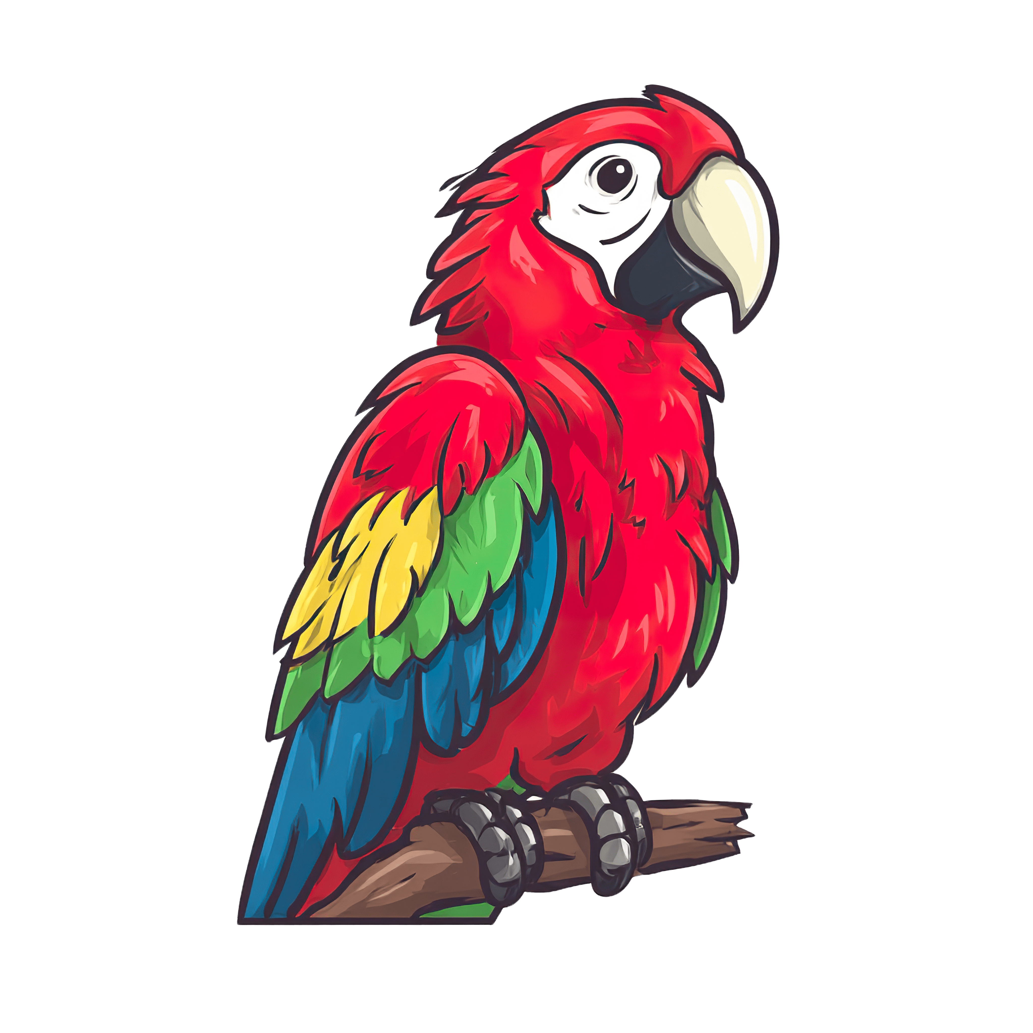 Vibrant macaw parrot with red, blue, green, and yellow feathers perched on a branch. Its detailed illustration highlights a prominent beak and attentive eyes, capturing the bird’s natural elegance. The bold, saturated colors and smooth lines emphasize a lively, yet simple cartoon style. Ideal for educational projects, tropical themes, or animal-related graphics, this vector art enriches any creative design with its striking presence.