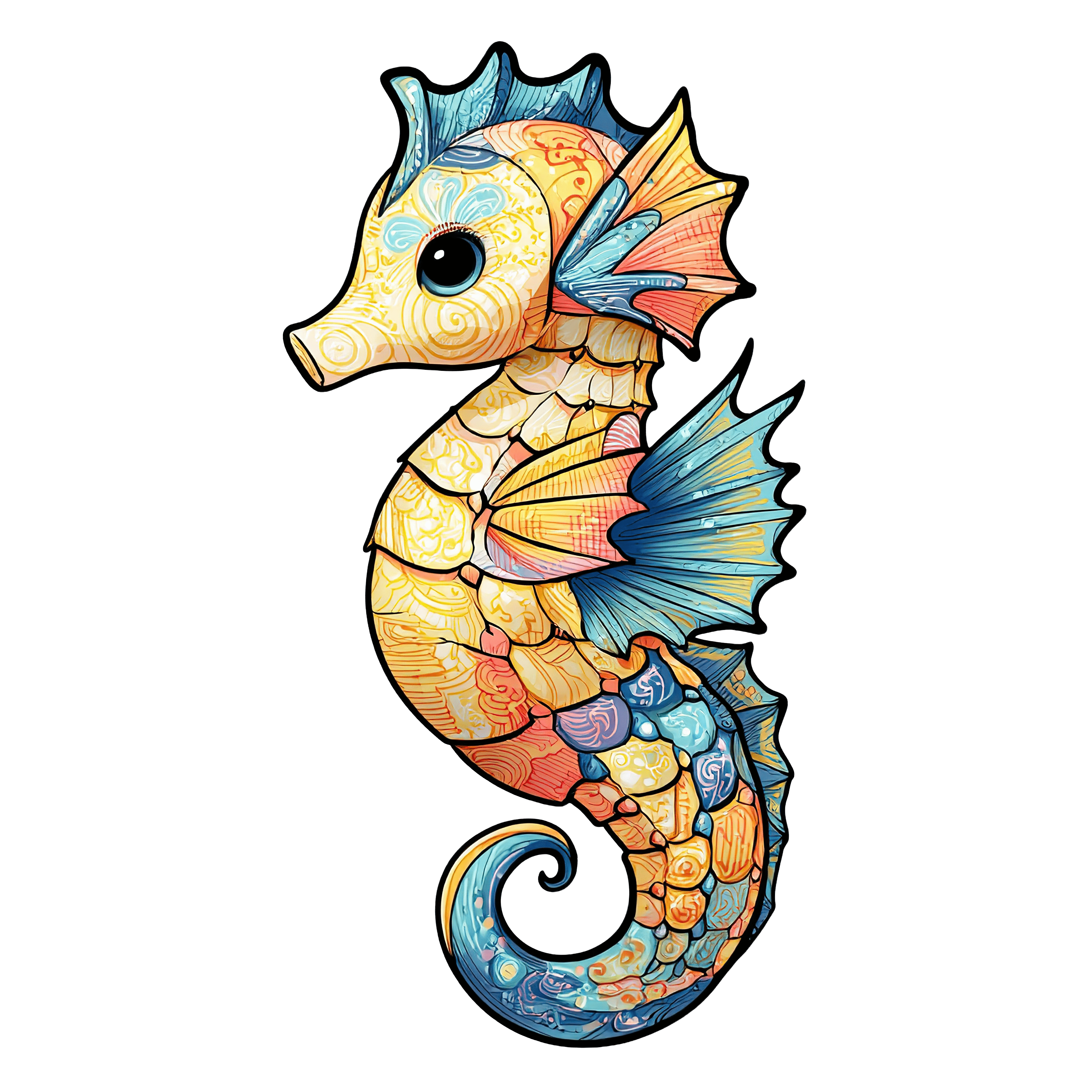 Brightly patterned seahorse with intricate orange, blue, and yellow details. The design showcases swirling scales and elaborate fins, emphasizing the marine creature's distinct shape. The intricate motifs add to the whimsical nature of the depiction, making it ideal for various artistic purposes.