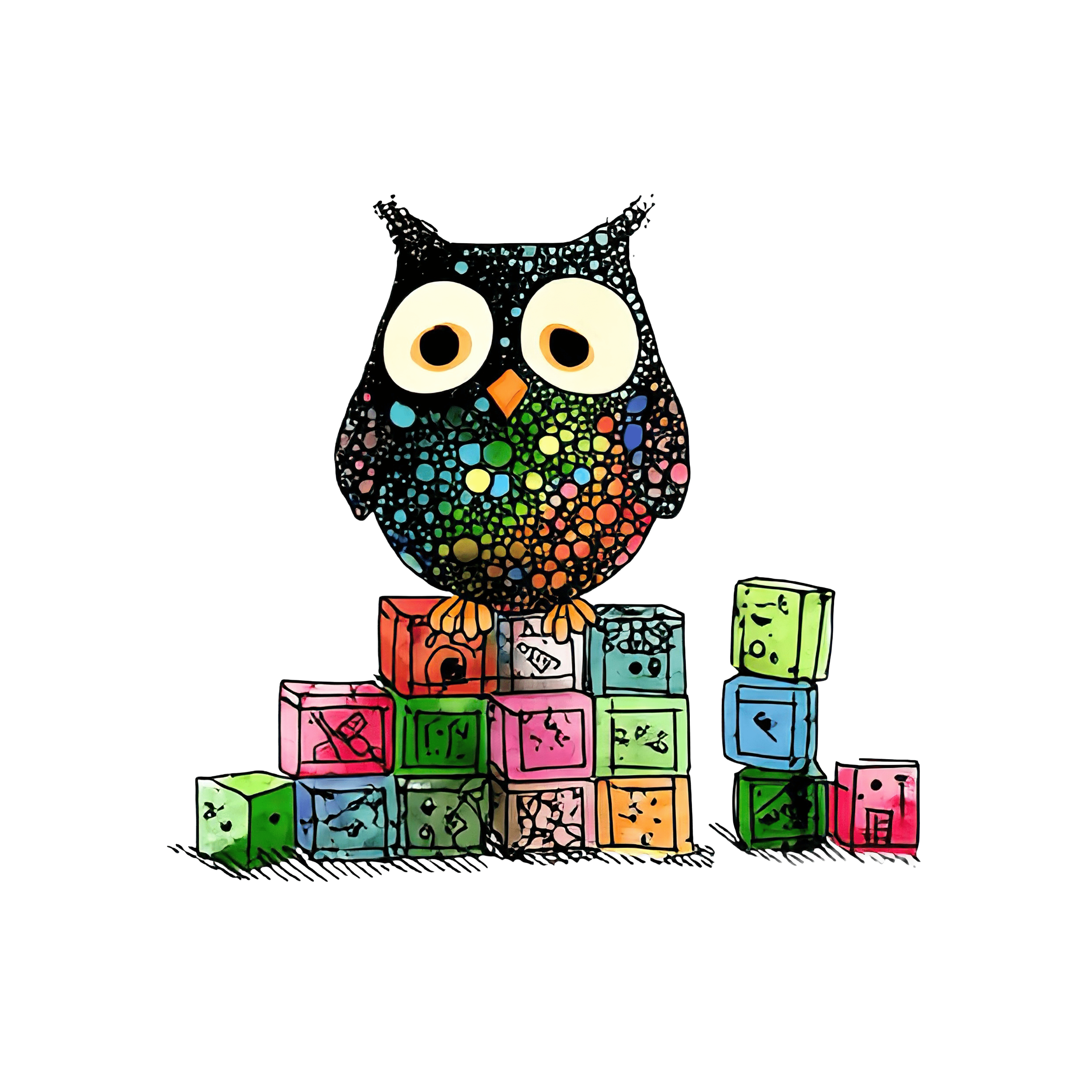 Owl with vibrant, speckled pattern sits atop a stack of colorful alphabet blocks. The intricate design includes bold colors such as orange, green, blue, and pink. Large, round eyes contrast against the detailed body pattern. The owl is centrally perched with blocks in various orientations, providing a playful and geometric element.