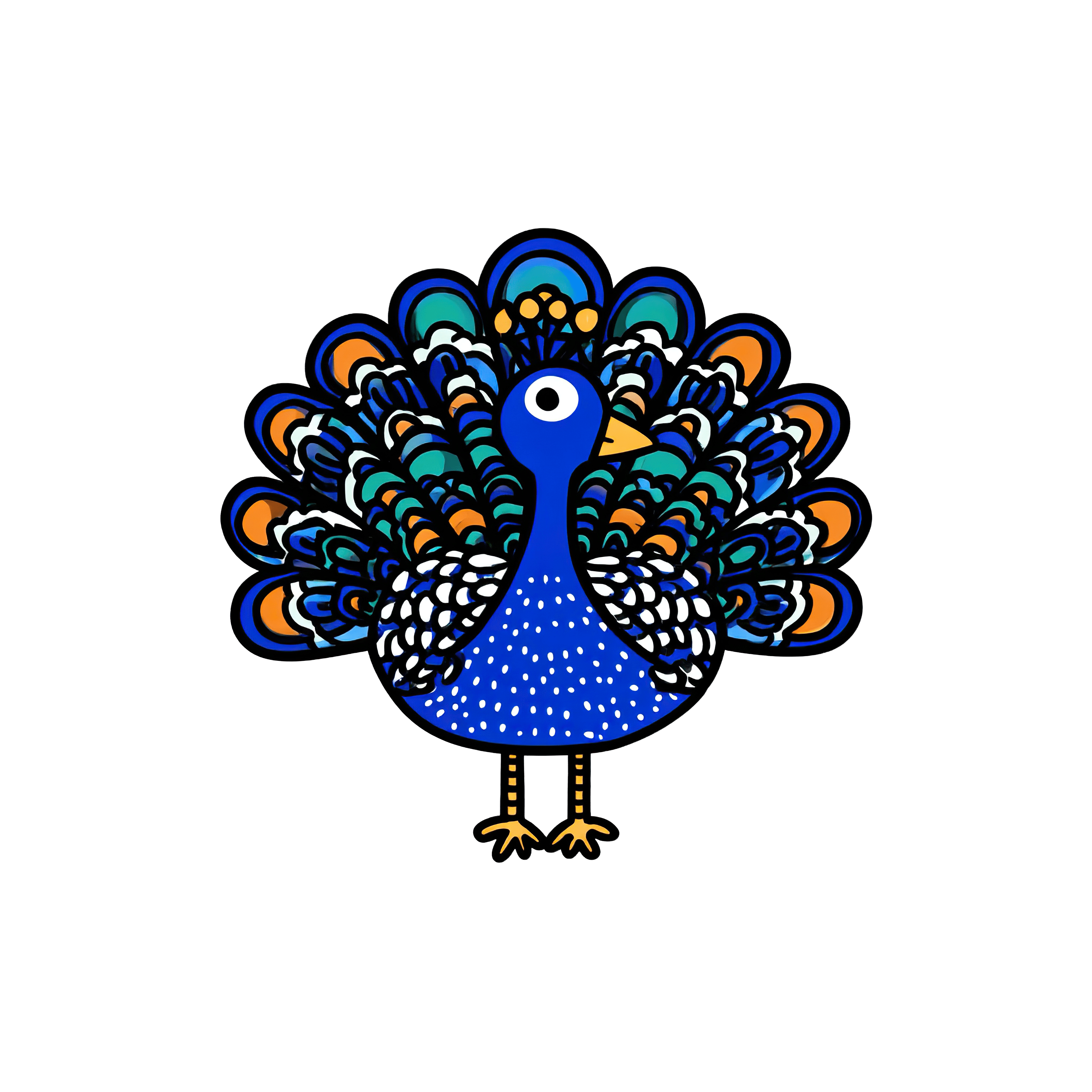 Peacock in clipart style featuring vibrant blue, orange, and green plumage with intricate patterns. The detailed feathers fan out in an eye-catching display, highlighted against a simple black background. The distinct blue body contrasts with the multicolored pattern on the tail, creating a bold, striking visual. The design captures the elegance and complexity of a peacock with a stylized illustration approach.
