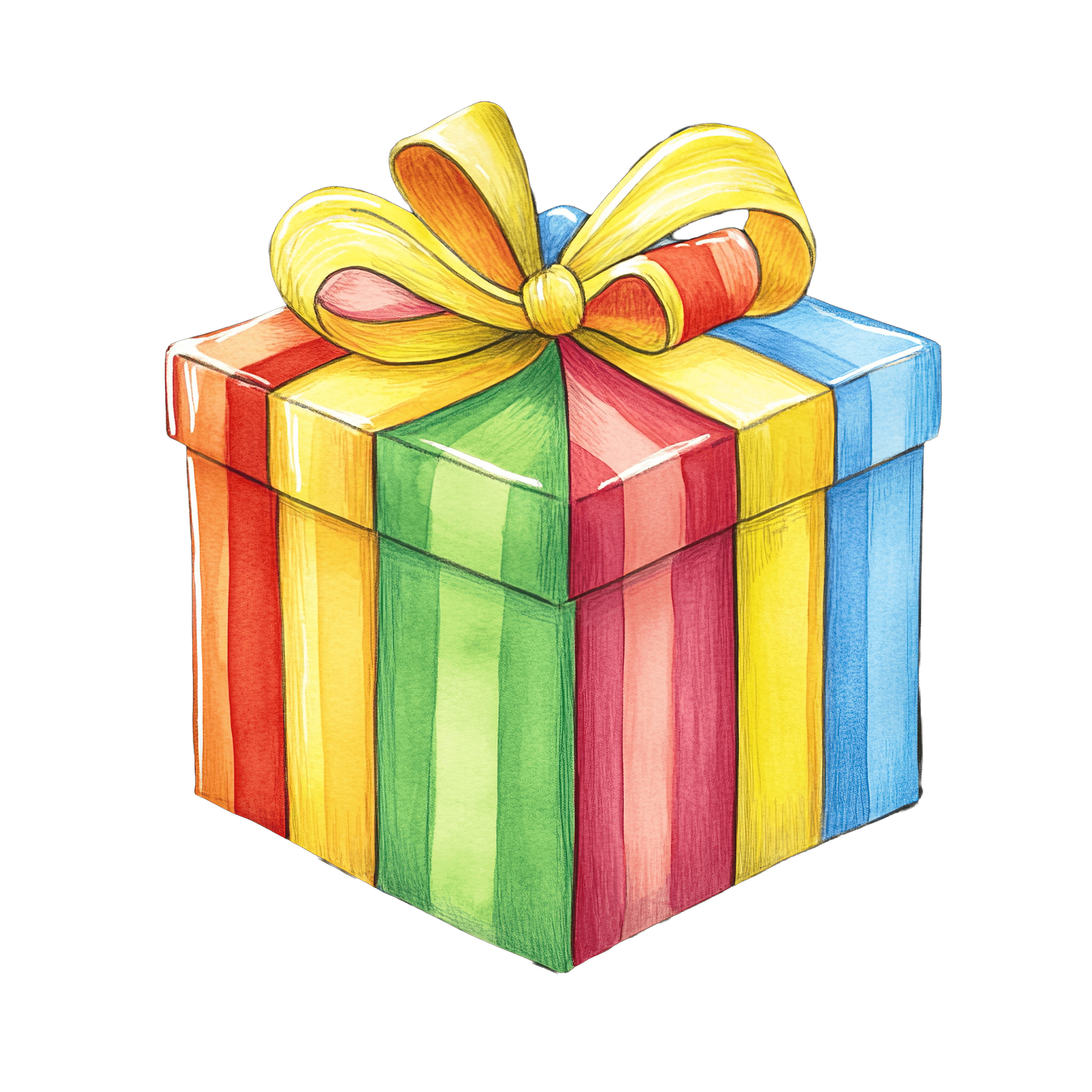 Colorful Striped Gift Box with Yellow Ribbon Bow Striped gift box with rainbow colors and a yellow ribbon bow.Download PNG ▼Download JPG ▼Related posts:Strawberry Topped Cupcake with Pink Frosting dessert sweet treat bakery clipart vectorYellow Squash Whole and Sliced in Detailed ClipartCartoon Prairie Dog Building Sandcastle ClipartCartoon Pirate Character in Traditional Pirate Costume hat clipart vector art printableVibrant Cherry Pair with Lush Green Leaves ArtWatercolor Fruit Collection Featuring Citrus and Berries on BlackRed and White Christmas Ornament with Striped Design and RibbonNaranjilla Fruit with Leaves and Seeds ClipartFestive Christmas Stockings Hanging with Holly and Snowflake PatternsPeach Tart with Sliced Peaches and Mint LeavesStack of Colorful Illustrated Books with Vibrant CoversGlass of Fresh Carrot Juice with Straw and Garnish