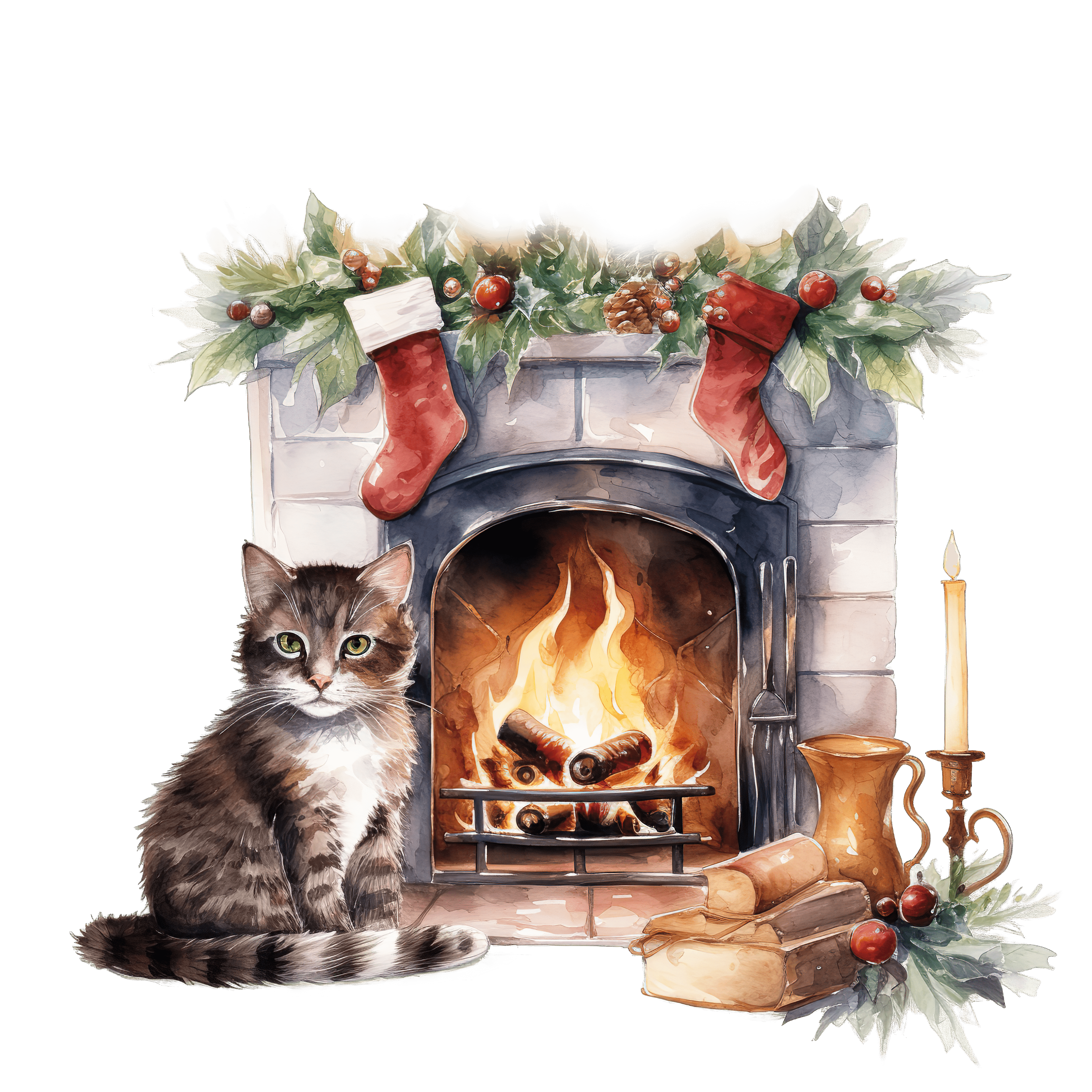 Cozy Fireplace with Stockings and Cat for Christmas Holiday Festive Christmas fireplace with stockings, greenery, and a cat nearby.Download PNG ▼Download JPG ▼Related posts:Watercolor Collard Green Leaf with Detailed Veins vegetable clipart food plant botanicalWatercolor Garlic Bulb with Detailed Texture and ShadowBunch of Fresh Green Parsley Leaves ClipartVibrant Monarch Butterfly With Intricate Orange And YellowBlack And Red Butterfly With Detailed Wing PatternsStylized Sun and Moon Faces with Stars on Black BackgroundWhole and Sliced Lemon with Detailed Texture citrus fruit yellow clipart vectorWatercolor Cactus in a Clay Pot on Black BackgroundParrot in a Green and Yellow Hat ClipartChild with Festive Floral Headband and Red Holiday OutfitPink Ice Cream Scoop in a Silver SpoonFestive Deer with Antlers in a Holiday Wreath Illustration