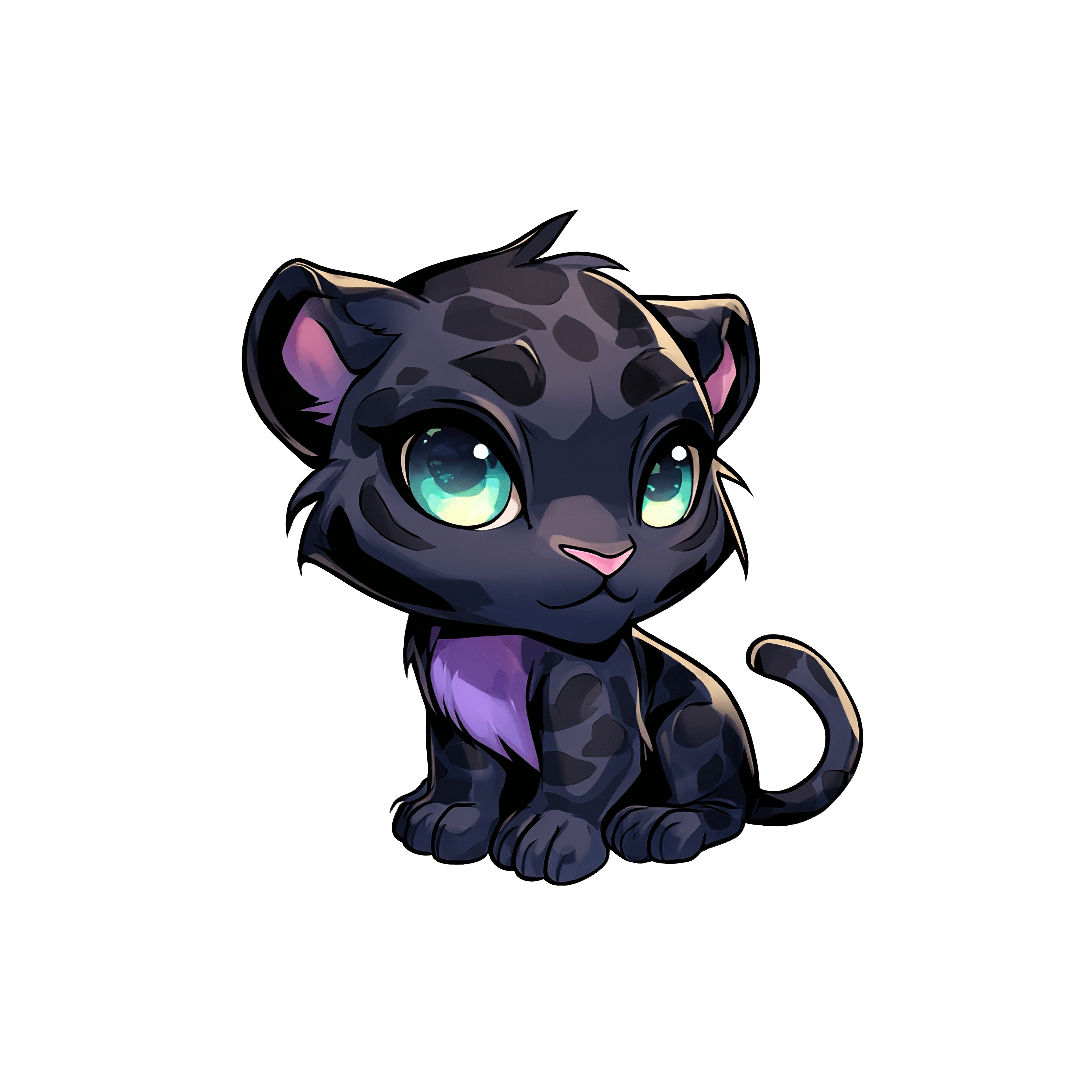 This charming illustration features a small black panther cub with big, expressive green eyes. The cub has a sleek, dark coat with playful purple highlights. Its innocent expression and relaxed pose give it a lovable, cartoonish style, perfect for children's books or educational materials.