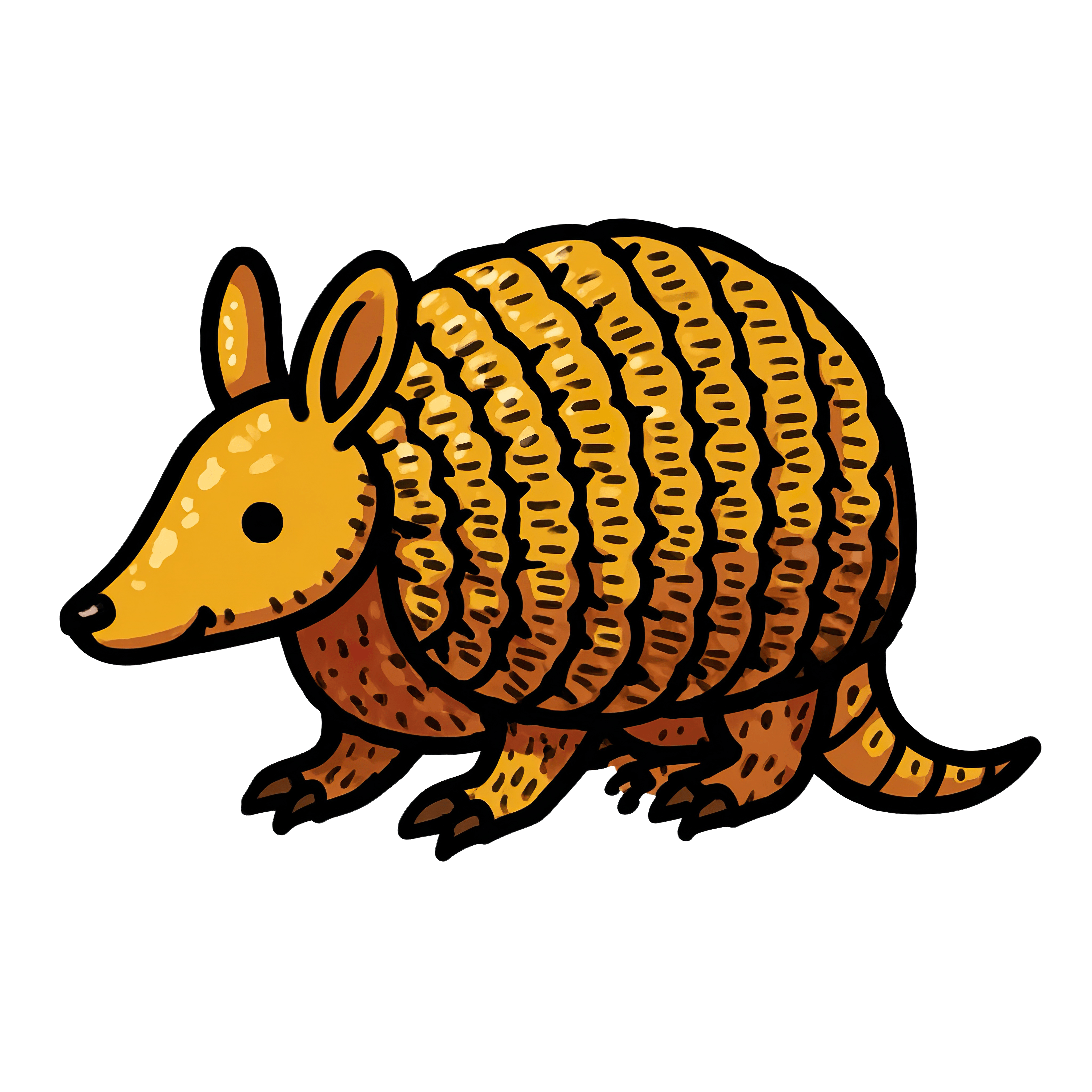 This charming clipart features a cartoon-style brown armadillo. The animal's textured, segmented shell is intricately detailed, highlighting its pattern. The armadillo stands with a friendly expression, making it ideal for educational and decorative uses, especially focusing on wildlife themes.