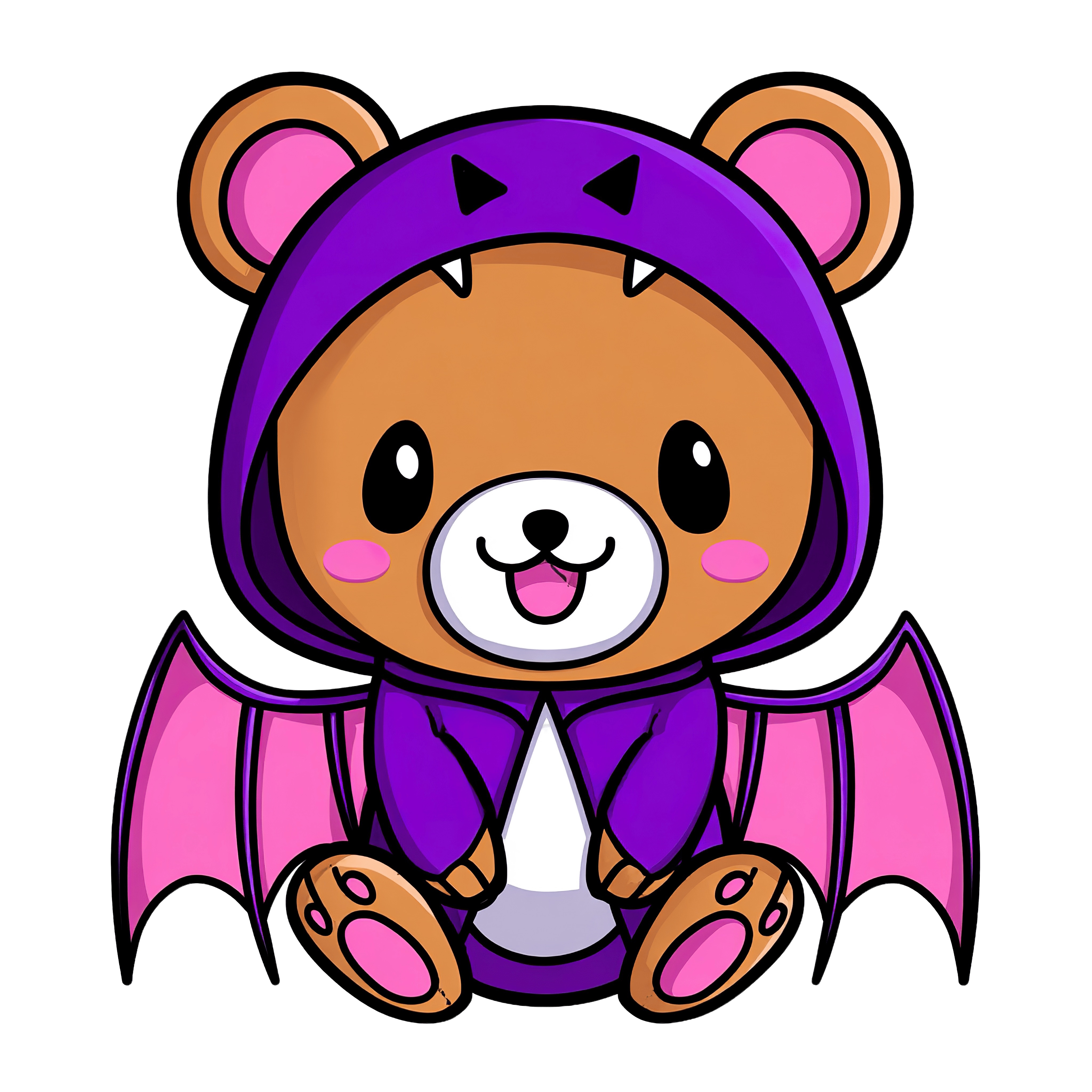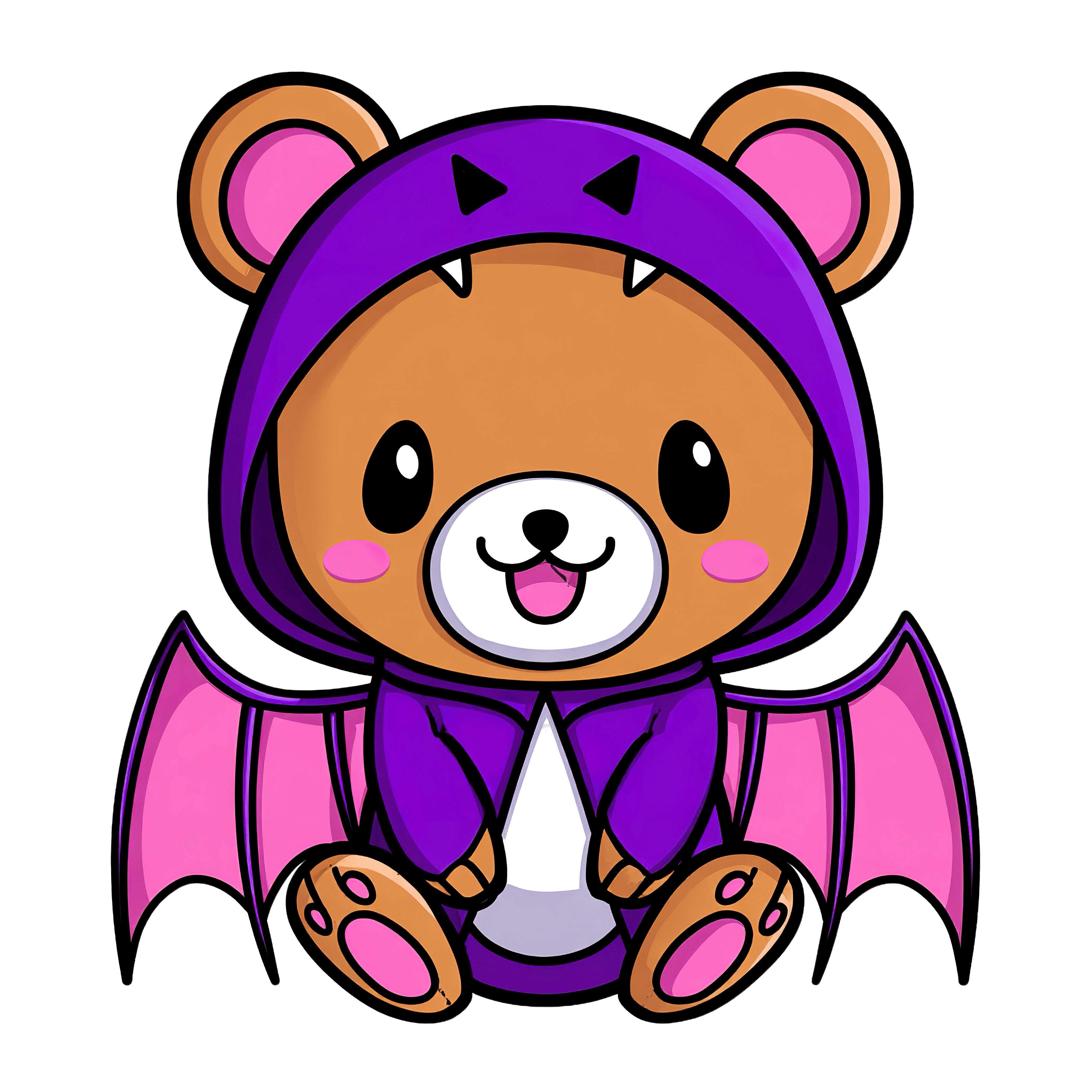 This adorable clipart features a brown bear wearing a vibrant purple bat-themed hoodie. The bear sits in a playful pose, showcasing detailed bat wings and small triangular ears, creating a charmingly whimsical and fun design. Ideal for Halloween or children's themed projects.