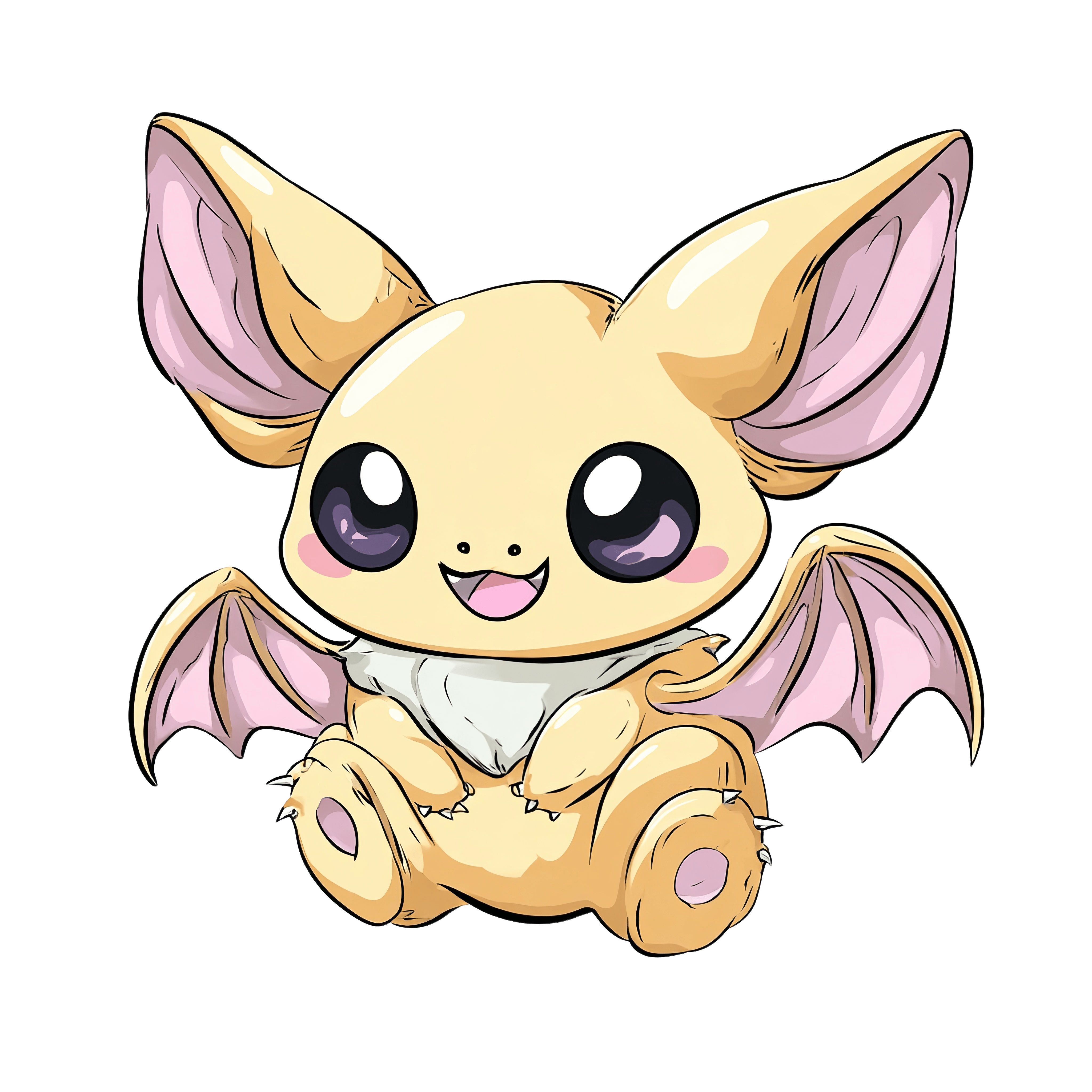 Adorable cartoon bat with large eyes and pink-tipped wings, sitting happily. Its light yellow body and charming smile give a playful and friendly appearance. Perfect for children's designs, Halloween themes, or whimsical projects needing a touch of cuteness and fantasy.