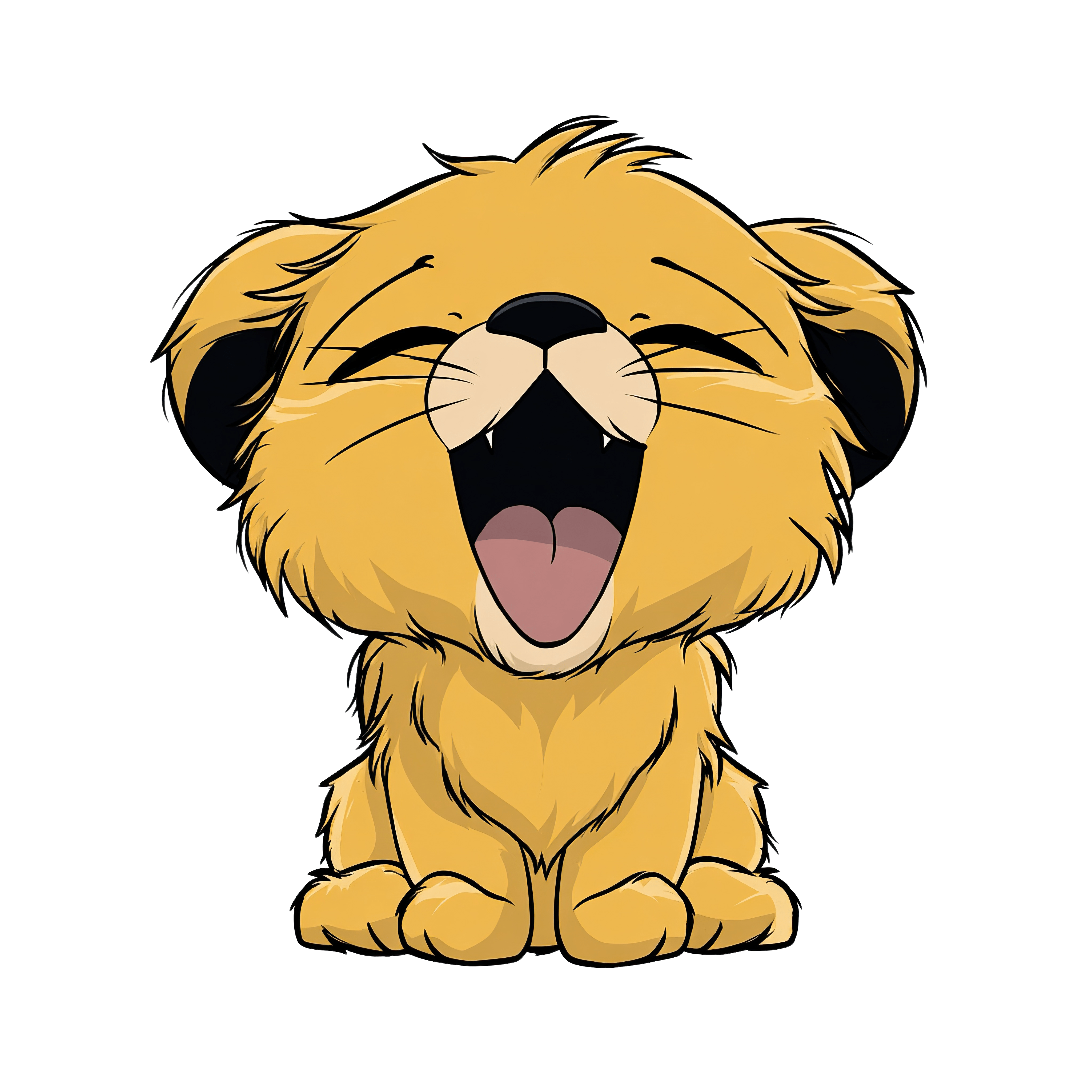 This adorable clipart features a cartoon lion cub with soft yellow fur, sitting and yawning cheerfully. Its eyes are closed, and tiny teeth are visible, adding to its endearing charm. The black outline highlights playful features, making it perfect for kids' designs.