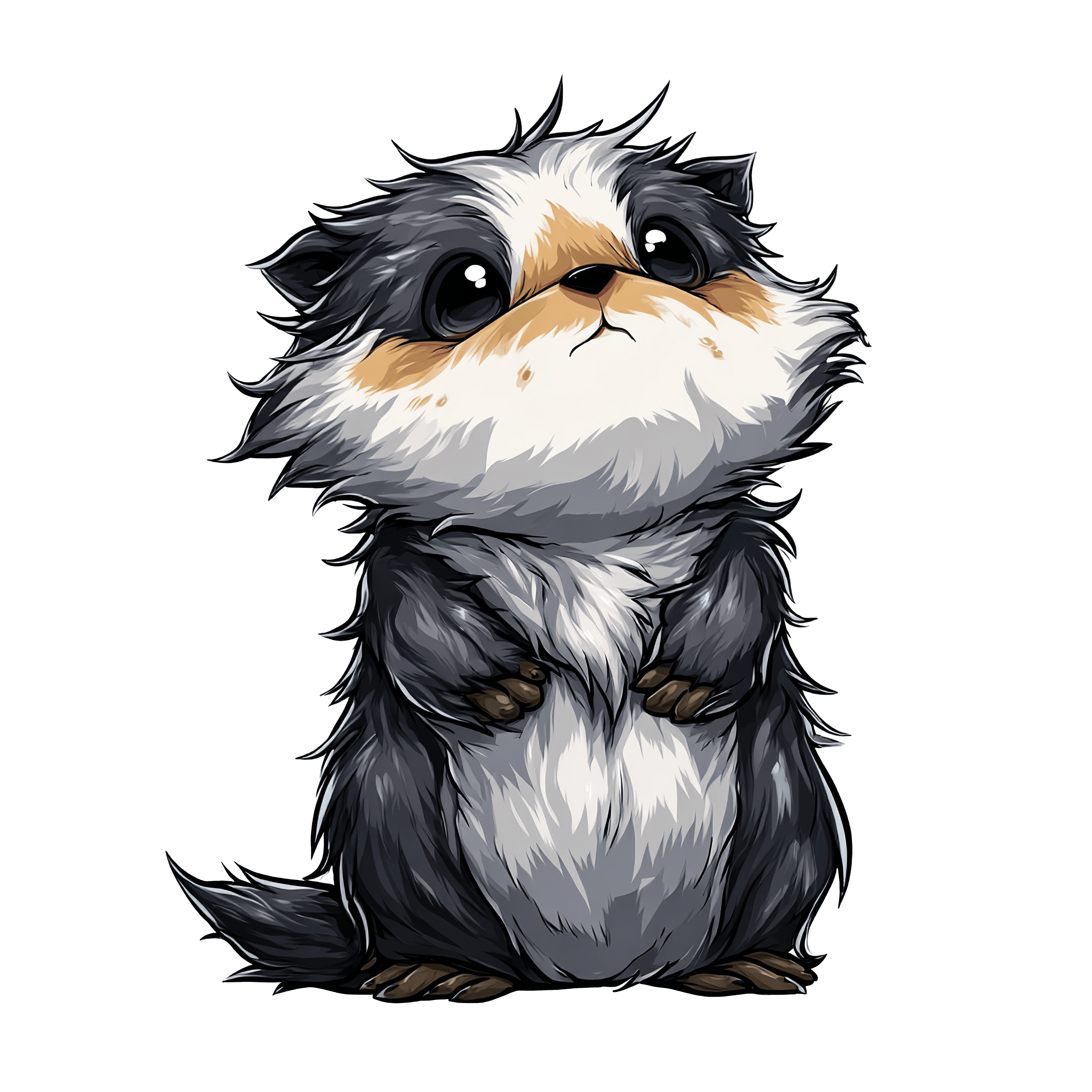 Adorable digital illustration of a fluffy guinea pig with large, expressive eyes and a sad expression. The character's black, white, and brown fur gives it a charming, cartoon-like appearance. Ideal for use in children's books, comics, or as a whimsical design element.