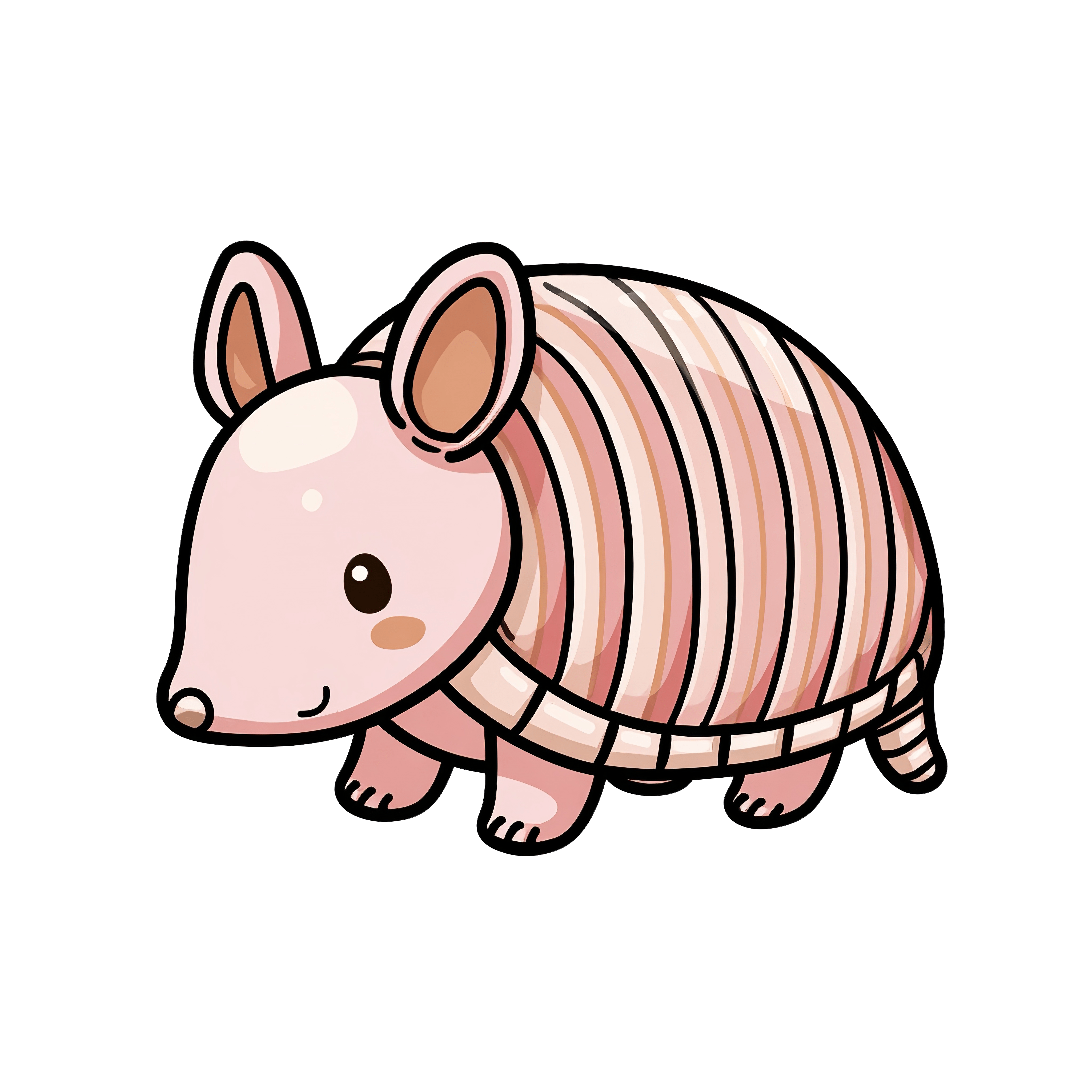 This charming clipart features a cute pink armadillo with a glossy, segmented shell. The armadillo's large ears and small, friendly eyes enhance its adorable appearance. The illustration is outlined in black, adding definition and making it suitable for various creative projects.