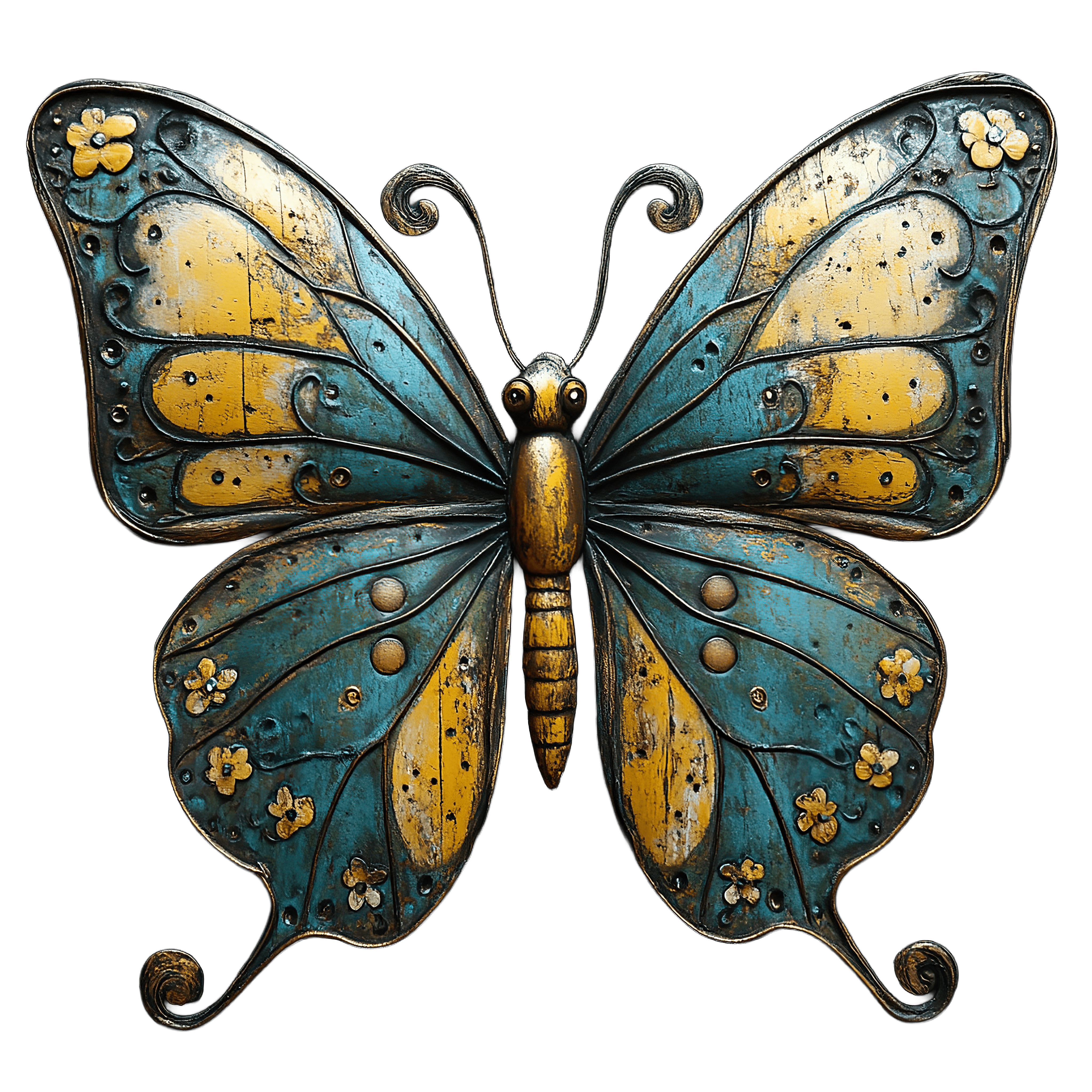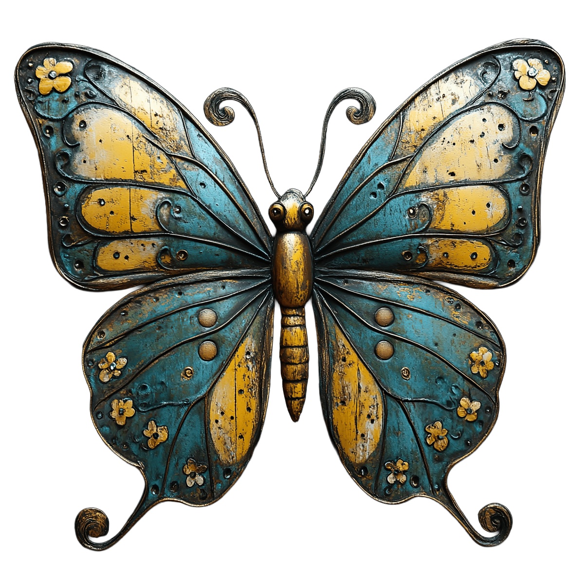Decorative Metal Butterfly With Blue And Yellow Wings Decorative butterfly features intricate blue and yellow metal wings.Download PNG ▼Download JPG ▼Related posts:Festive Christmas Ornament with Red Bow and Holly DecorationsVibrant Butterfly With Sparkling Wings In Gradient ColorsCartoon Character with Large Eyes and Purple OutfitCartoon Yellow Crab with Sun Clipart IllustrationAssorted Tropical Fruits Including Pineapple and Grapefruit bananas citrus clipart vector artIntricately Decorated Christmas Star Cookie with White IcingRetro Styled Woman with Curly Hair in Red Checkered ShirtPastel Macaron Delight Vector Art ClipartMug of Hot Chocolate with Marshmallows ClipartMonkey in Orange Pumpkin Costume ClipartDetailed white camellia flower with green leaves on dark backgroundWatercolor Cloud with Hanging Heart Shapes on Black Background
