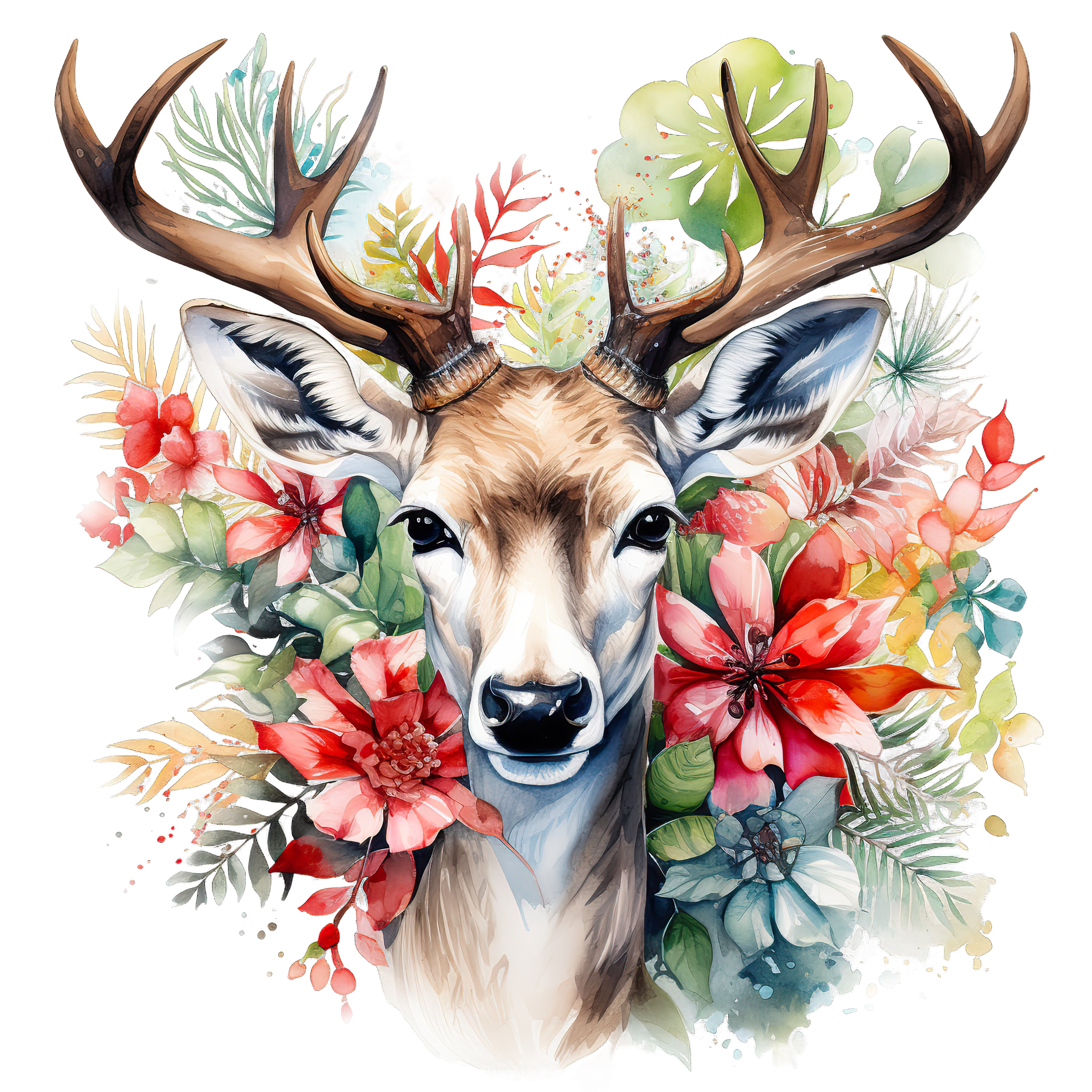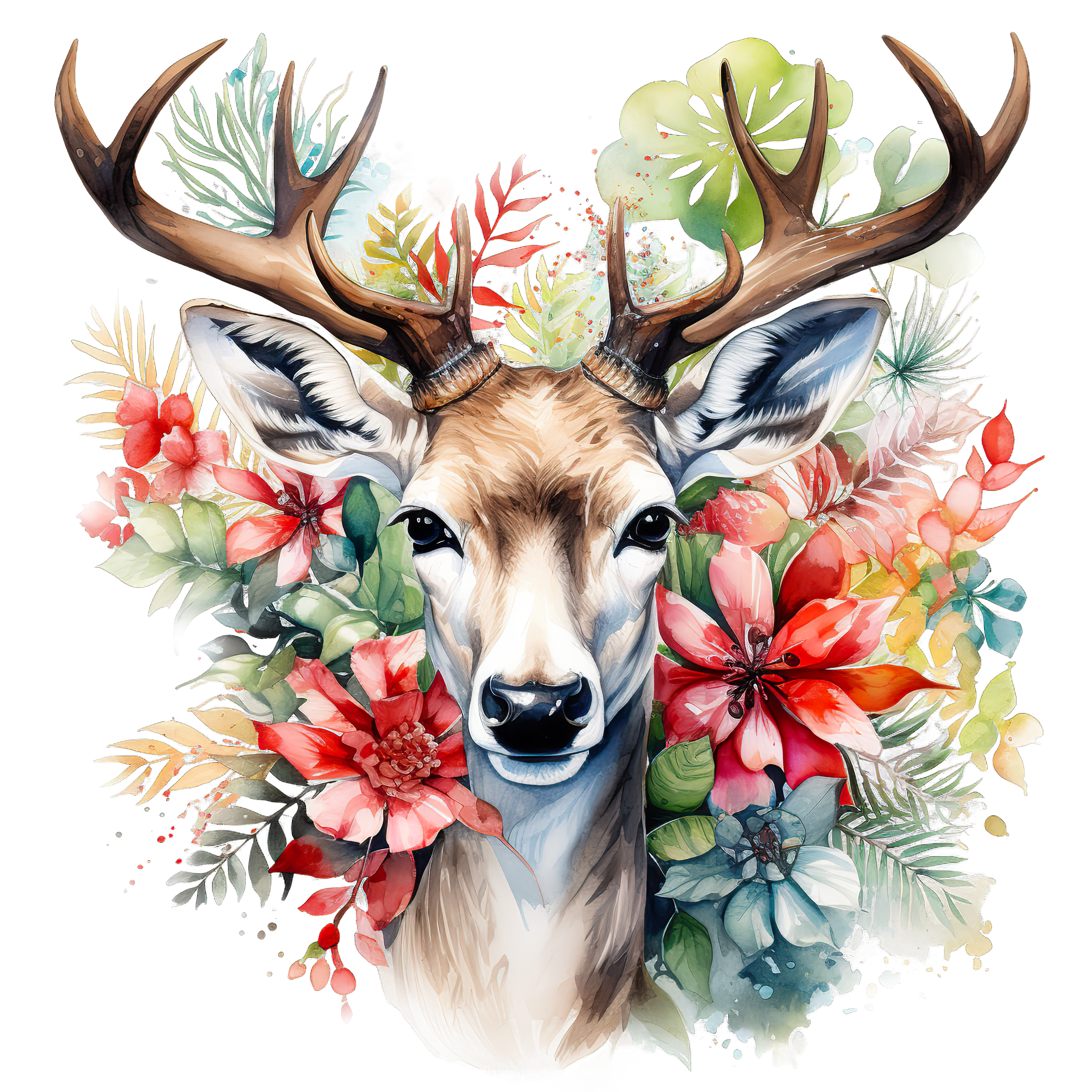 Deer with Colorful Antlers Surrounded by Lush Floral Arrangement Deer head with large antlers amid vibrant flowers and leaves.Download PNG ▼Download JPG ▼Related posts:Okra Flower with Green Leaves Clipart DesignGreen Watercolor Heart with Dark Blue Brush StrokesRed Mug Filled with Hot Chocolate Clipart DesignDetailed Purple Butterfly With Elegant Wing PatternsRambutan Fruit with Leaves and Halved Section red spiky tropical clipart vectorGlass of Iced Tea with Lemon Slice and StrawVictorian Woman with Red Hat and Holiday Dress ClipartSloth on Branch Clipart with Green LeavesVibrant Red Poinsettia with Detailed Leaves IllustrationWatercolor Style Red Cherries Fruit Vector Art PrintableYellow prairie dog clipart in side viewHamster on a Wheel Cartoon Clipart