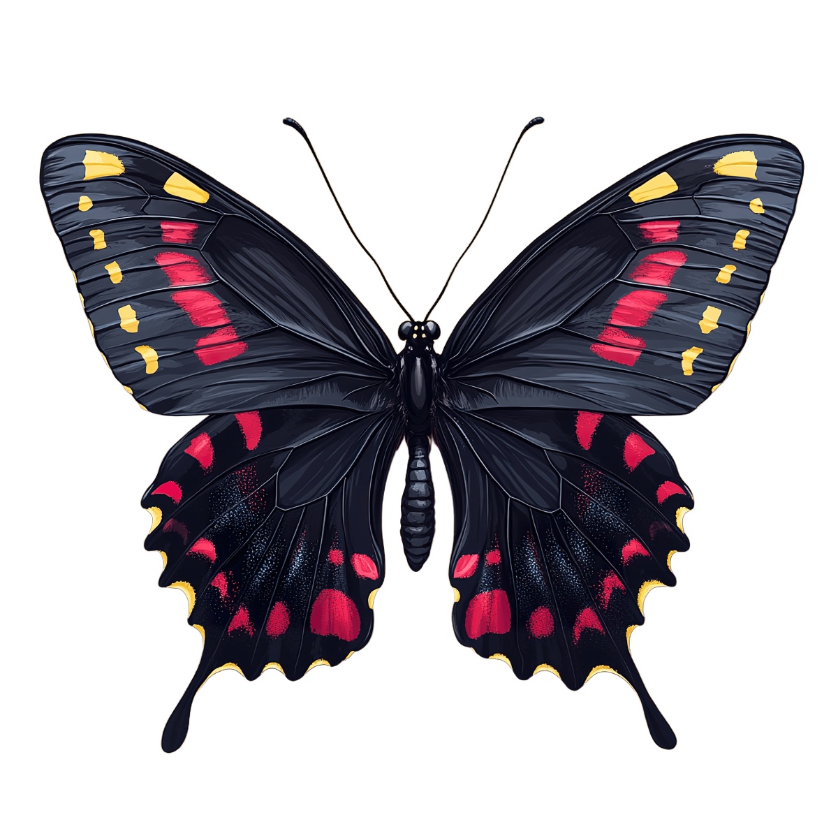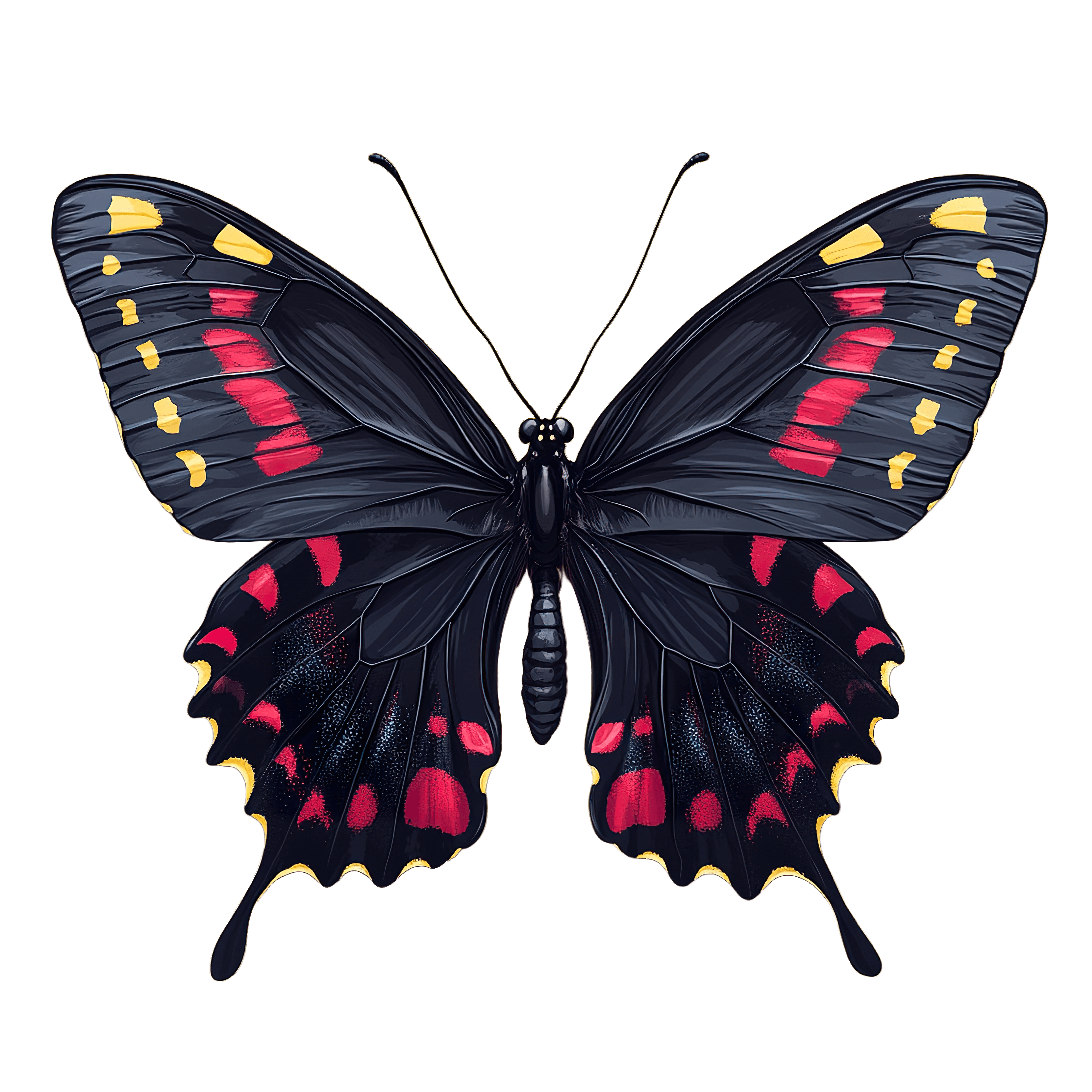 Detailed Illustration Of A Black Butterfly With Colorful Black butterfly features red and yellow patterns on its wings.Download PNG ▼Download JPG ▼Related posts:Strawberry Topped Cheesecake Slice with Whipped Cream dessert food sweet red whiteOrnate Multicolored Mandala Design with Intricate Floral PatternsDetailed Clipart of a Whole Brown Root VegetableFresh Celery Stalks and Leaves Vector Art IconWatercolor Avocado Halves with Seed and Whole FruitVibrant Wine Glass Filled with Red and Yellow LiquidDetailed Green Lettuce Leaves Texture DesignWatercolor Eggplant with Green LeavesVibrant Watercolor Radish and LeavesOpened Passion Fruit with Visible Seeds in Artistic StyleBrown owl wearing a red scarfStained Glass Style Butterfly With Vibrant Green And