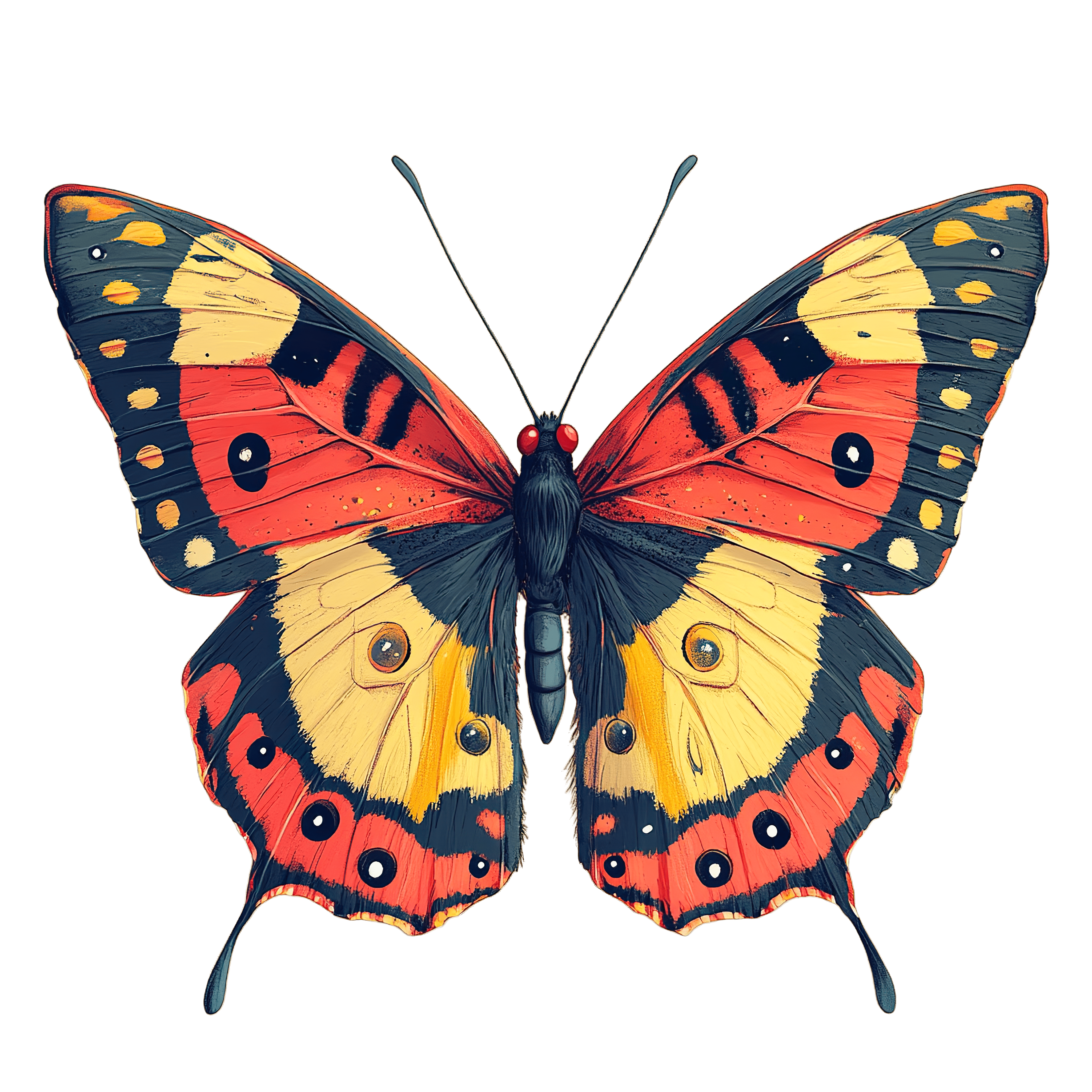 Detailed Illustration Of A Lively Butterfly With Multicolored Butterfly with striking red, yellow, and black wings displayed symmetrically.Download PNG ▼Download JPG ▼Related posts:Lemon Sorbet Scoops with Fresh Mint Leaves and Lemon SliceDetailed Illustration of a Large Pink Dahlia Floral BloomChristmas Elf Holding Green and Red Wrapped PresentsIllustration of Woman with Red Hair and Red BowtieSeries of Stone Stepping Stones in a Curved FormationIntricate Mandala Design with Blue and White Floral MotifsThree ripe jaboticaba berries with green leaves on branchRed Sports Motorcycle with Reflective Chrome Detailing on BlackRefreshing Cucumber Mint Water in a Tall GlassPastel Macaron Delight Vector Art ClipartWatercolor Mangosteen Fruit with Leaves and Halves clipart tropical purple vector artPink Flamingo Bird Vector Clipart Illustration