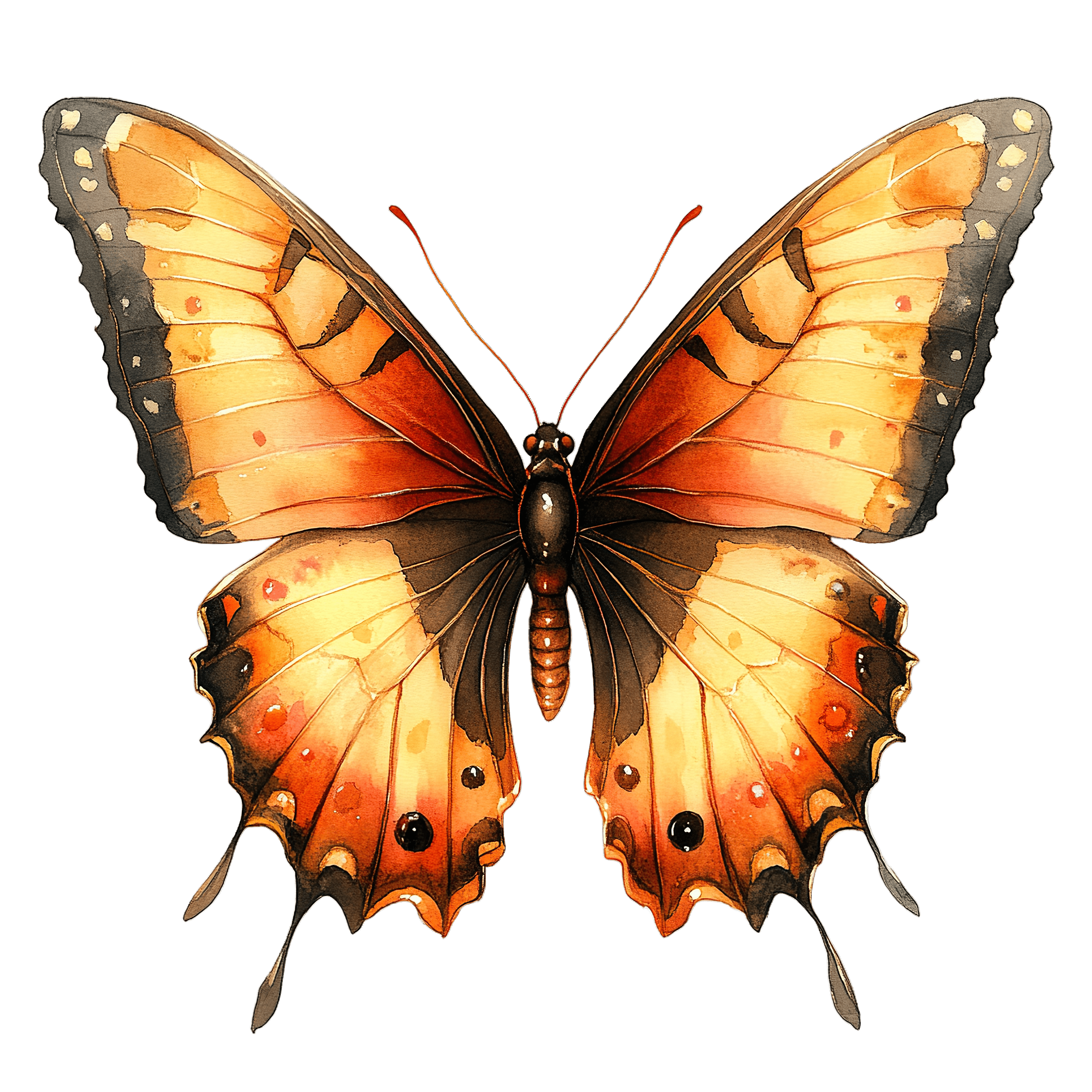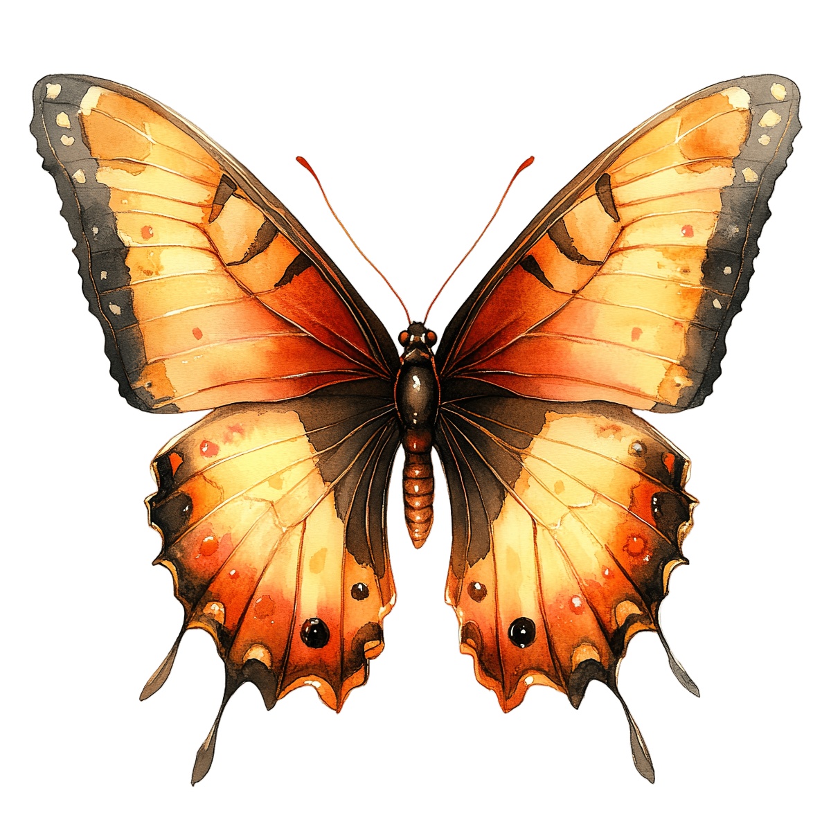 Detailed Illustration Of An Orange And Black Butterfly Orange and black butterfly with detailed wing patterns and textures.Download PNG ▼Download JPG ▼Related posts:Delicious Panettone with Berries and Leaves on TopTraditional Christmas Nutcracker Soldier in Red Uniform Clipart ImageWhole Coconut with Glass of Coconut Milk and PiecesPeanut Butter Cookie Clipart with Textured SurfaceDetailed Butterfly Illustration With Yellow And Black WingsRed and Green Christmas Ornaments with Decorative BowsHedgehog in a Black Cloak ClipartTwo Bellini Cocktails with Strawberries and Peach SlicesCartoon Hamster Running on a Blue WheelWatercolor Illustration of Two Sunflowers with Green LeavesRed-nosed reindeer cartoon illustration with black antlersDetailed Wing Patterns On A Striking Red And