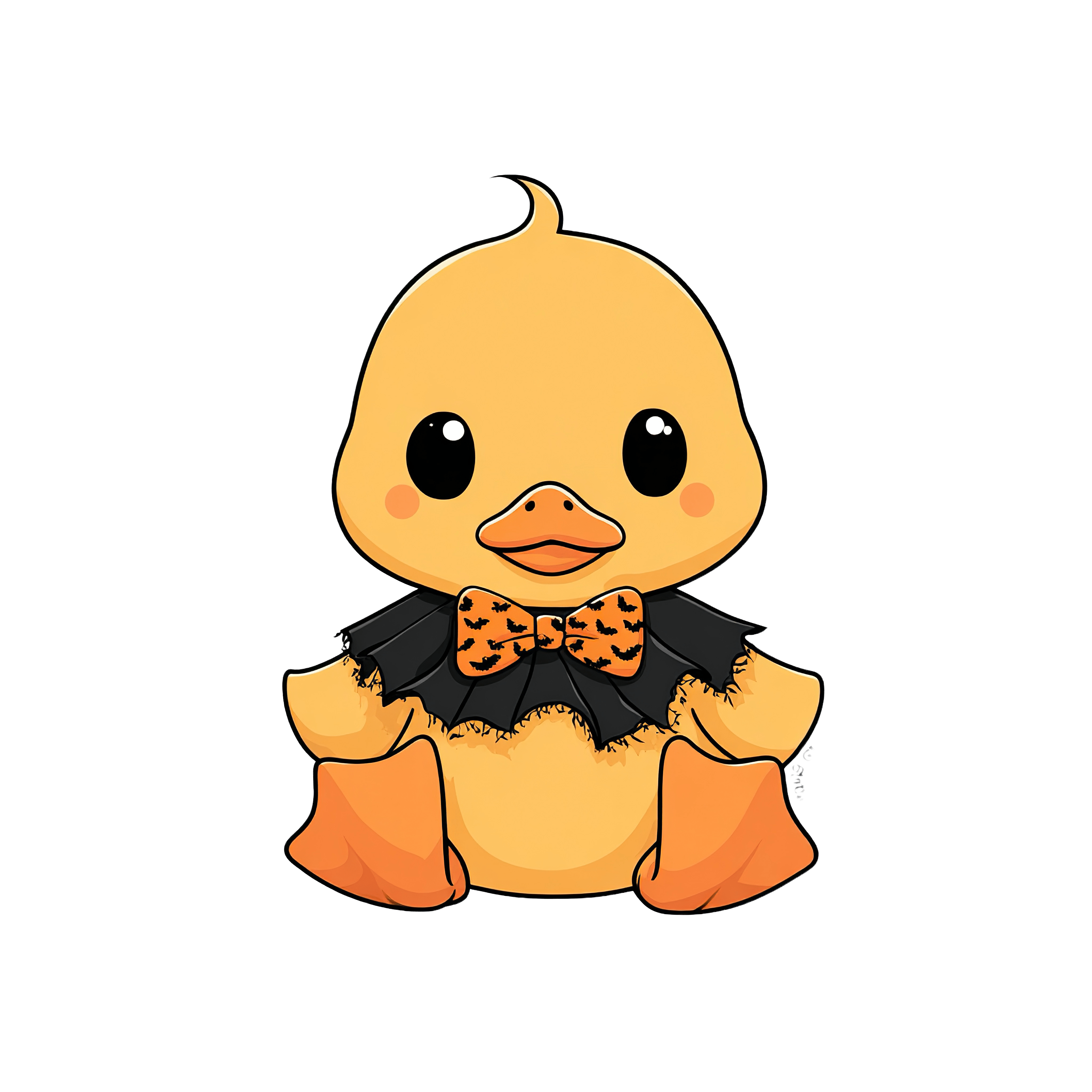A duck cartoon wearing a black bat-themed cape and an orange bow tie is featured in this clipart. The duck is illustrated with a bright yellow body and prominent orange bill and feet. Its large, round eyes stand out against the monochrome background. This image can be used for themes related to animals or stylistic design elements.