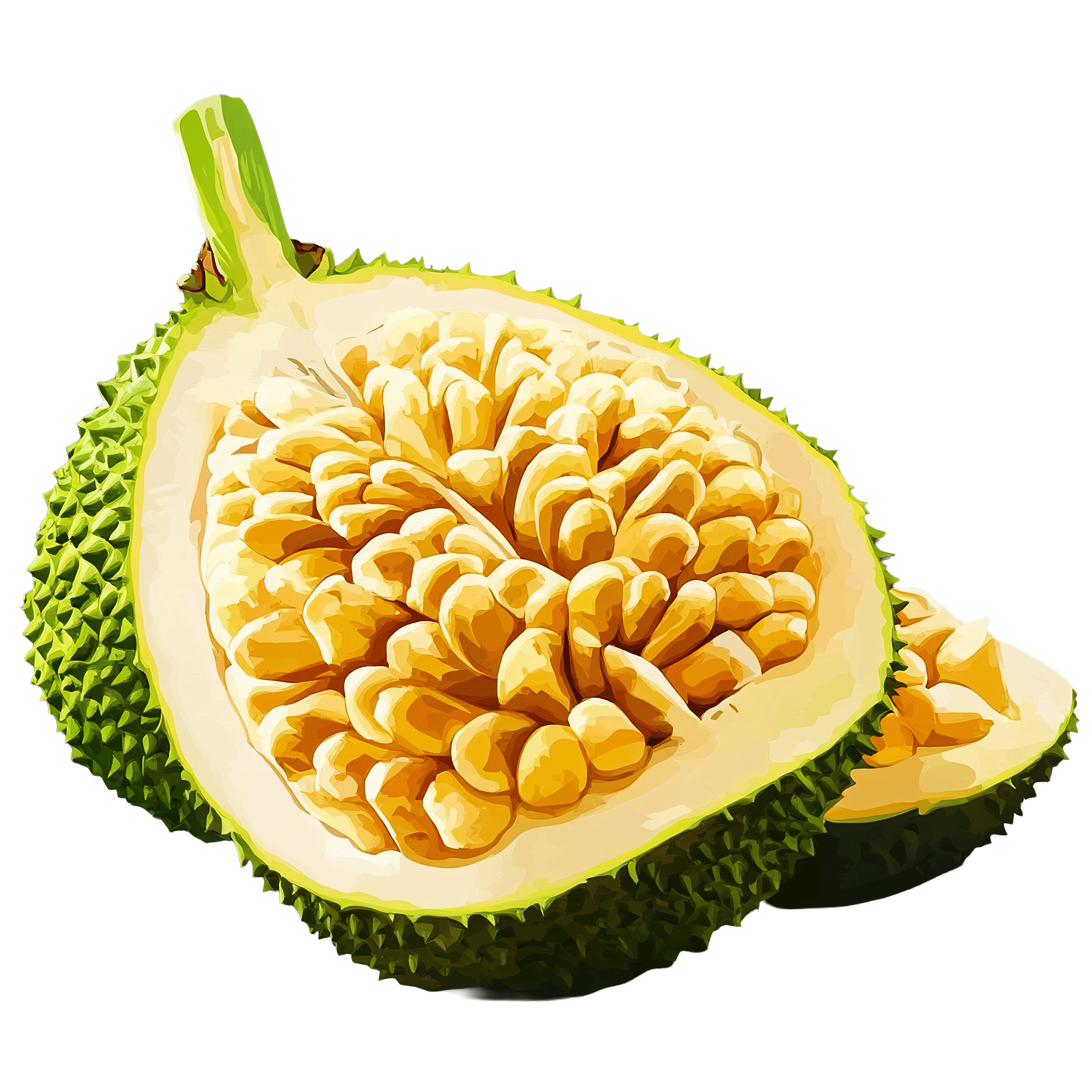 Durian Fruit with Spiky Green Skin and Yellow Flesh Durian fruit with spiky green exterior and yellow interior fleshDownload PNG ▼Download JPG ▼Related posts:Elegant Red Floral Bouquet with Roses and Lilies ClipartThree Blackberries with LeavesYellow Buttercup Flower Illustration with Green Leaves on BlackAbstract sun and ocean waves in artistic clipart designGeometric Mosaic Heart with Vibrant Watercolor DesignTwo Whole Onions with Brown Skins and Green TopsGlittering Wings Of A Vibrant Orange Butterfly InSlice of Berry Tart with Fresh Strawberries and BlueberriesYellow Turnip with Green LeavesCluster of Ripe Lychee Fruits with Green LeavesColorful Butterfly With Intricate Multicolored Wing PatternsCoconut Mint Smoothie in Glass with Fresh Leaves