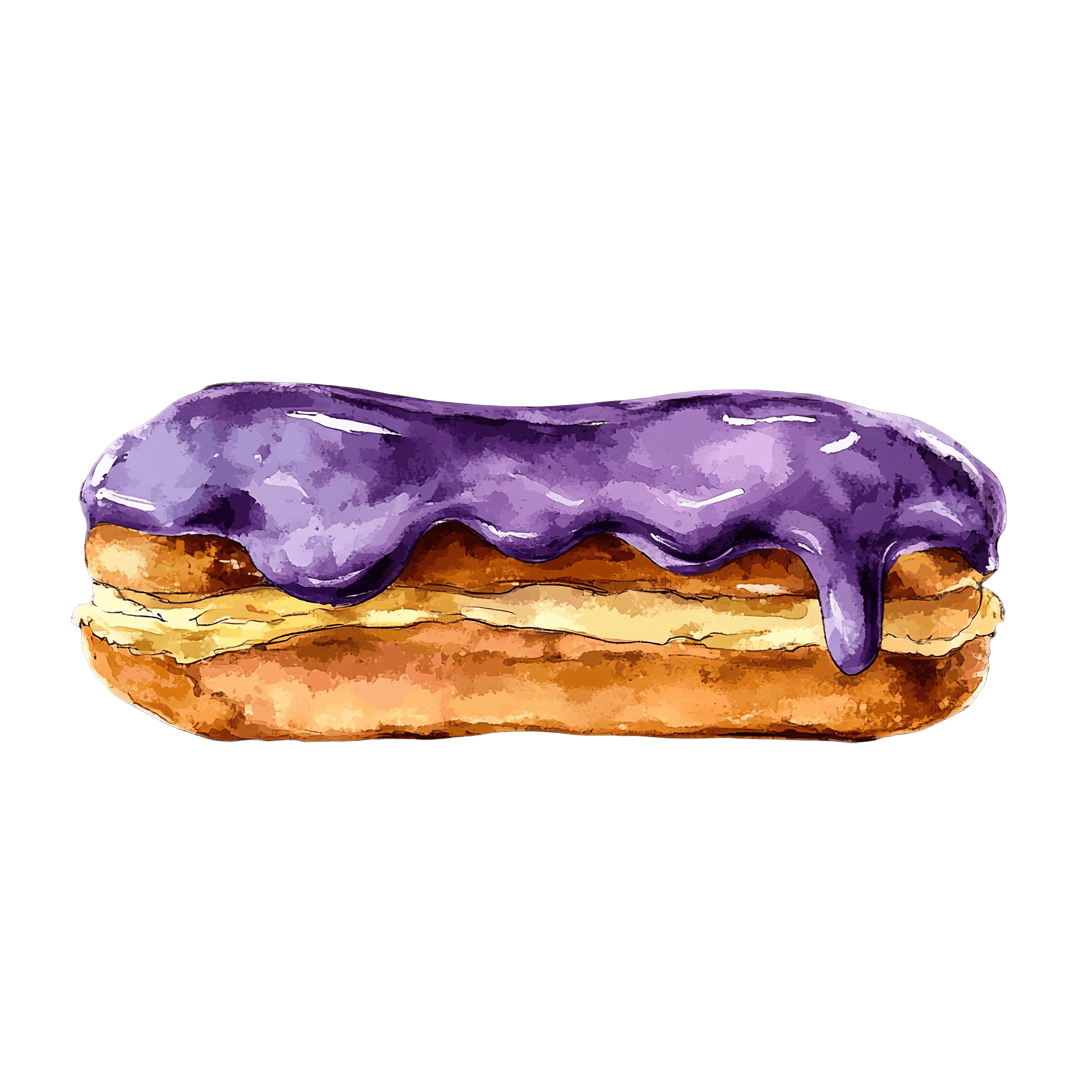Eclair with Rich Purple Icing and Cream Filling Eclair topped with purple icing and filled with cream.Download PNG ▼Download JPG ▼Related posts:Detailed Illustration of a Bright Yellow Sunflower on BlackRed and Yellow Maple Leaf Illustration on Black BackgroundColorful Butterfly Art With Stunning Pink And BlueArtistic Orange Carrot with Fresh Green LeavesGreen Bubble Tea with Black Tapioca Pearls and StrawExotic Pineapple and Coconut Fruit Vector ArtMouse in Green Outfit Clipart IllustrationWatercolor Glass of Whiskey with Ice Cubes drink alcohol beverage clipart vectorVibrant Green and Blue Fruits with LeavesRed Apple with Stem fruit food clipart vector artVictorian-Inspired Woman in Red Hat with Ribbons and LaceGlass of Fresh Grapefruit Juice with Sliced Fruit
