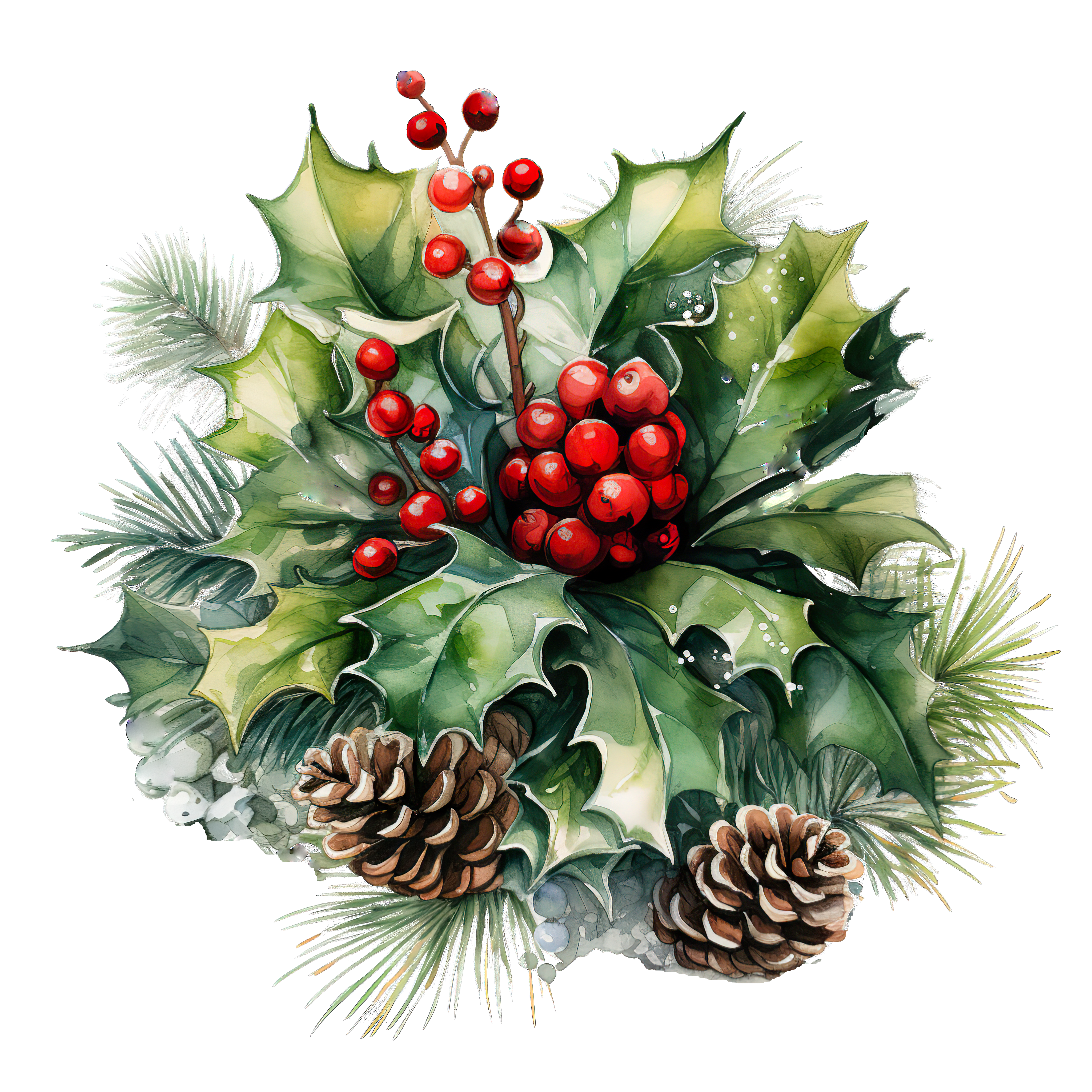 Festive Arrangement with Holly Leaves, Red Berries, and Pine Cones Holly leaves and red berries with pine cones in a Christmas-themed arrangement.Download PNG ▼Download JPG ▼Related posts:Fresh Broccoli Rabe with Green Leaves and StemsWatercolor Night Desert Scene with Cacti and Starry SkySloth on Red Slide Clipart DesignRealistic Yellow Onion with Detailed Texture in Clipart StyleThree Festive Gnomes in Colorful Hats and Snowy SceneGlass of Water with Lemon Slice and Ice CubesTextured Leafy Seahorse IllustrationDetailed Butterfly Illustration With Vibrant Wing Patterns InsectCartoon Ghost Character with Big Eyes and Open ArmsDetailed Botanical art of a Plant with RootsIntricate Watercolor Design of Leaves in Green and Red HuesBrown and White Owl Clipart Illustration