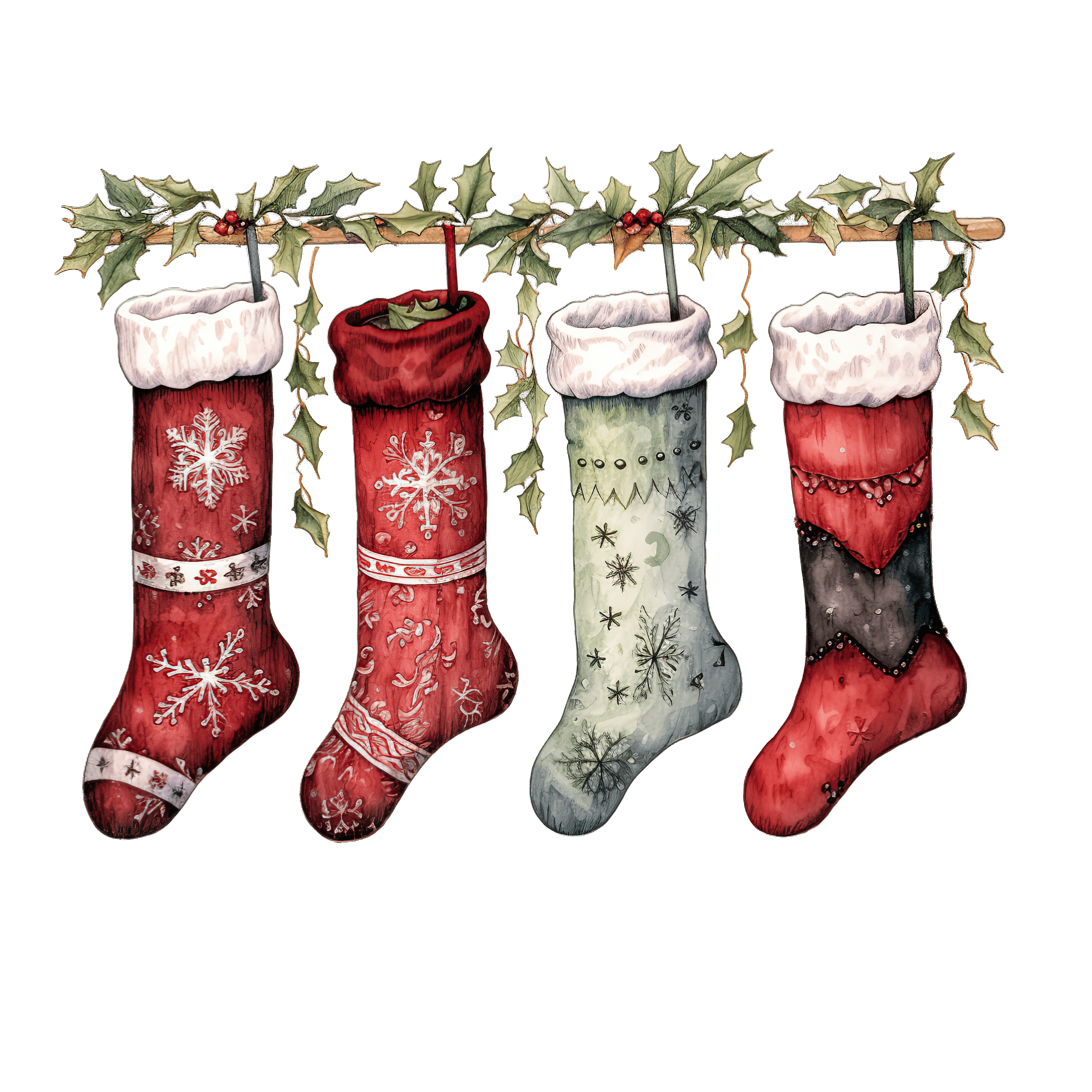Festive Christmas Stockings Hanging with Holly and Snowflake Patterns Four colorful Christmas stockings adorned with holly and snowflake designs.Download PNG ▼Download JPG ▼Related posts:Red Festive Boots with Holly and Berries for ChristmasFestive Teacup with Poinsettia and Holly DecorationsBrown and White Owl Clipart IllustrationVibrant Multicolored Chameleon Illustration on a BranchCartoon Firefighter Character in Yellow Helmet and UniformYoung Girl Holding Wrapped Gift with Large Ribbon BowWatercolor cucumbers with cilantro leaves and slices cucumber green vegetable clipart foodDecorative Metal Butterfly With Blue And Yellow WingsGreen Cup of Coffee with Latte Art and SpoonDetailed Christmas Ornament with Gold Floral PatternsCartoon donkey playing soccer with a ballBlack Hiking Boots with Red Laces and Berries Decoration
