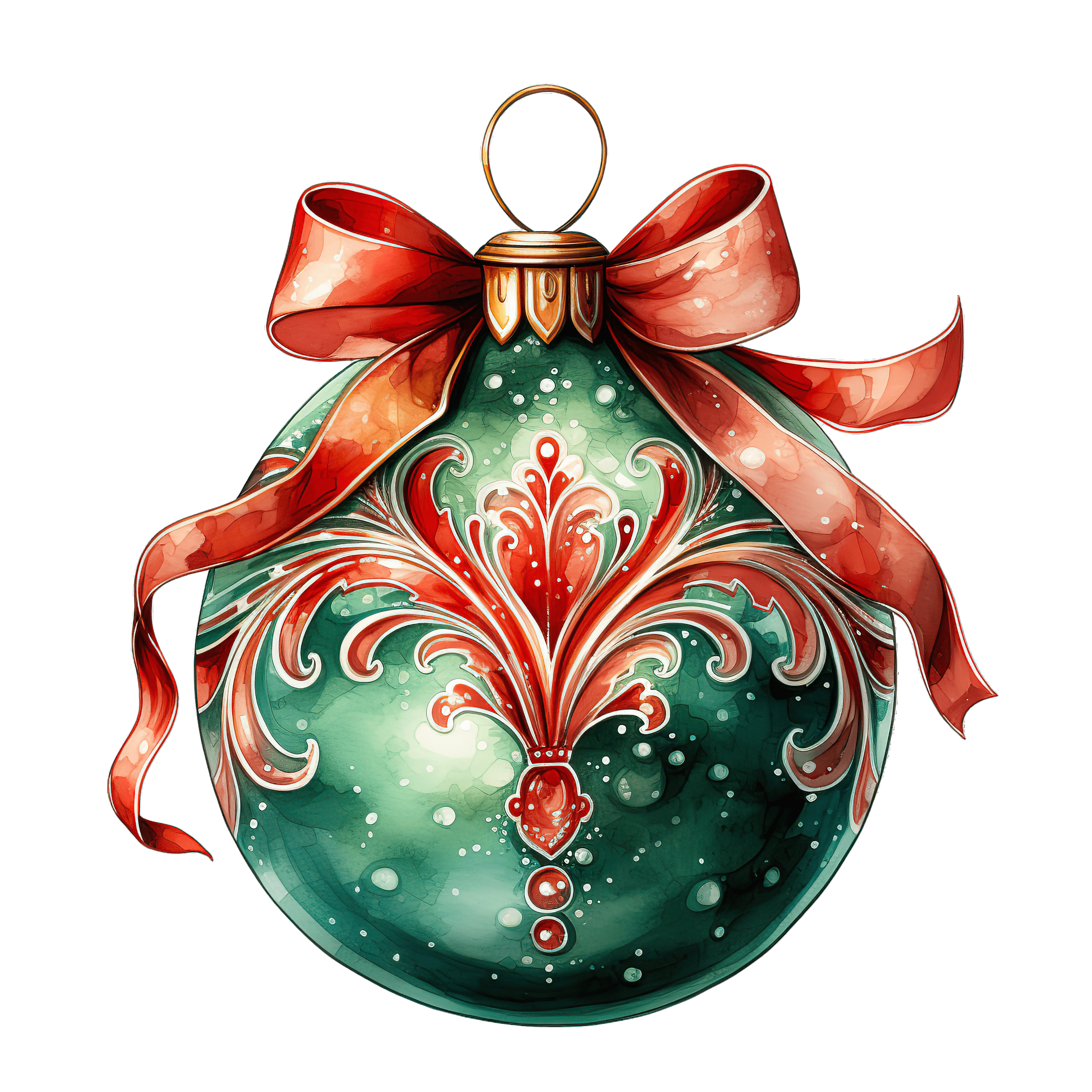 Festive Green Christmas Ornament with Red Decorative Bow Green Christmas ornament with intricate red designs and large red bow.Download PNG ▼Download JPG ▼Related posts:White seagull wearing orange boots clipartGeometric Heart Shape with Colorful Triangular PatternsVivid Butterfly Artwork With Spread Wings In DetailedFresh Cauliflower Surrounded by Vibrant Green LeavesBanana Slices on Toasted Bread with Honey DrizzleWatercolor Passion Fruit with Leaves and Halved ViewCranberries and Leaves with Halved Fruit DesignWatercolor Muffin with Poppy Seeds and Sugar ToppingBlue Logging Truck Loaded with Timber and Green FoliageBlue Lantern Adorned with Flowers and Candle for Holiday DecorVibrant Butterfly With Luminous Wings Insect Vector IllustrationAlmond and Pear Tart with Sliced Topping Clipart