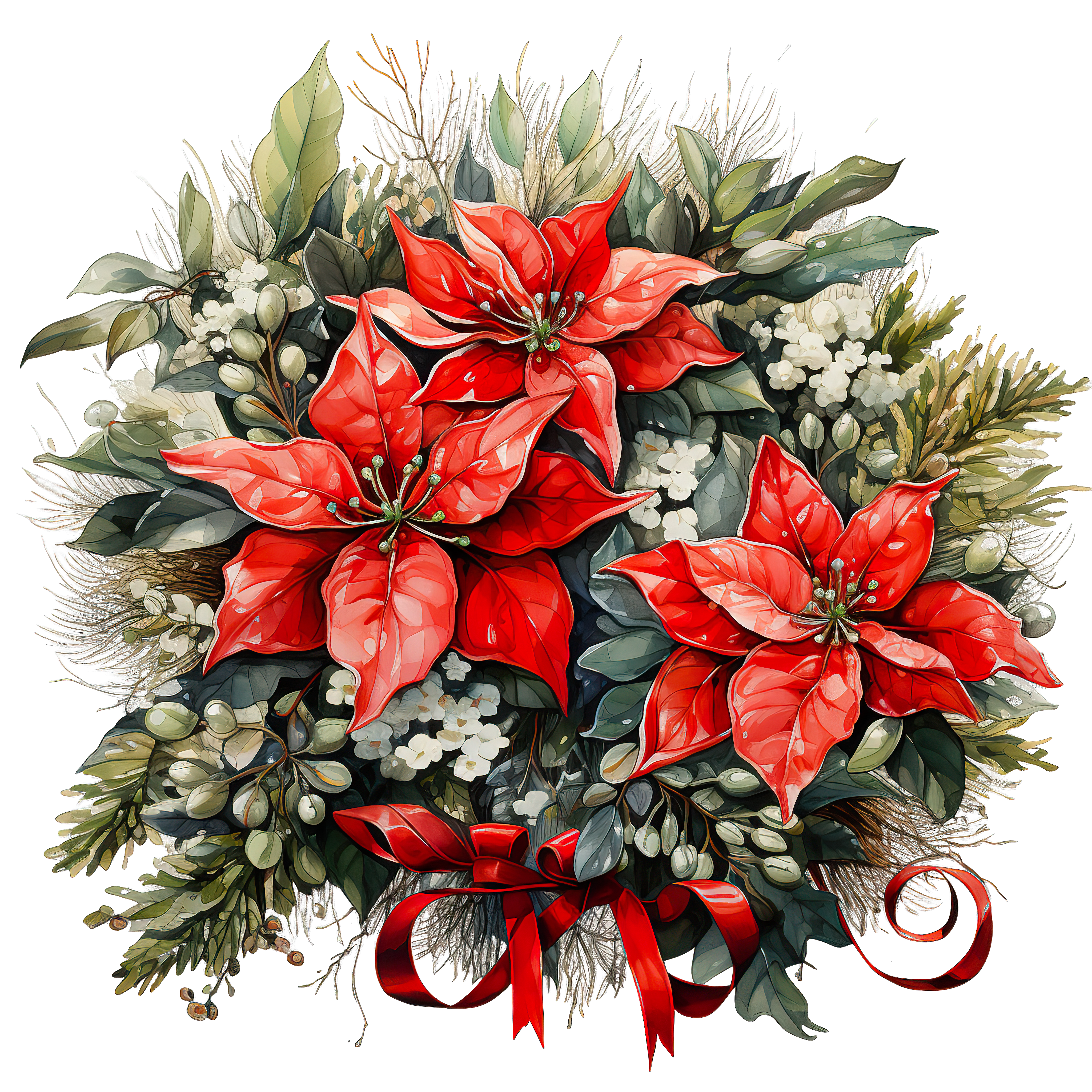 Festive Poinsettia Bouquet with Red Ribbon and Greenery Poinsettia bouquet adorned with lush greenery and a decorative red ribbon.Download PNG ▼Download JPG ▼Related posts:Refreshing Berry Cocktail with Lemon Slice and StrawGingerbread Man Cookie with Red Bow and Buttons ClipartOwl Perched in Festive Wreath with Red Berries and LeavesBrown and White Owl Clipart IllustrationDetailed Butterfly Illustration With Vibrant Multicolored WingsWatercolor Passion Fruits with Halved View and SeedsGingerbread Man Cookie Illustration with Icing DetailsTomato Soup and Spoon in BowlColorful Jellyfish Cartoon Clipart ImageFestive Christmas Fireplace with Garland and Pine DecorationsMint Julep in a Silver Cup with Fresh Mint LeavesCartoon crow wearing a large orange hat
