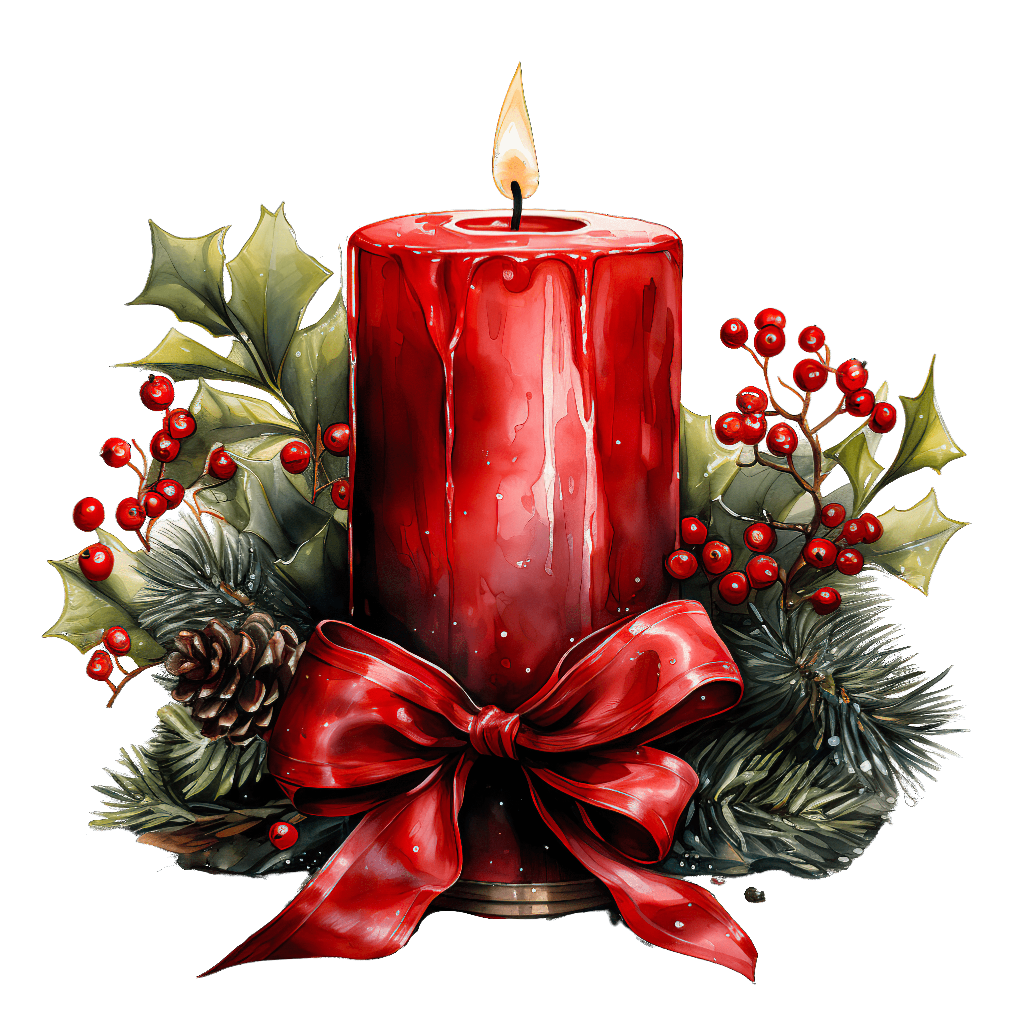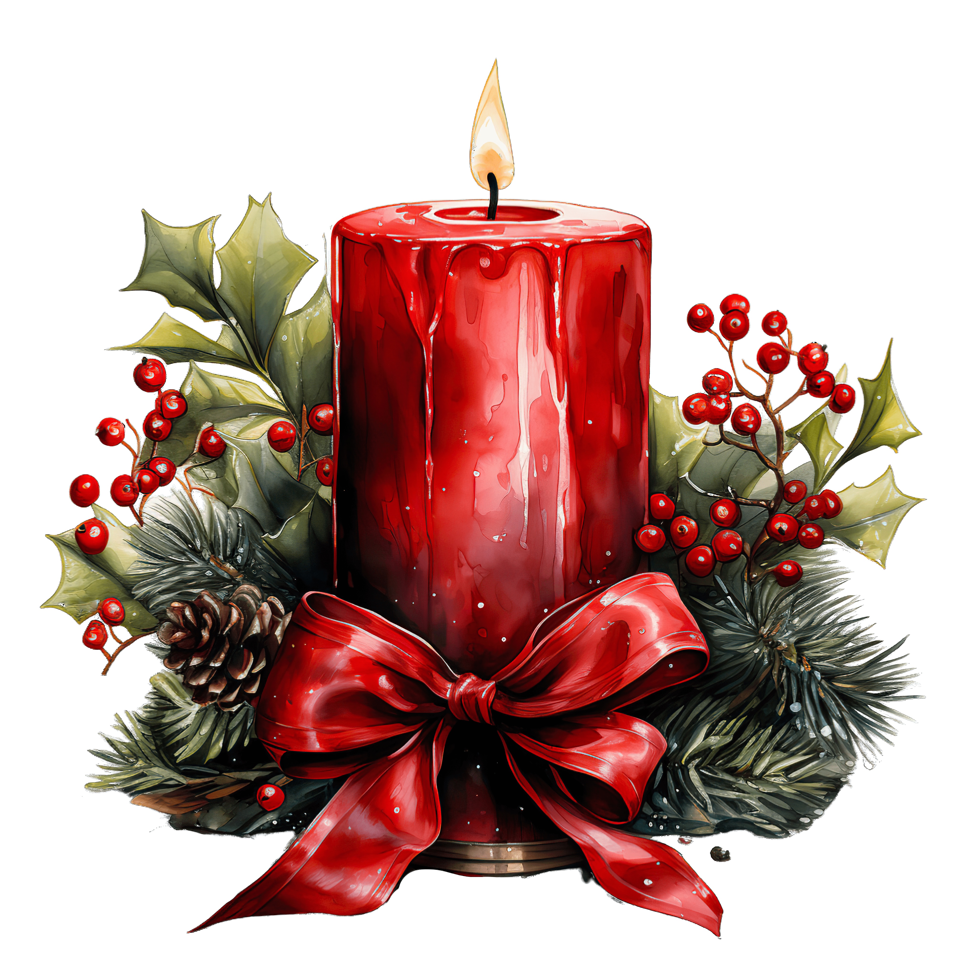 Festive Red Candle with Holly and Ribbon Decoration Red candle with holly, red berries, and pine accents for Christmas theme.Download PNG ▼Download JPG ▼Related posts:Intricate Christmas Ornament with Green and Red DesignFresh Apricots with Leaves and Halved Fruit DisplayVibrant Monarch Butterfly With Intricate Orange And YellowSitting wolf pup clipart with black and white furRed-haired woman with tied scarf and vintage plaid blouseMatcha Bubble Tea with Tapioca Pearls and Mint LeavesRed Christmas Stocking with White Top and Decorative BowWatercolor Slice of Dried Orange with Seeds fruit food clipart vector artHibiscus Flowers with Glass Bottle of Herbal OilWatercolor Cocoa Pods with Green Leaves vibrant clipart vector art printable foodGlass of Chocolate Milk with Bubbles on TopWatercolor Wine Glass with Red Wine clipart drink beverage vector art printable