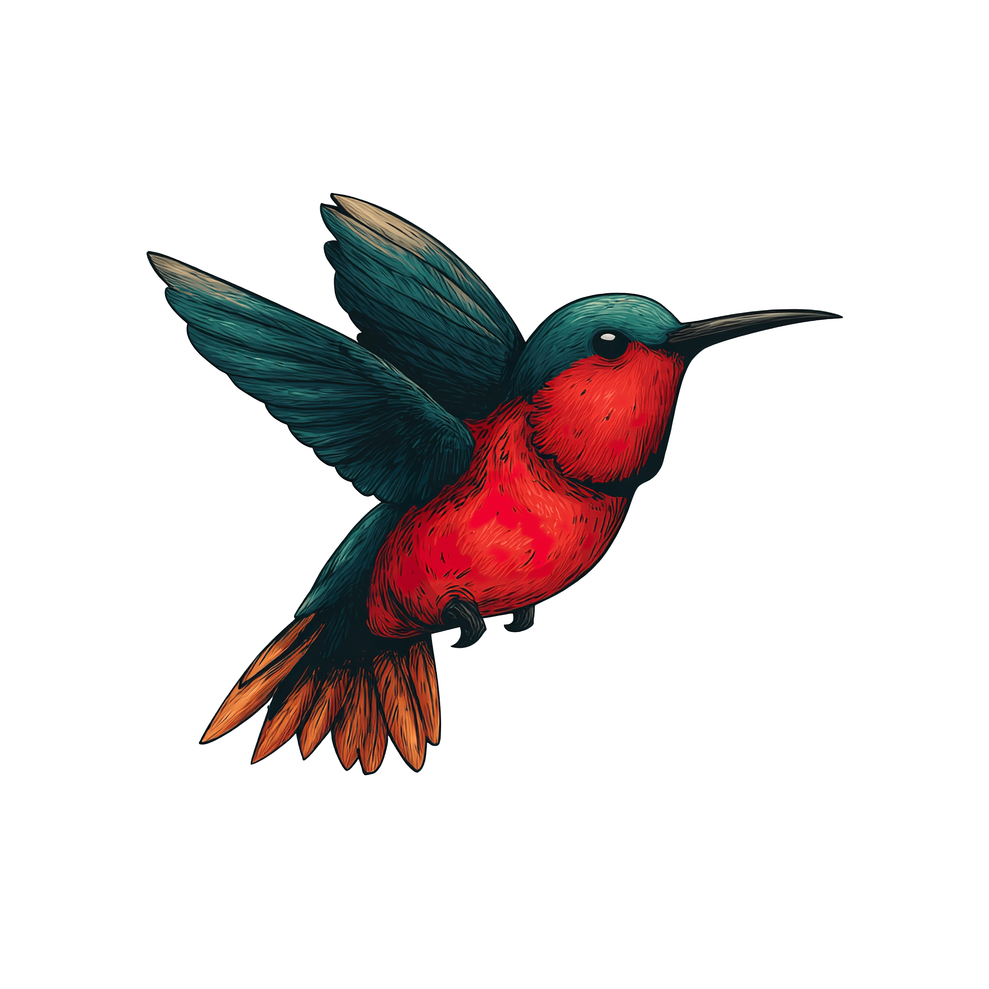 A colorful illustration of a hummingbird with detailed feathers, mid-flight. The bird features a striking red and teal color pattern, with a long beak and spread wings. This clipart image captures the elegant form of a hummingbird in motion, emphasizing intricate plumage details. Ideal for use in wildlife presentations, educational materials, or nature-themed designs. The composition focuses on the dynamic pose and vivid appearance of this bird species.