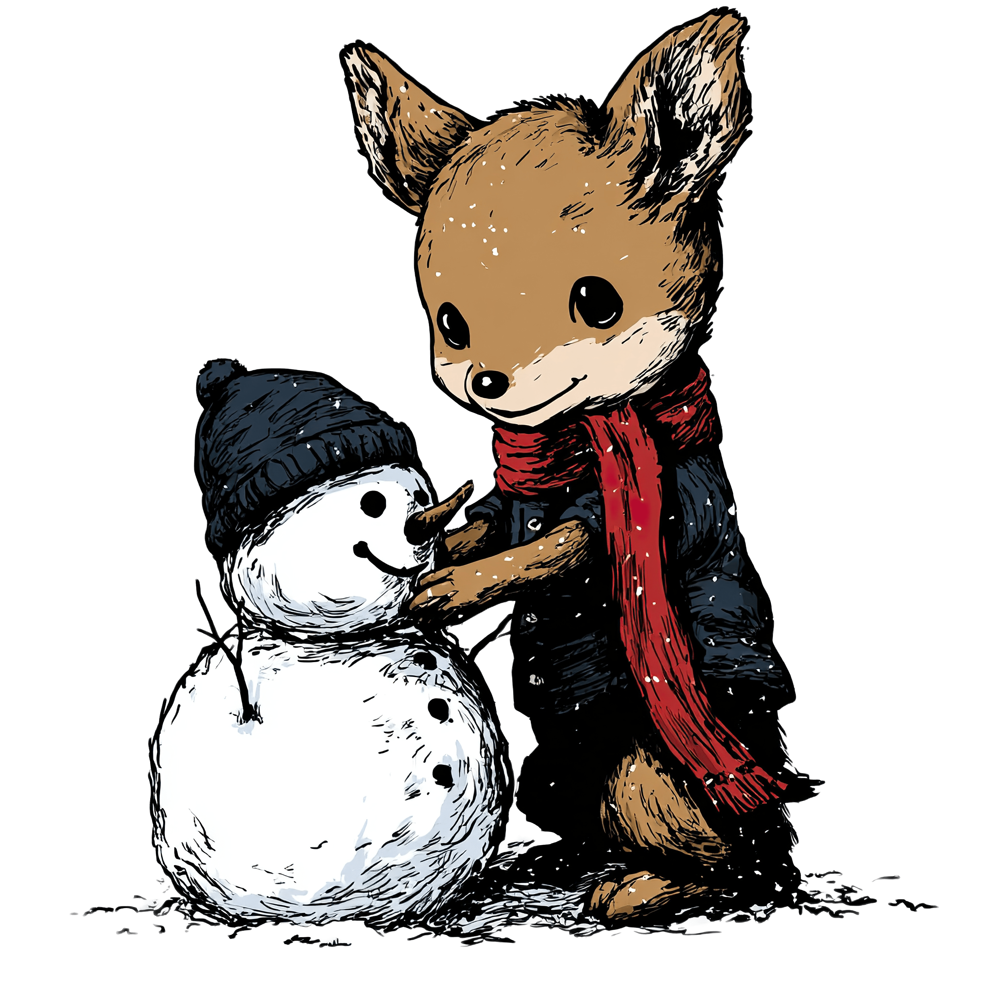 Fox with a scarf and coat stands beside a small snowman wearing a beanie. The fox is depicted with upright ears, a round face, and a brown coat, engaging in the winter activity. The snowman's simple features include coal eyes and a carrot nose, adding to the wintry theme. The style is sketch-like with textured lines and limited color palette focusing on red, brown, white, and black elements.