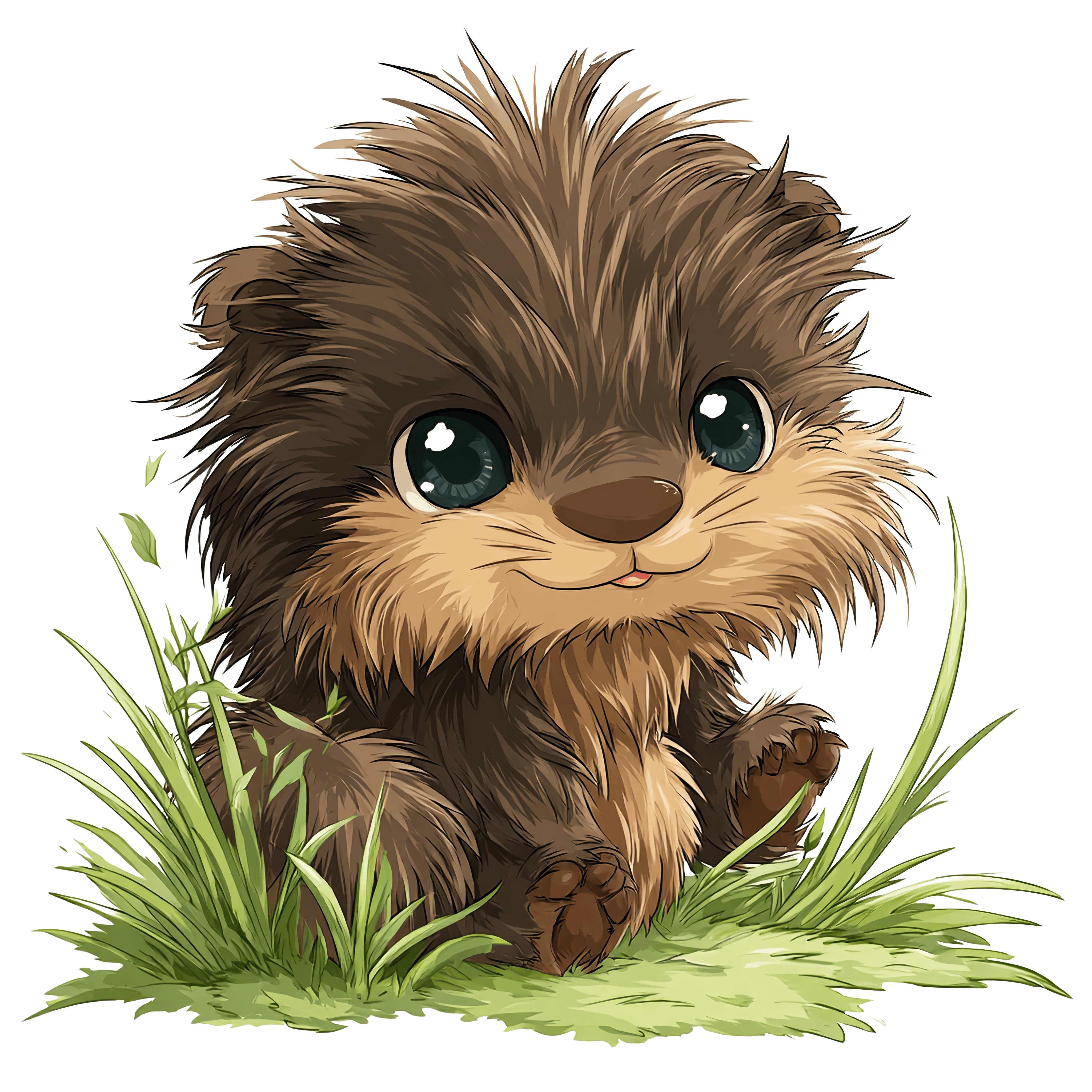 Furry otter with dark brown and beige fur, sitting amidst grass. The animal's large eyes and detailed fur texture highlight its natural features. With detailed illustration work, the scene captures the otter's distinctive characteristics, offering a sense of its habitat. The artistic style presents a playful encounter, suitable for educational or decorative purposes.
