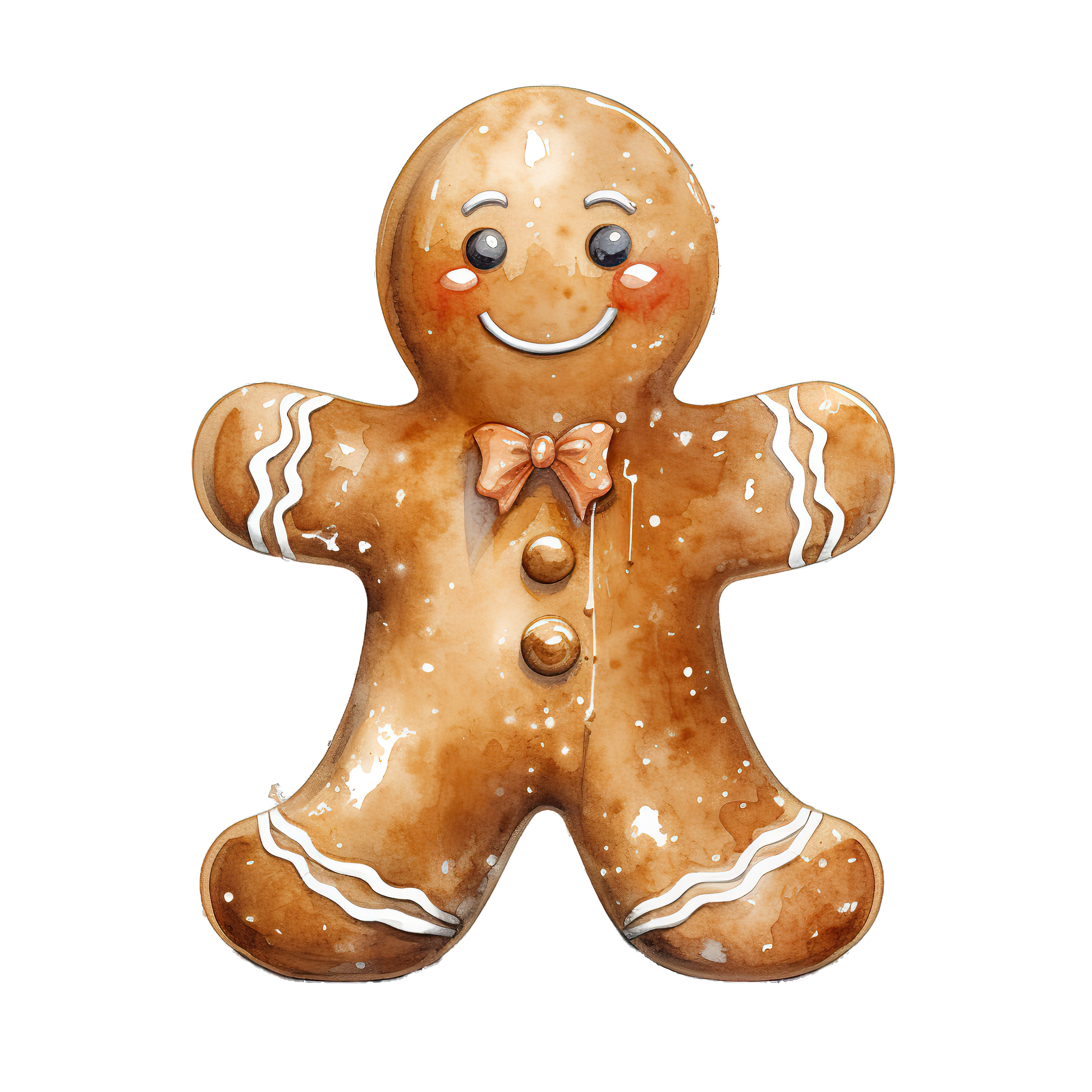 Gingerbread Man Cookie with White Icing and Bow Tie Illustration Gingerbread man cookie with white icing details and a bow tie.Download PNG ▼Download JPG ▼Related posts:Intricate Blue Watercolor Snowflake Design on Black BackgroundFestive bird with orange feathers and a red Santa hatTwo ripe tomatoes on a vine with green leavesWatercolor Poinsettia Illustration with Red and Green LeavesTwo Fresh Fennel Bulbs with Green Stalks and LeavesElegant Pink And Gold Butterfly Featuring Intricate WingWatercolor Blueberries and Green Leaves ArtistryGoldfish Wearing a Wizard Hat Clipart IllustrationOrange Cartoon Guinea Pig With Black OutlineYoung Boy Wearing Royal Costume with Crown and CapeWatercolor Green Plant with Lush Leaves on BlackWild Rose Branch with Pink Blooms and Green Leaves Illustration