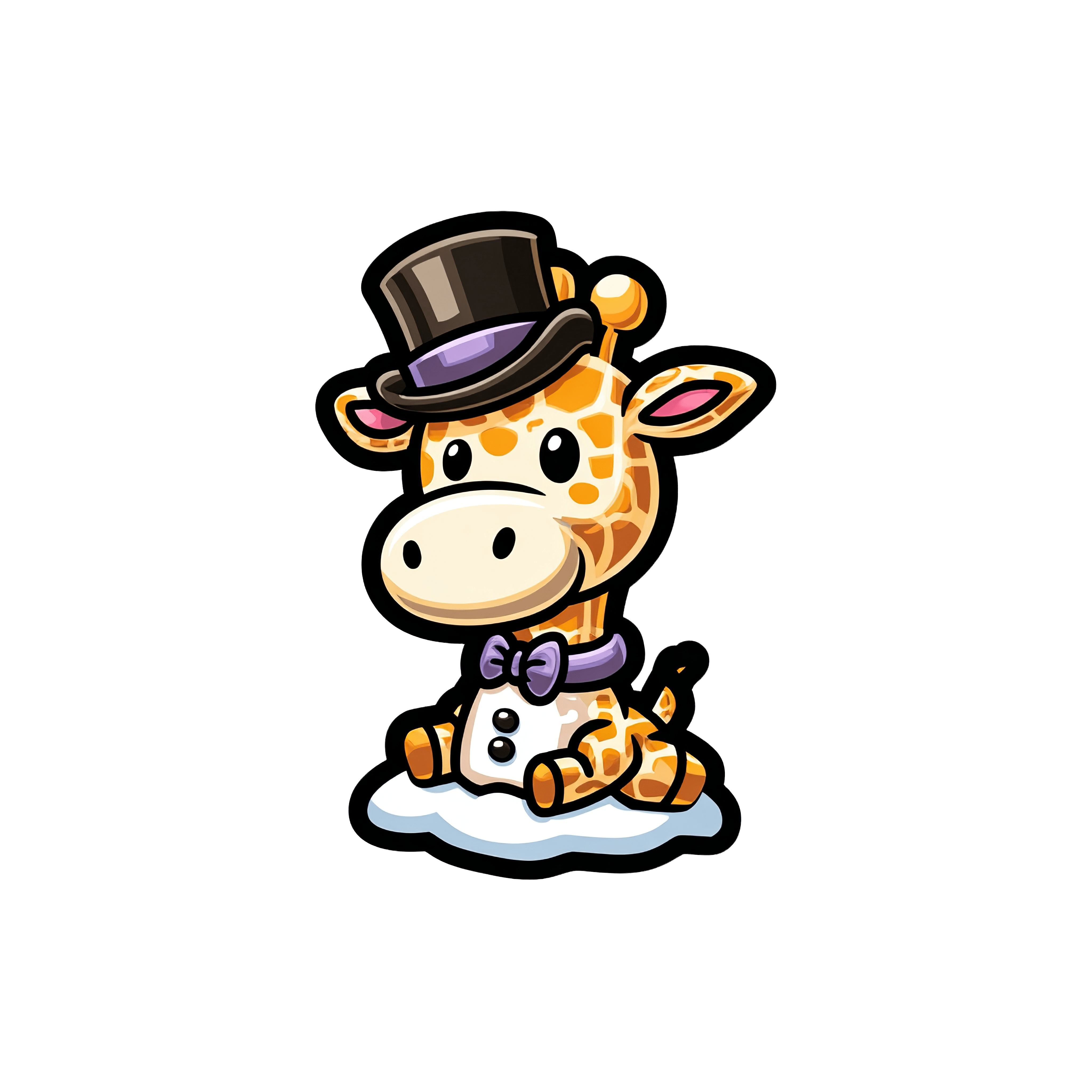 Illustration of a giraffe sitting on a cloud, wearing a black top hat and a purple bow tie. The giraffe is depicted in a cartoon style with a snowman-like outfit featuring buttons on its front. The image is colorful and designed as a vector art, suitable for various creative and educational projects related to animals and nature themes.