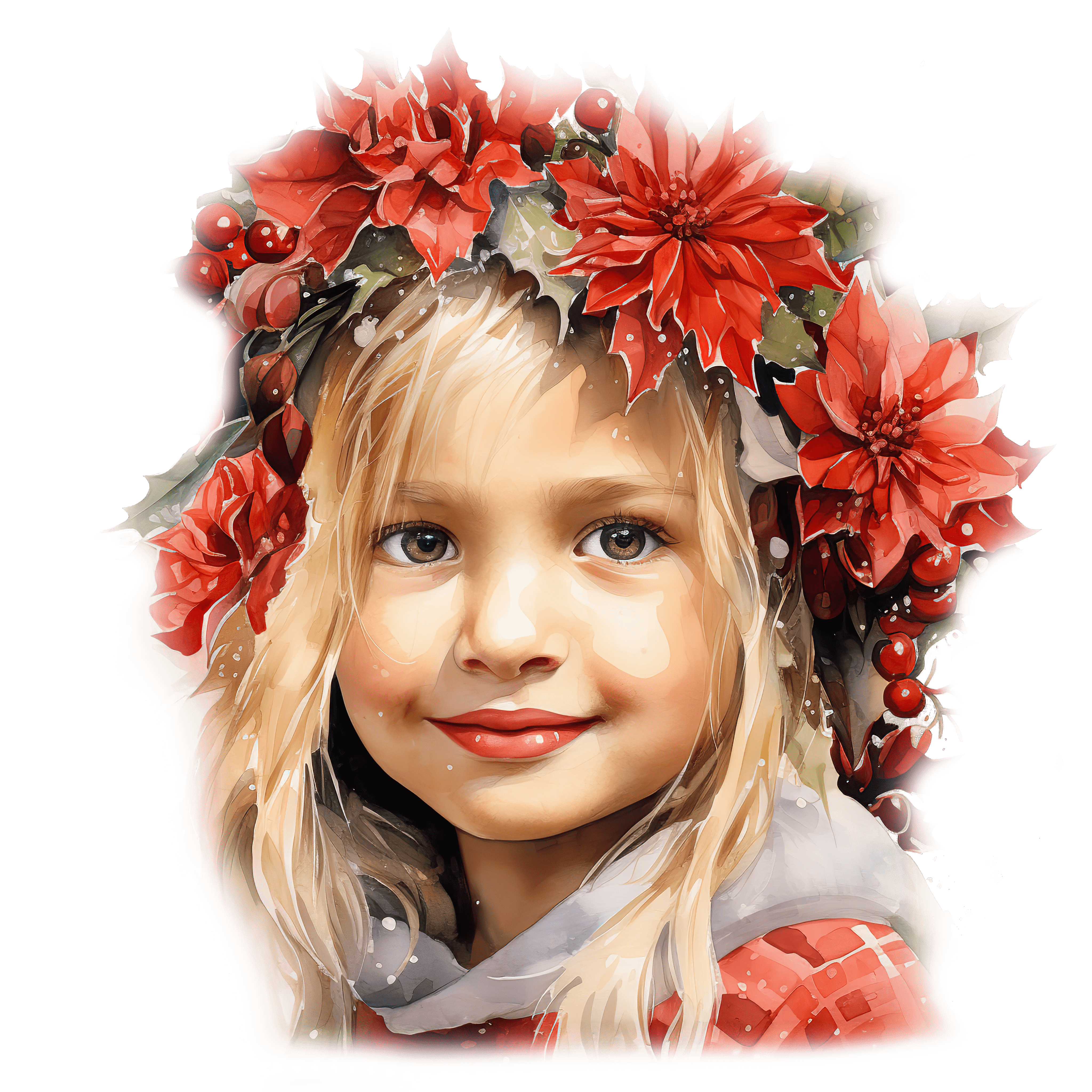 Girl with Festive Christmas Floral Headpiece and Red Flowers Girl wearing a holiday-themed headpiece adorned with red poinsettias and berries.Download PNG ▼Download JPG ▼Related posts:Gold Christmas Ornament with Holly and Red Berries IllustrationBunch of Yellow Grapes on a Vine ClipartColorful Macaw Parrot Clipart on BranchYoung Child With Festive Holiday Wreath of Flowers and PineconesWatercolor Kiwi Slices with Detailed Seeds and TextureAssorted Colorful Fruits Including Apples and Citrus berries clipart vector art printableRetro Styled Woman in Red Shirt with Green Neck BowTextured Golden Heart Symbol with Rough Edges on BlackBrown Ceramic Mug of Hot Chocolate with Marshmallows IllustrationMartini Glass Filled with Creamy Espresso Martini CocktailVibrant Seahorse Clipart with Gradient ColorsVibrant Watercolor Radish and Leaves