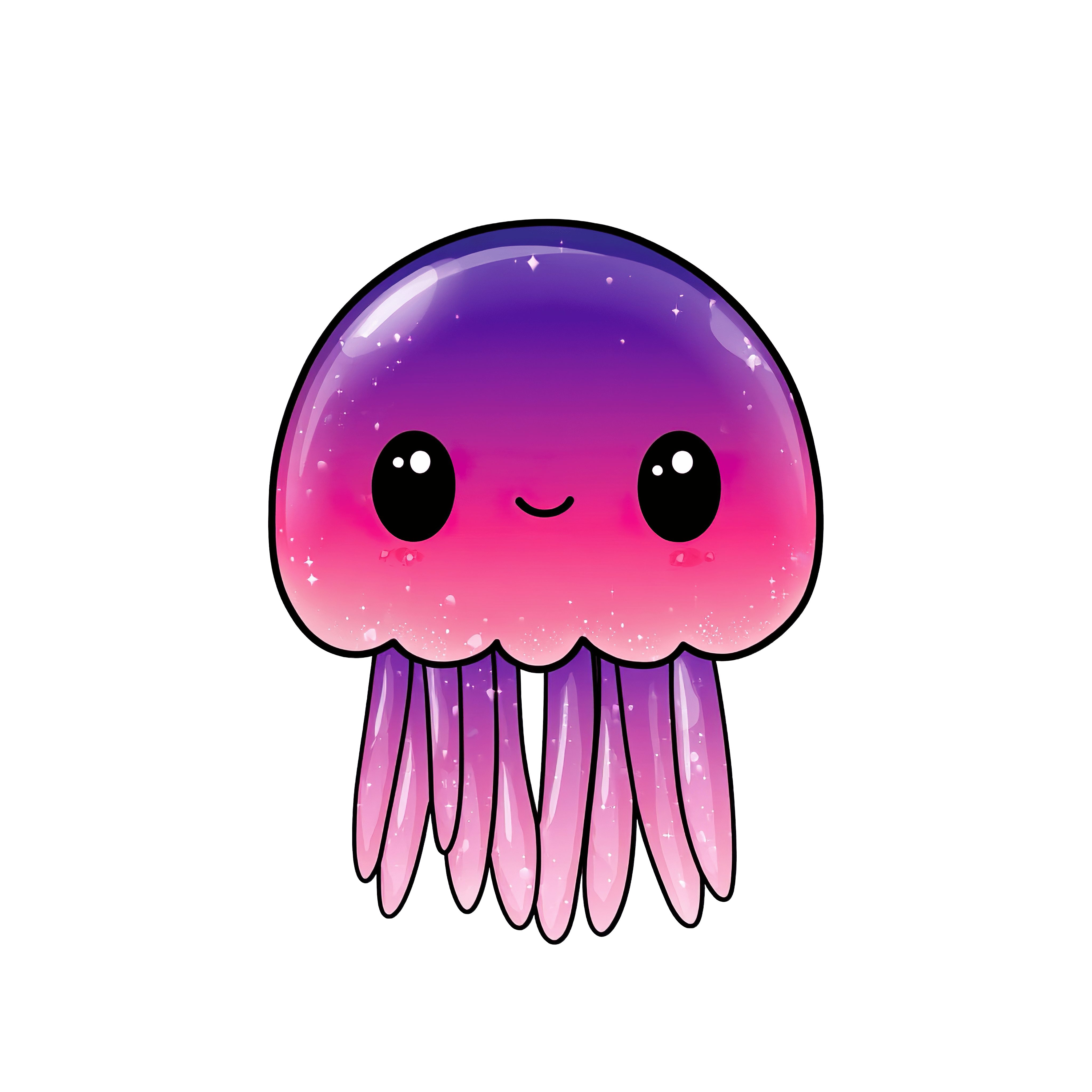 This is a vibrant clipart of a jellyfish featuring a gradient of purple and pink. The jellyfish is designed with simple, smooth lines and stylized tentacles. It is depicted in a cartoon style, with bold outlines and shiny highlights. The illustration presents a clean, digital representation suitable for educational materials or creative projects.