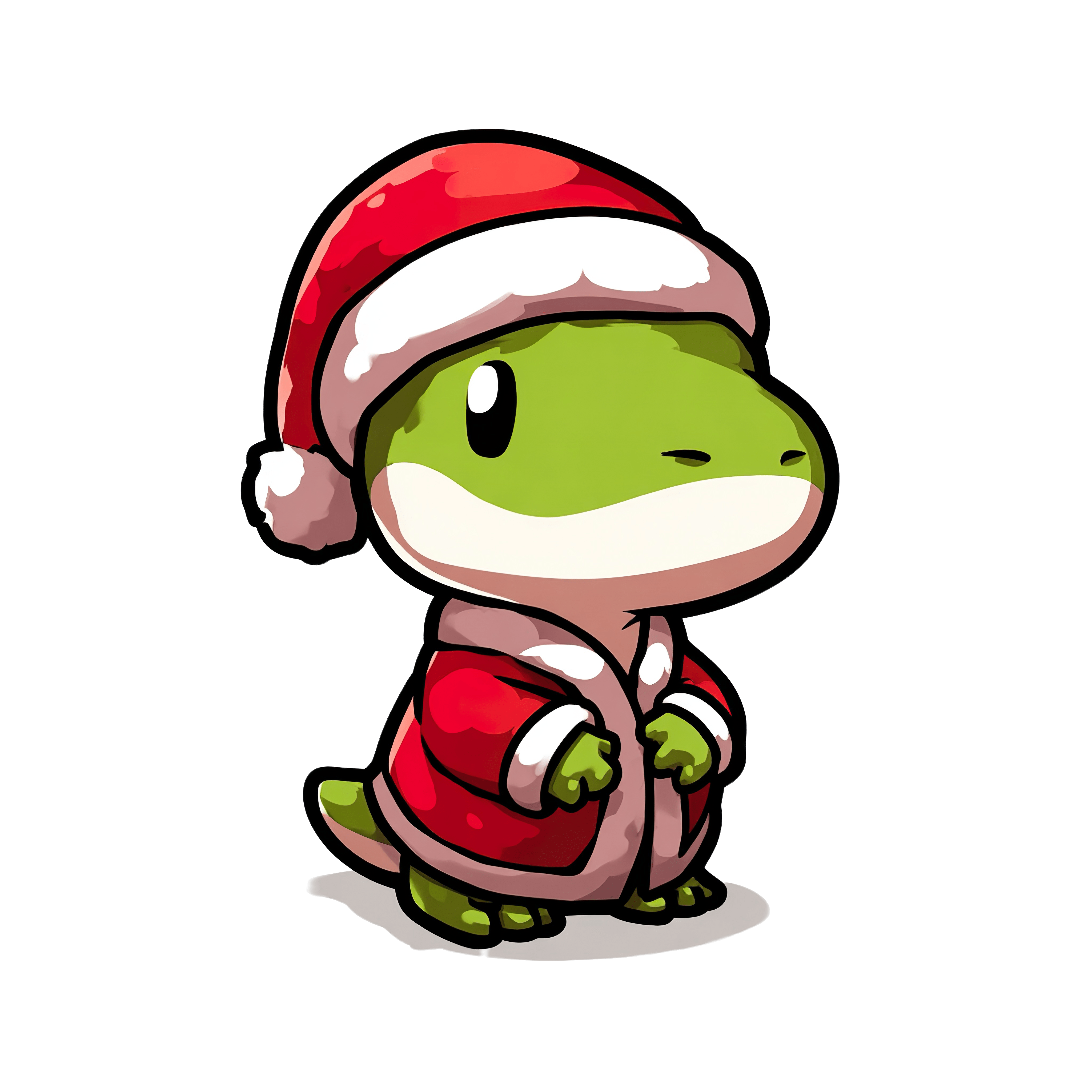 A green dinosaur is depicted wearing a Santa hat and a red coat with white trim. The image is a simple cartoon-style illustration, featuring bold outlines and a festive holiday theme. This clipart is suitable for Christmas-themed projects, greeting cards, or decorations, offering a fun and engaging take on a traditional holiday character.