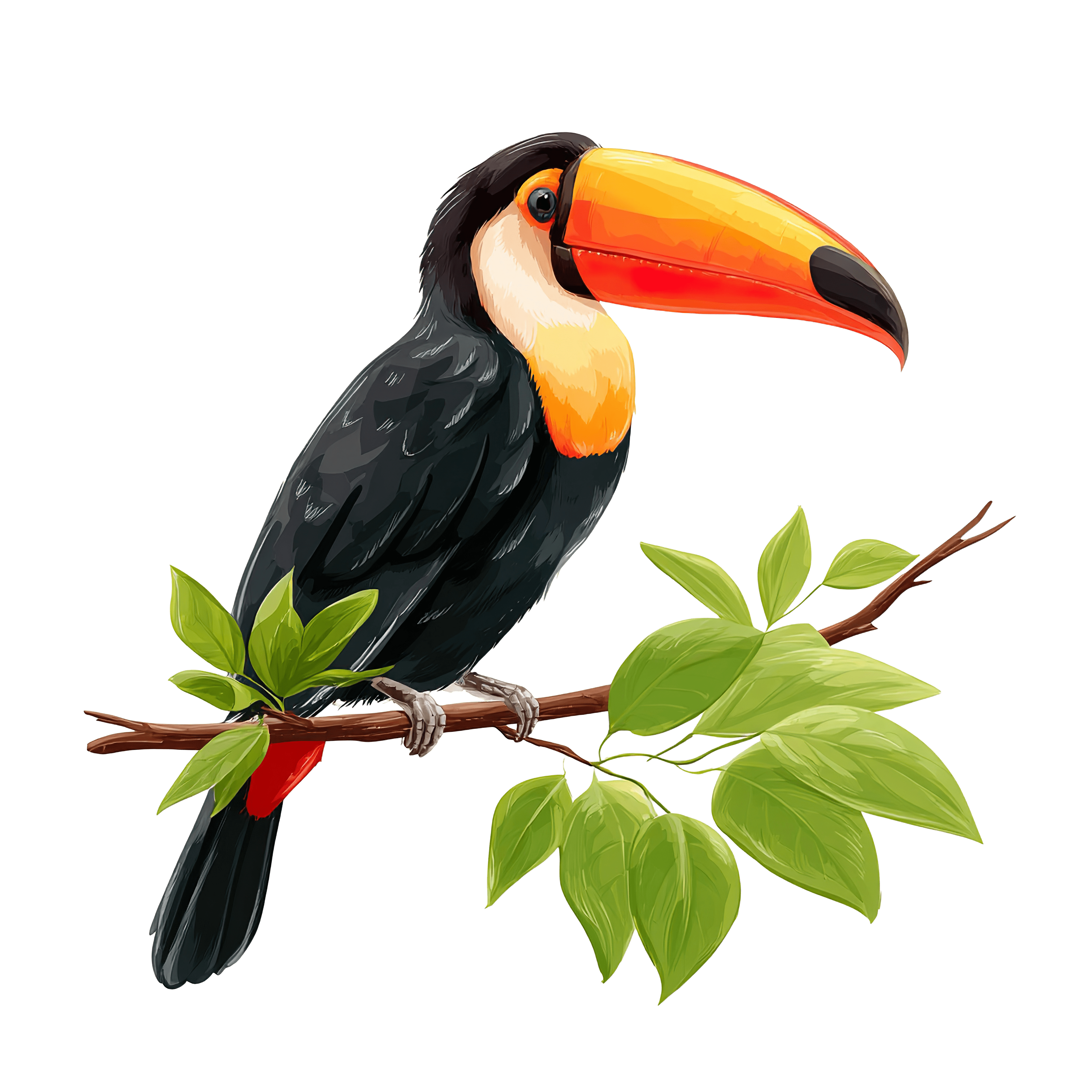 Green Leaves Toucan Branch Clipart Illustrated toucan perched on a branch with green leaves.Download PNG ▼Download JPG ▼Related posts:Open Book with Crescent Moon Above on a Dark BackgroundBlue Galaxy-Themed Gift Box with Shiny Ribbon IllustrationStained Glass Butterfly With Vibrant Multicolored WingsStar-Shaped Gingerbread Cookie with Ornate Icing DesignColorful striped lizard clipart vector illustrationWatercolor Illustration of a Succulent in a Terracotta PotCartoon bat with smiling expression and pink earsDecorated Christmas Tree with Red Baubles and Gift BoxesSkunk with Black and Pink Fur IllustrationGreen Gift Box with Large Golden Ribbon and BowGingerbread Man Cookie with White Icing and Bow Tie IllustrationOrange Sunflowers Green Leaves Clipart